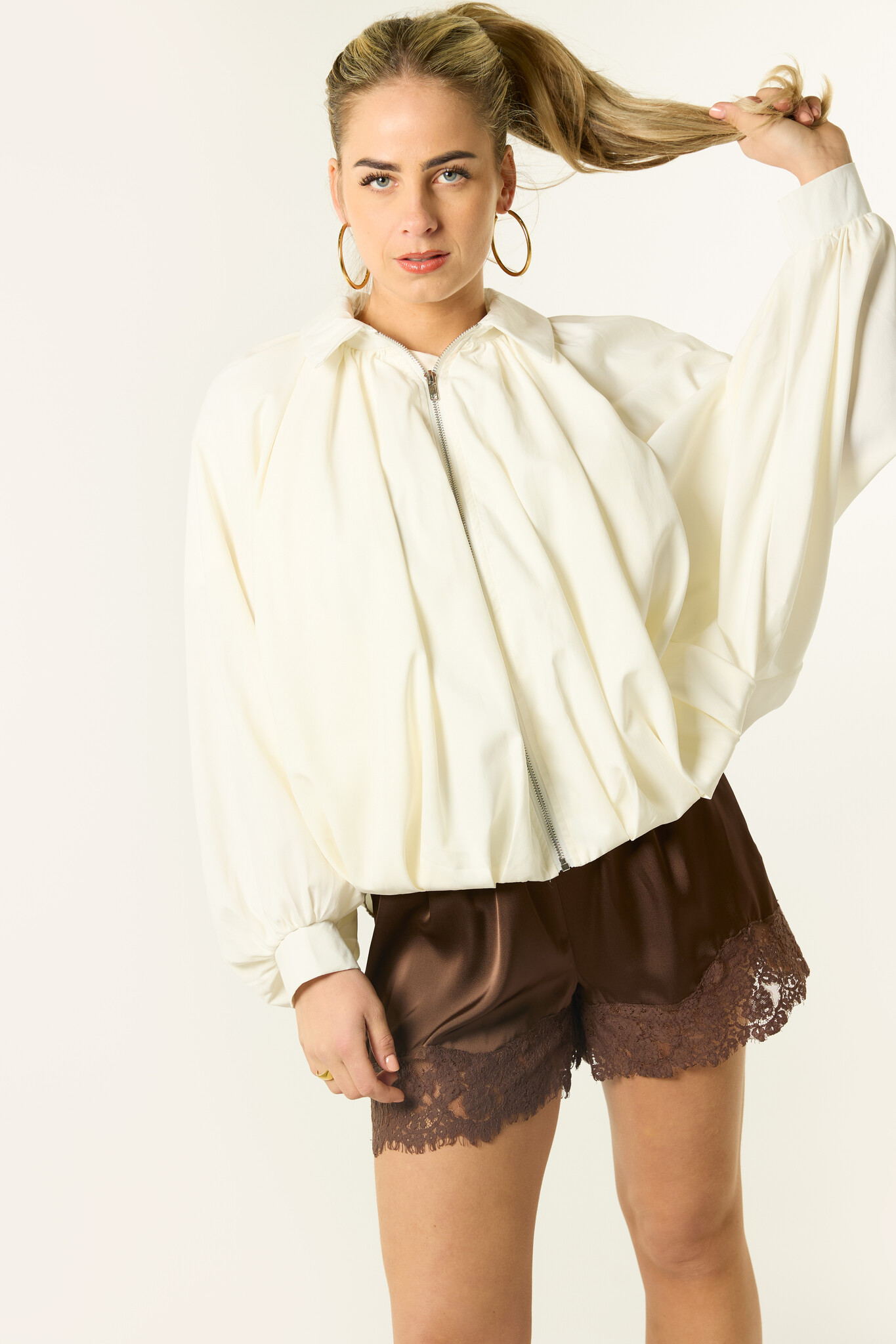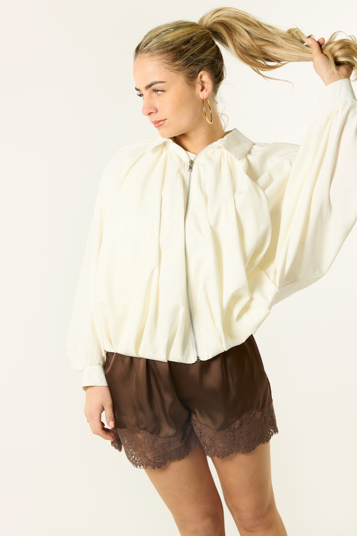 Deze bomberjas is zo’n item dat je overal overheen draagt. De jas heeft een luchtige fit, een ritssluiting en mooie wijde mouwen die zorgen voor een trendy en vrouwelijke look. De lichte kleur maakt deze tussenjas perfect voor het voorjaar en frisse zomeravonden.