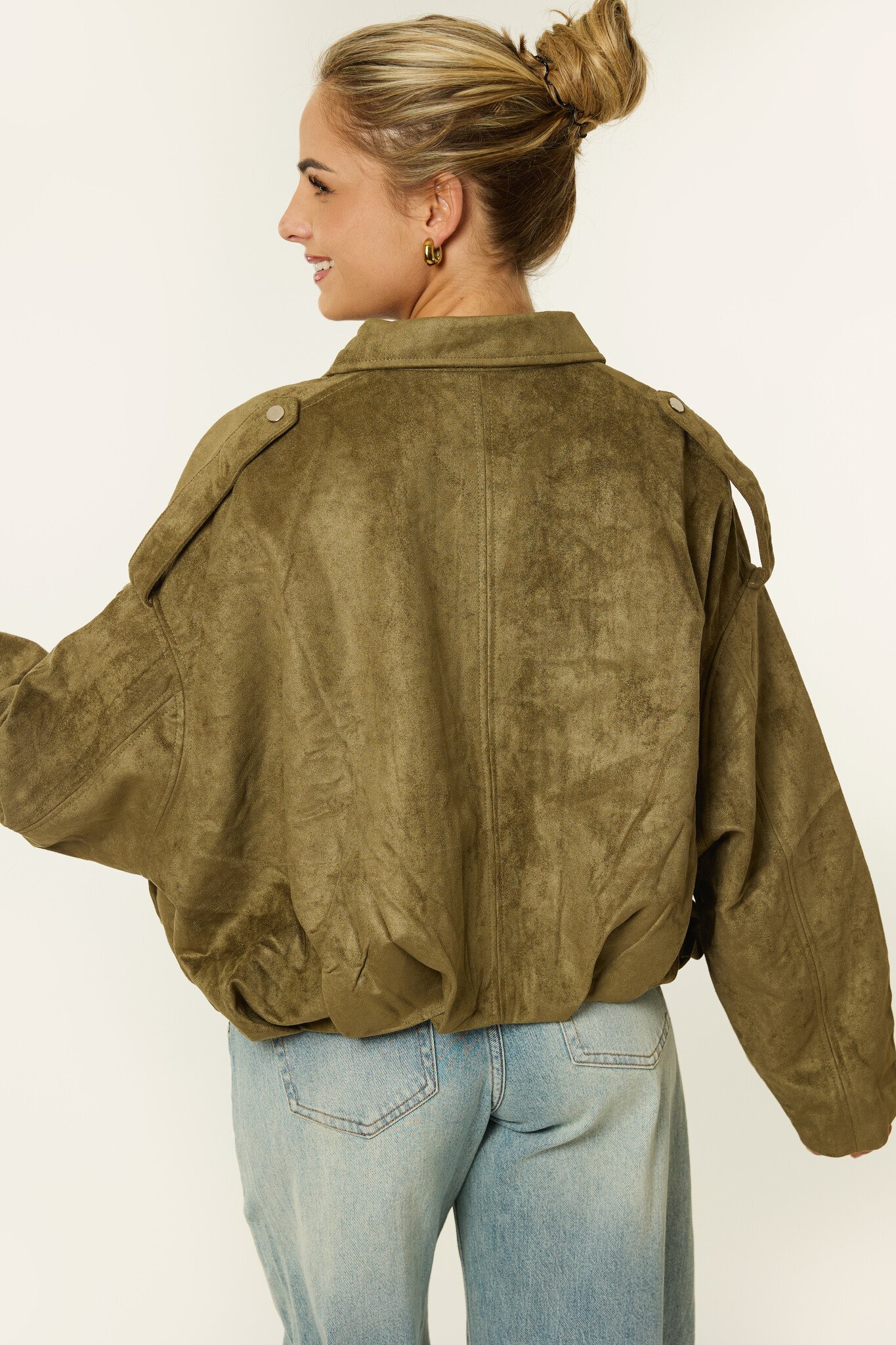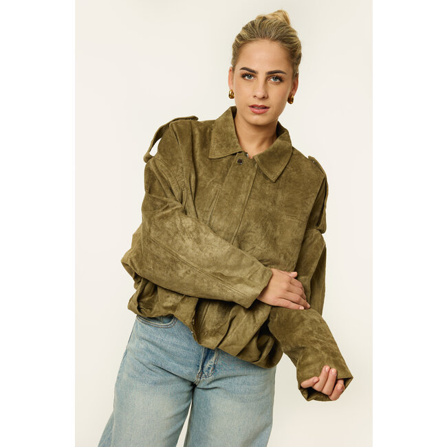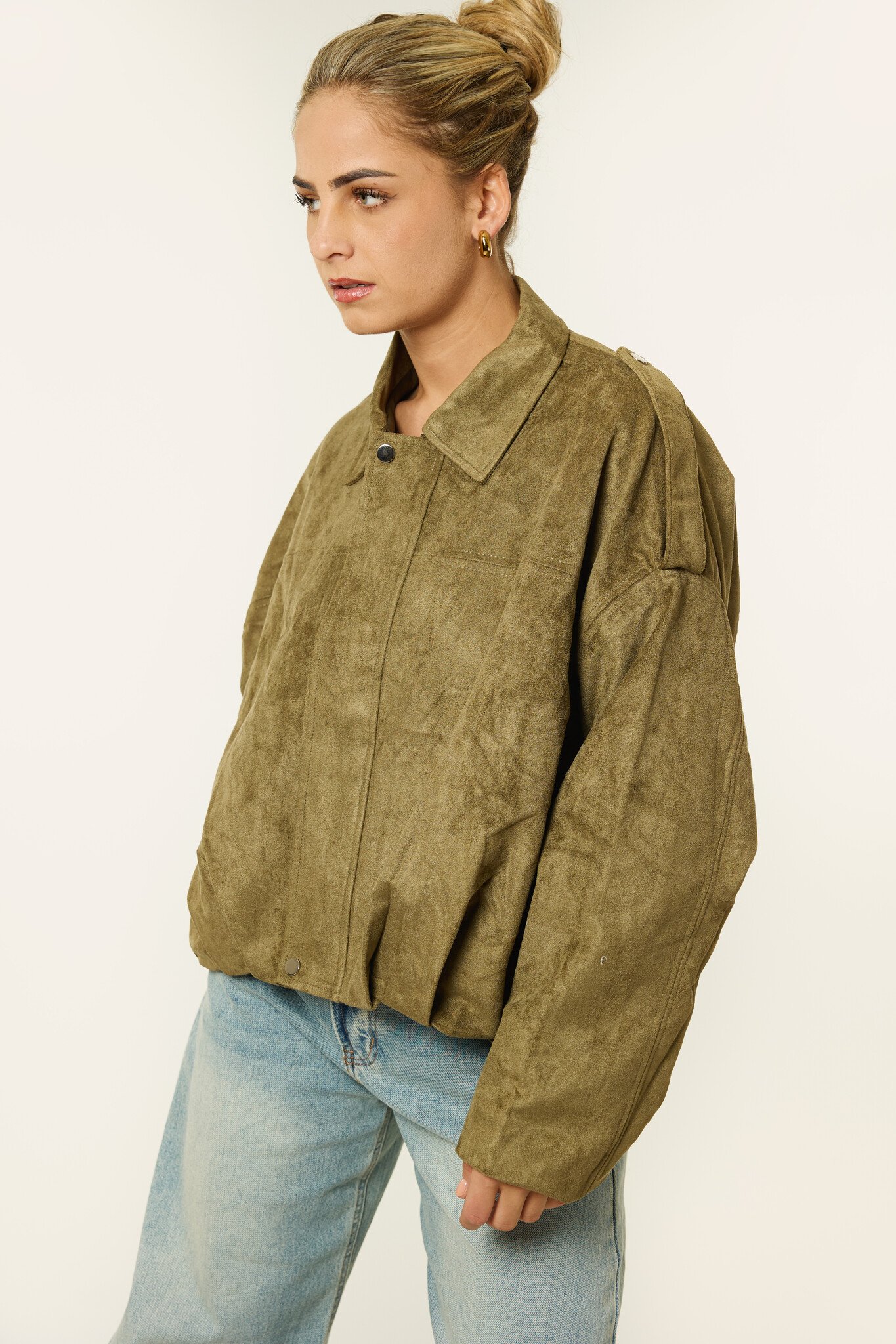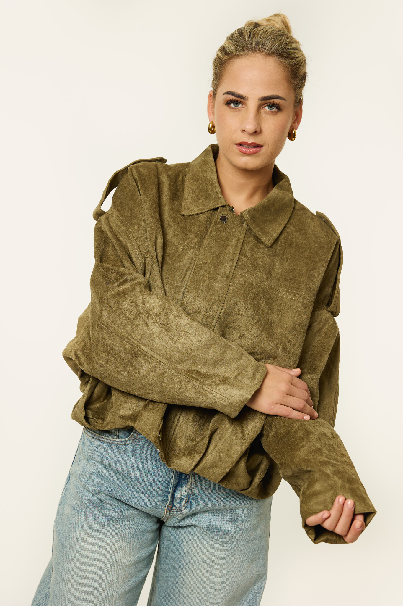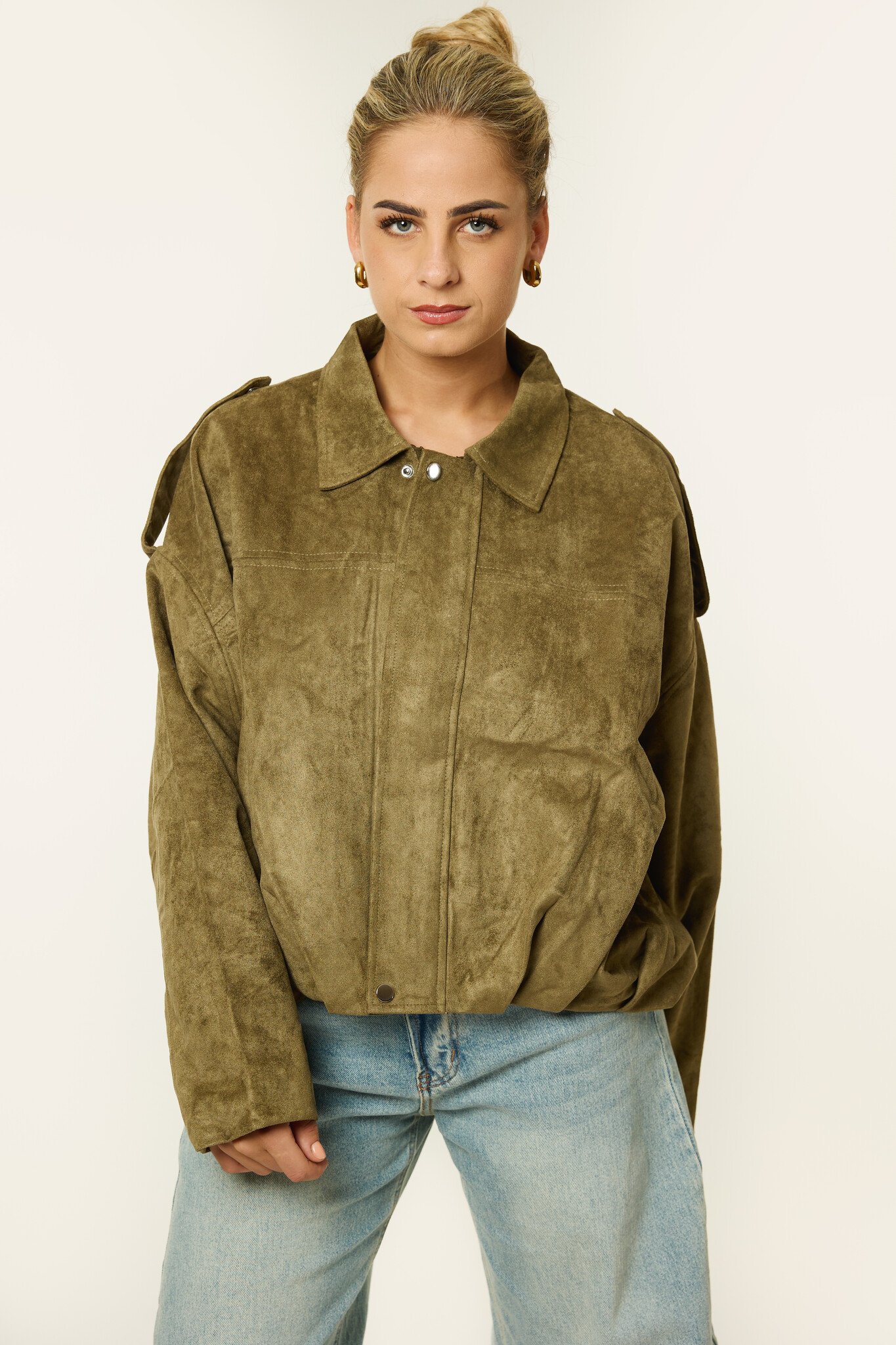 Deze groene bomberjas in suede look is een echte eye-catcher voor je najaarsgarderobe. Het herfst groene suede word echt de trend van aankomend najaar en de bomber fit zorgt voor een stoere look. Perfect als tussenjas die je makkelijk over een jeans of pantalon aan doet.