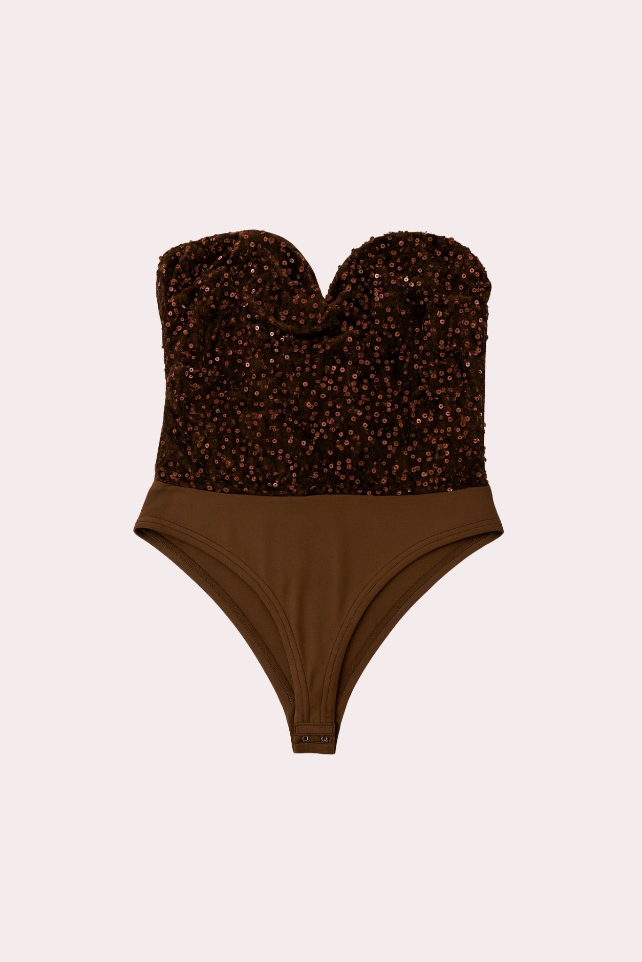 De party body die jou laat shinen! Deze bruine glitter body is volledig versierd met luxe pailletten in warme, koperachtige tinten die prachtig oplichten bij elke beweging. Door de zachte, stretchende onderkant zit de body comfortabel. De elegante sweetheart-vorm zorgt voor een super vrouwelijke look, perfect voor feestjes, diners of een night out. Combineer ’m met een pantalon voor een chique feestlook, of draag ’m met een spijkerbroek voor een casual outfit met net dat beetje extra.