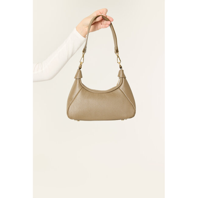 Deze taupe schoudertas is een stijlvol en praktisch accessoire voor elke dag. De tas heeft een fijne maat met een schouderhengsel en is afgewerkt met gouden details, wat zorgt voor een luxe uitstraling.