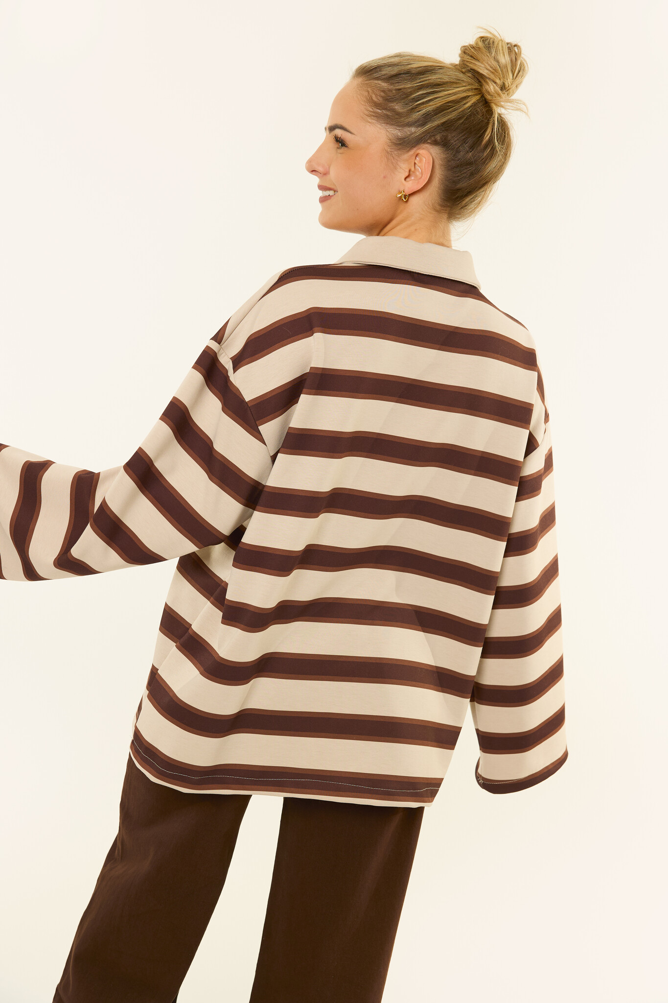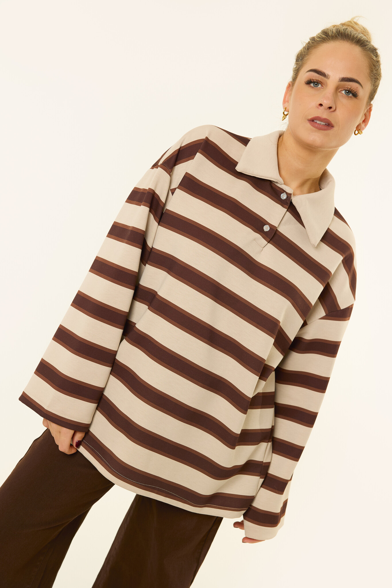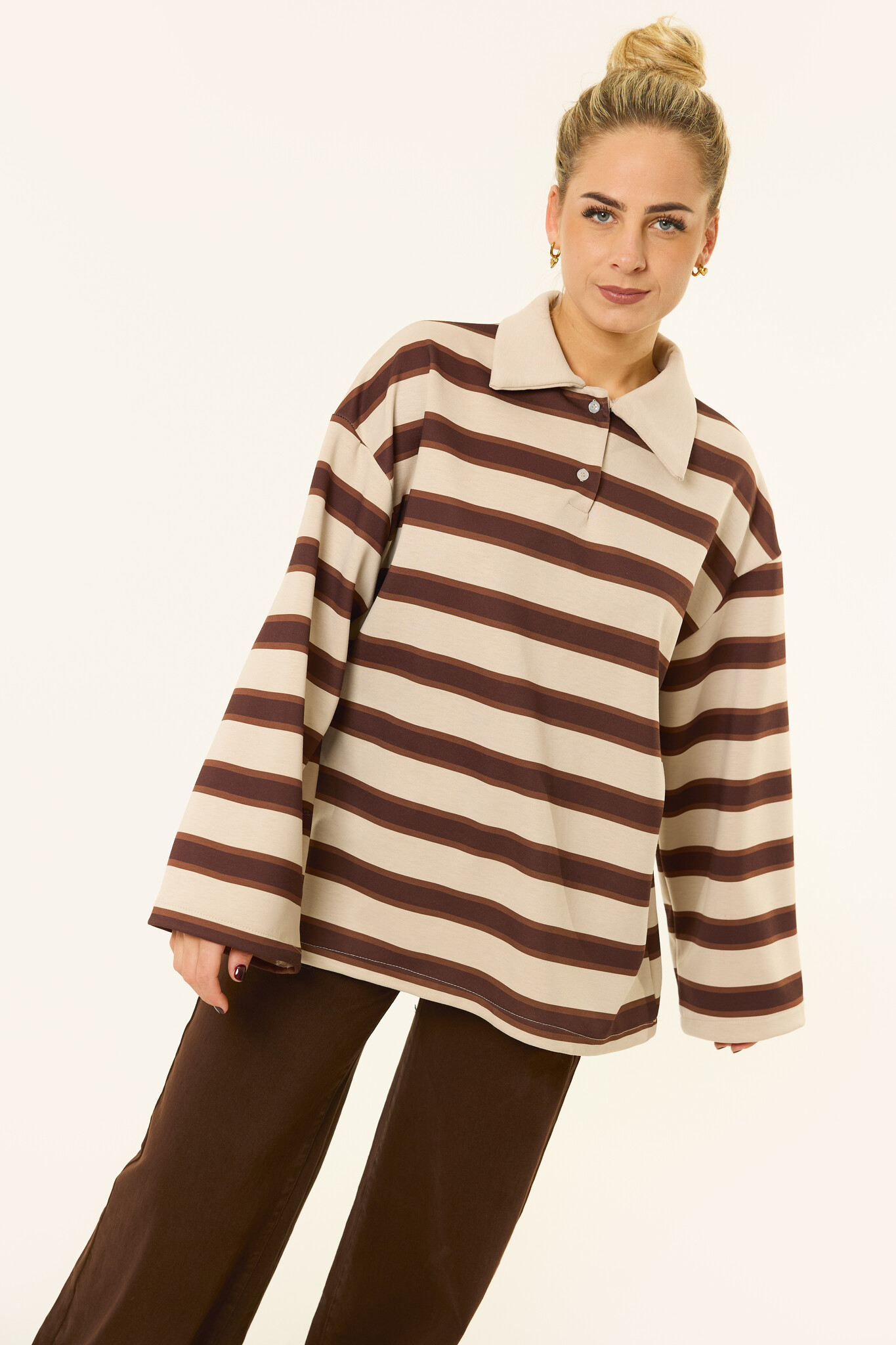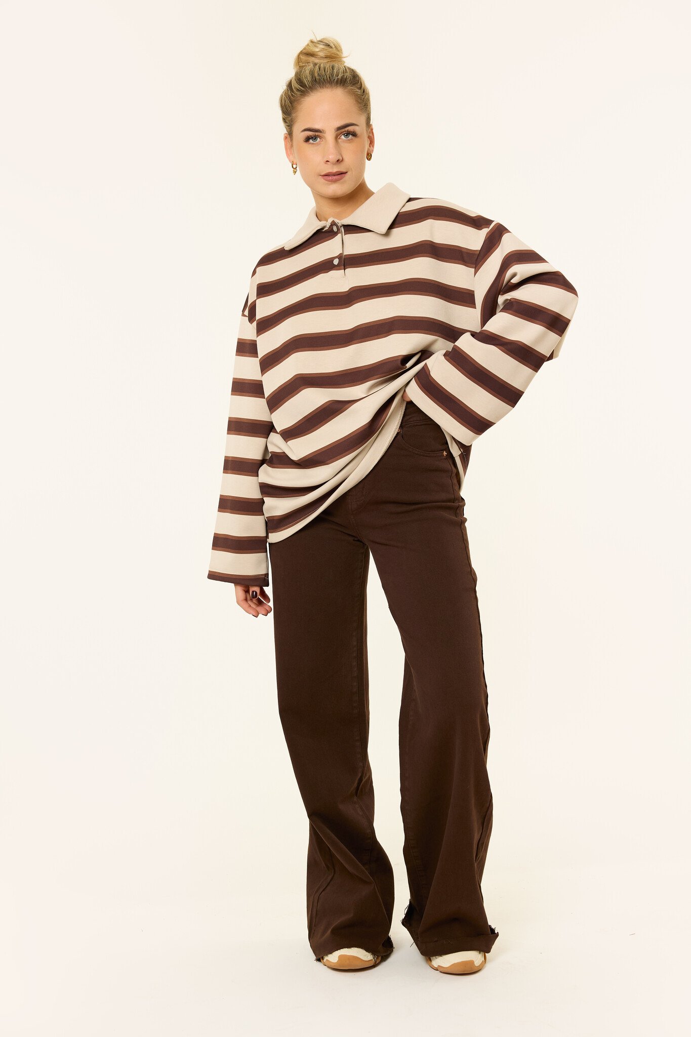 Deze beige gestreepte polo is de musthave voor het najaar! De oversized fit en de brede bruine strepen geven ‘m die perfecte balans tussen sporty en street. Supercomfortabel, zacht en makkelijk te combineren. Van een office day met jeans tot een bold look met een pantalon of rokje. Een echte essential voor het najaar.