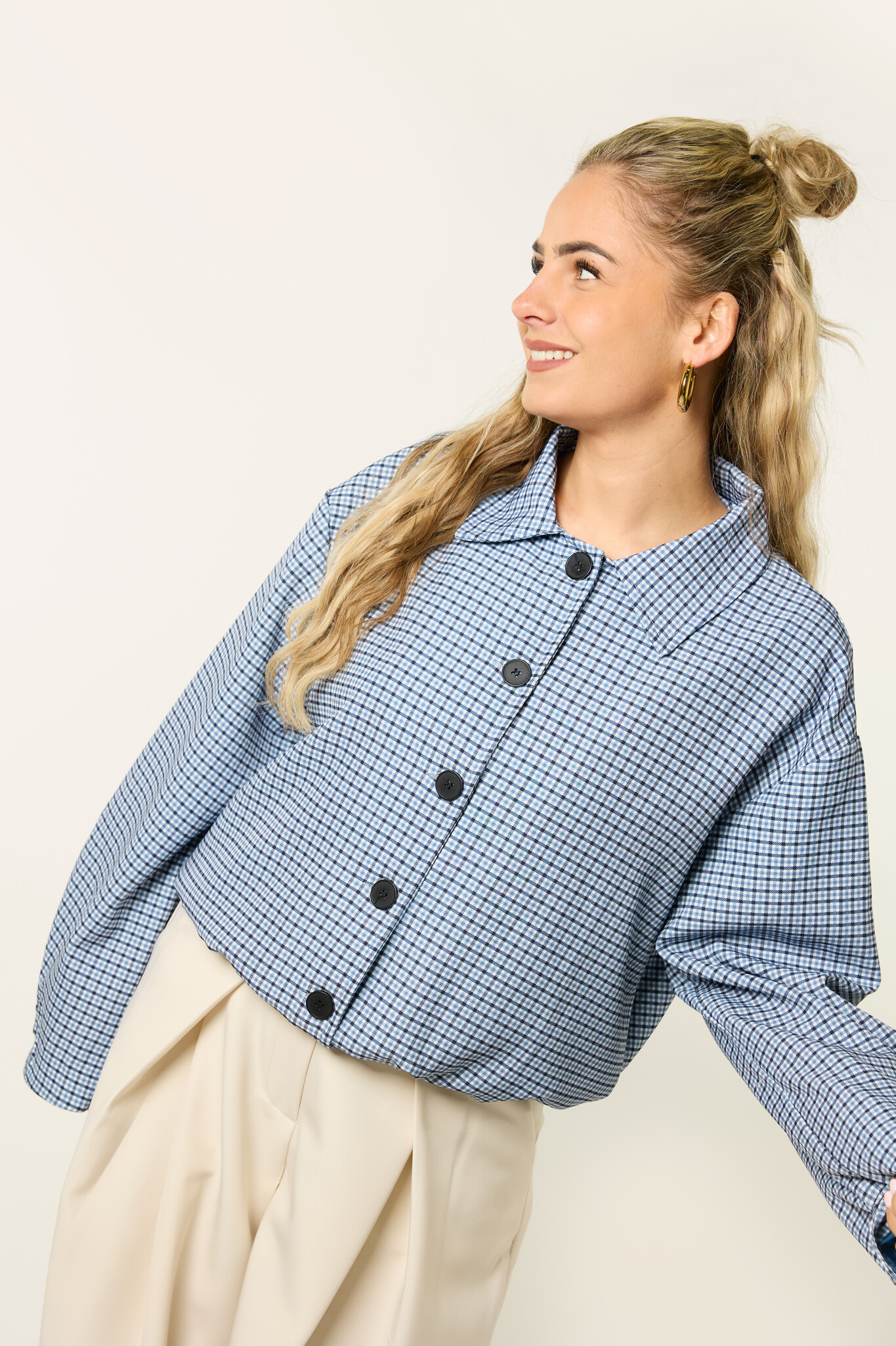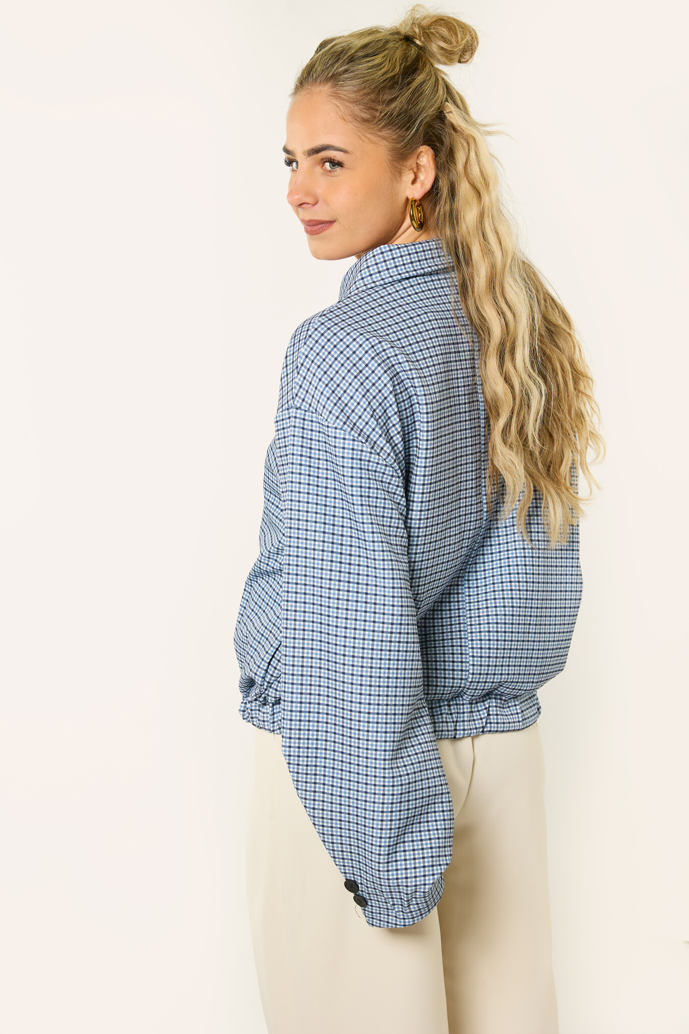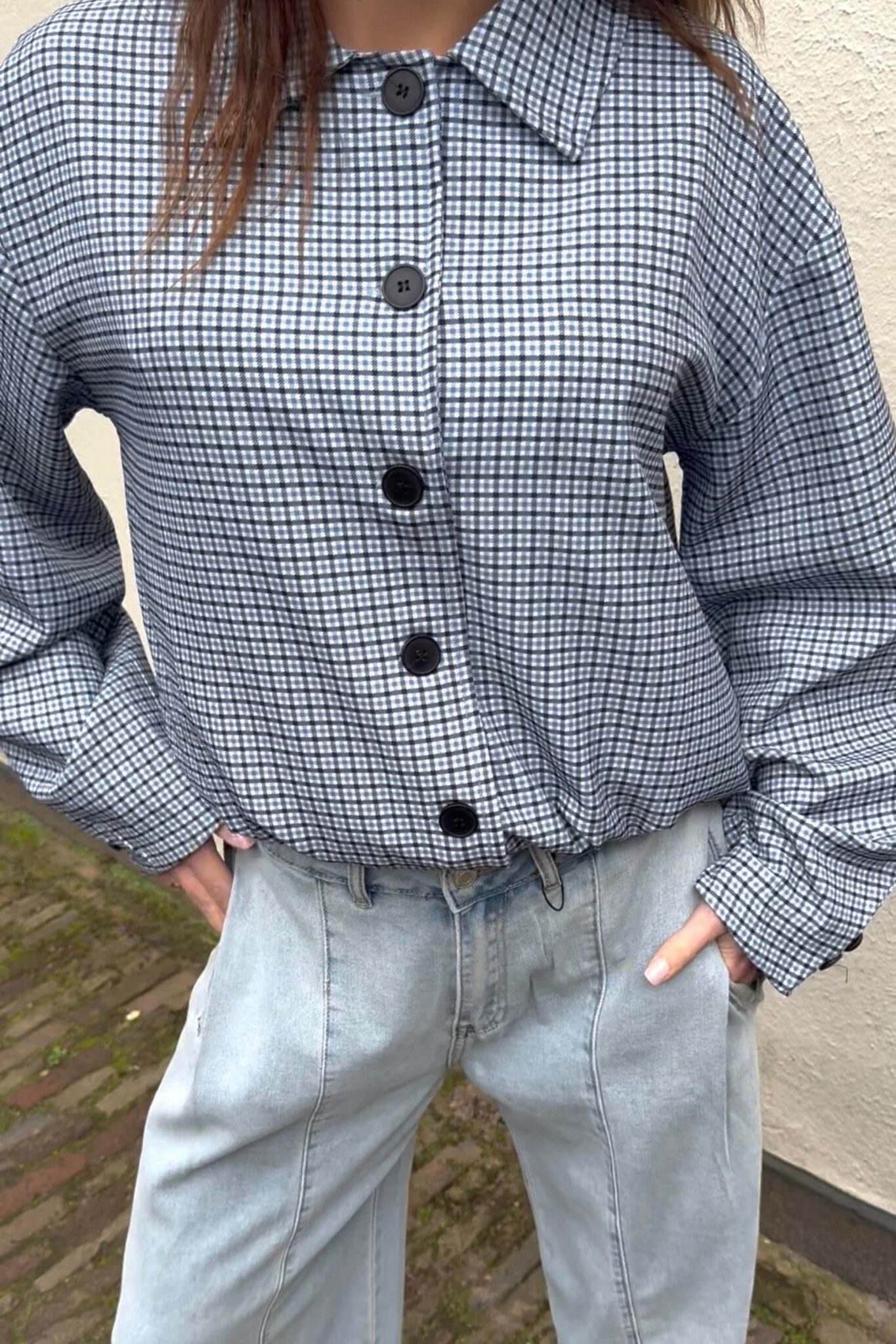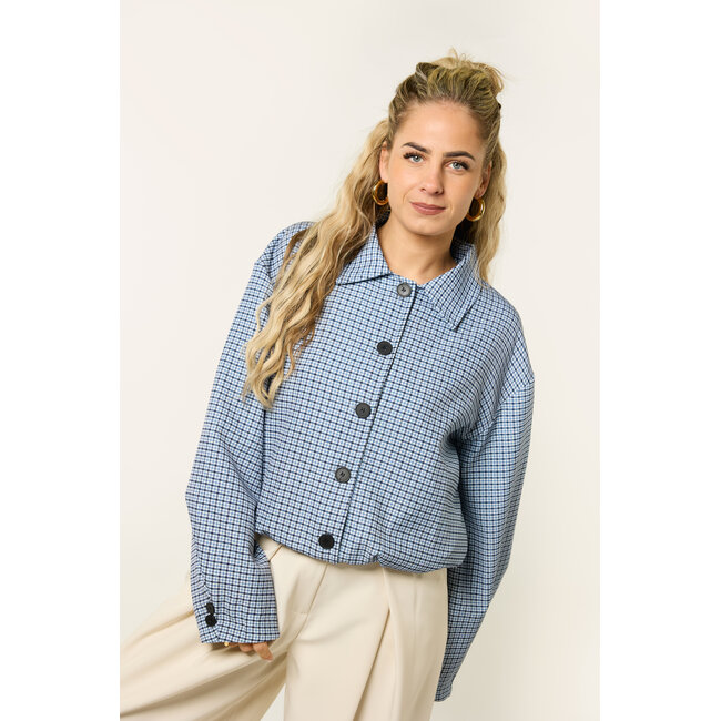 Deze denimblauwe geruite jas is een stijlvol item dat je makkelijk overal bij draagt. Het ruitjes patroon en de denimblauwe kleur geven de jas een mooie, trendy uitstraling. Het korte model met knoopsluiting maakt deze jas perfect als tussenjas.