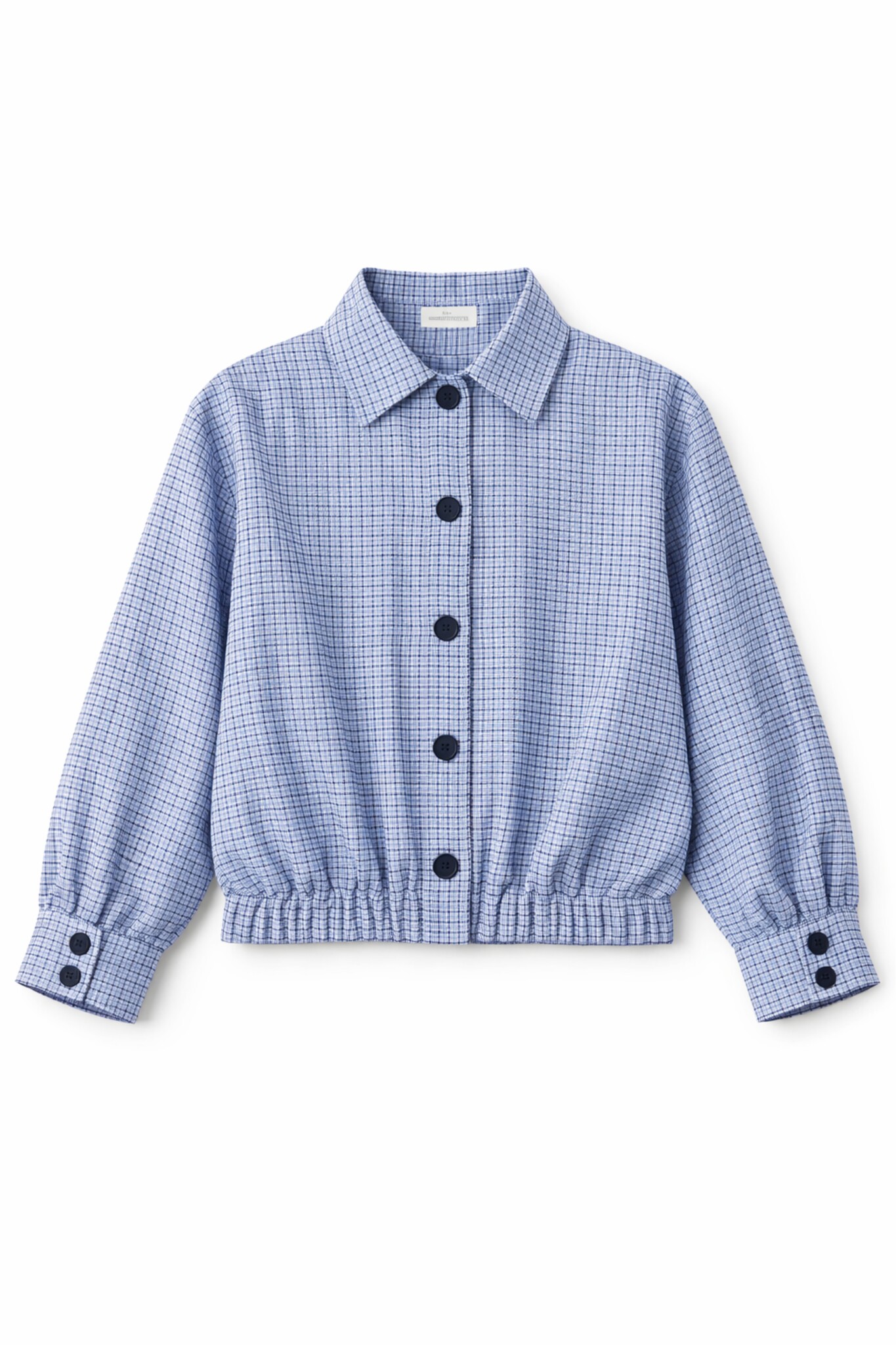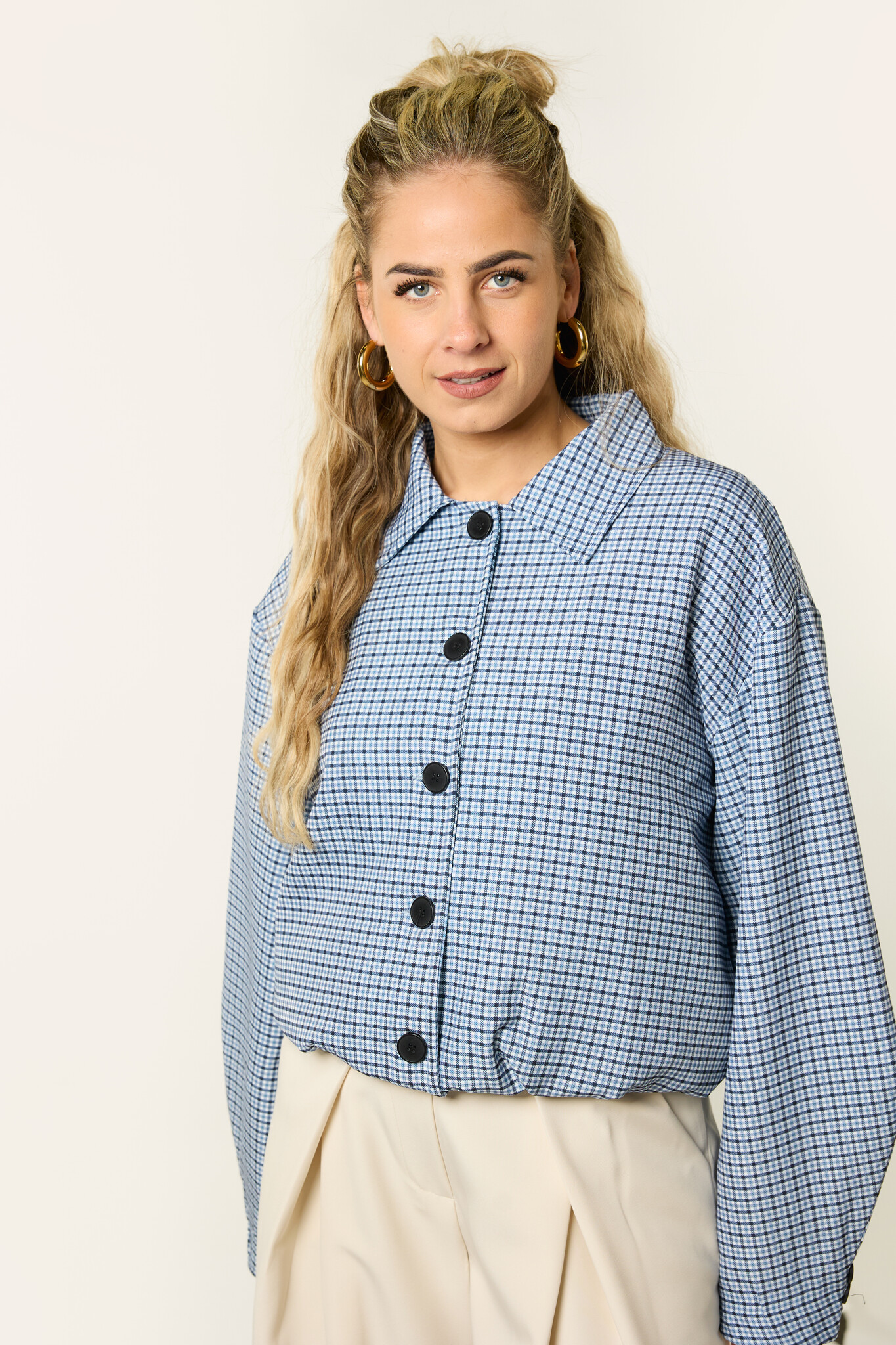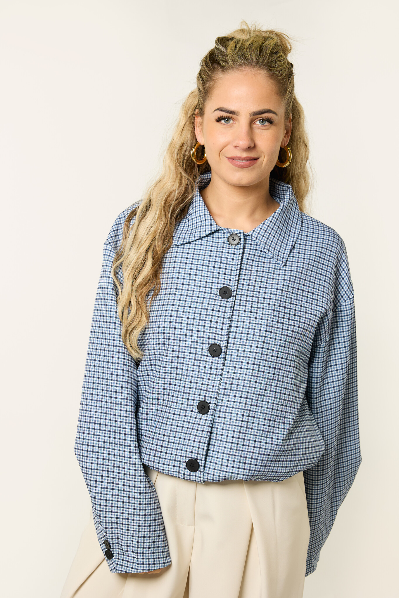 Deze denimblauwe geruite jas is een stijlvol item dat je makkelijk overal bij draagt. Het ruitjes patroon en de denimblauwe kleur geven de jas een mooie, trendy uitstraling. Het korte model met knoopsluiting maakt deze jas perfect als tussenjas.
