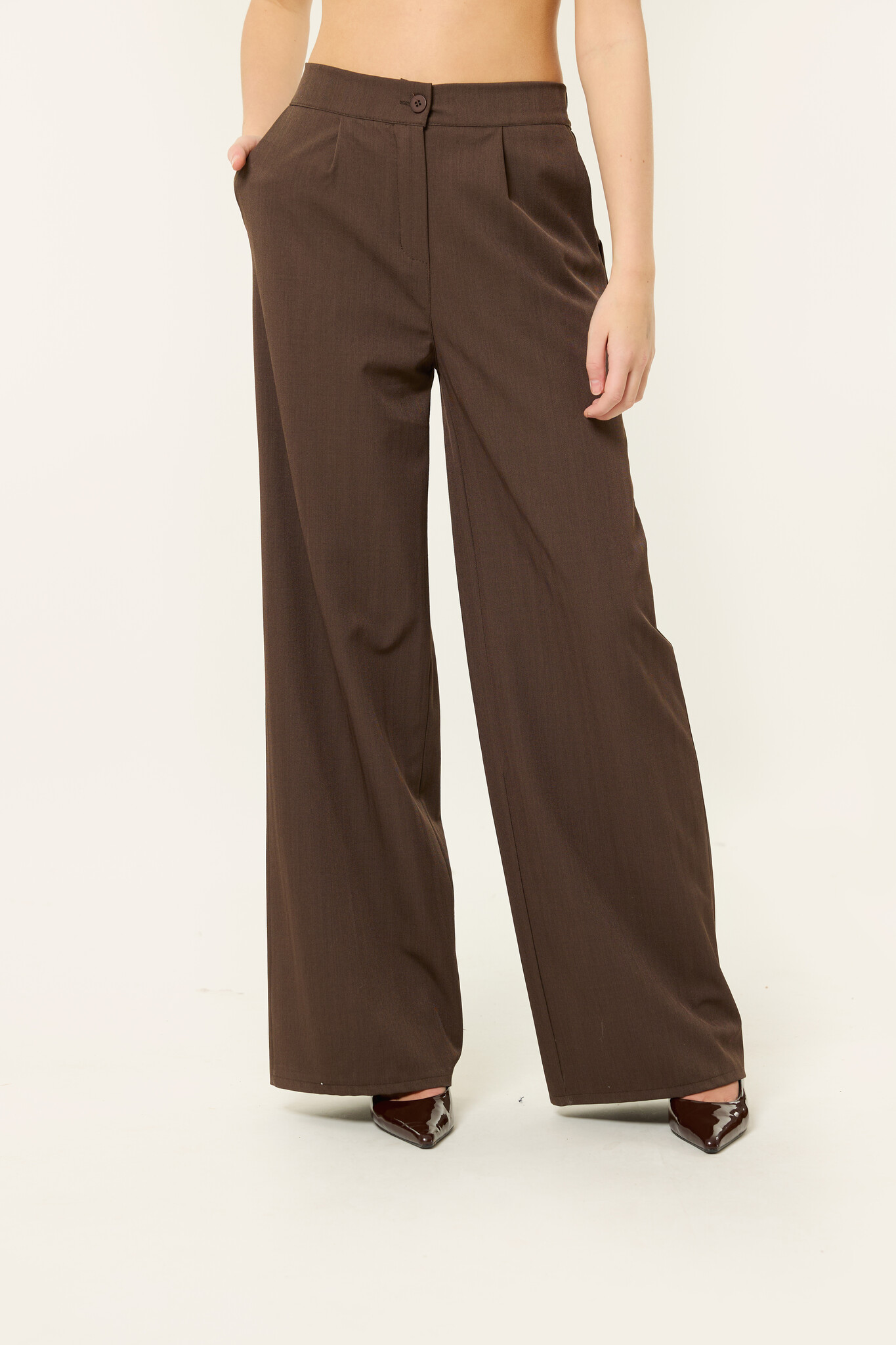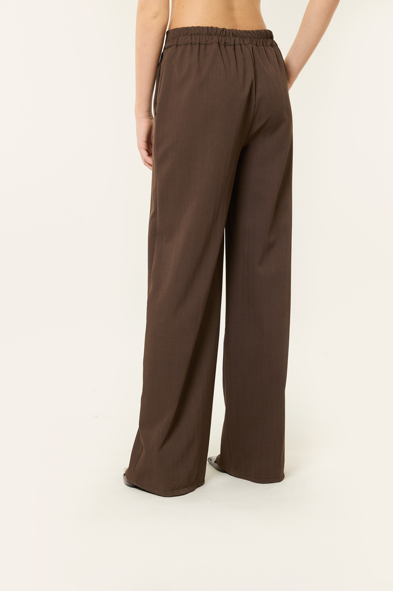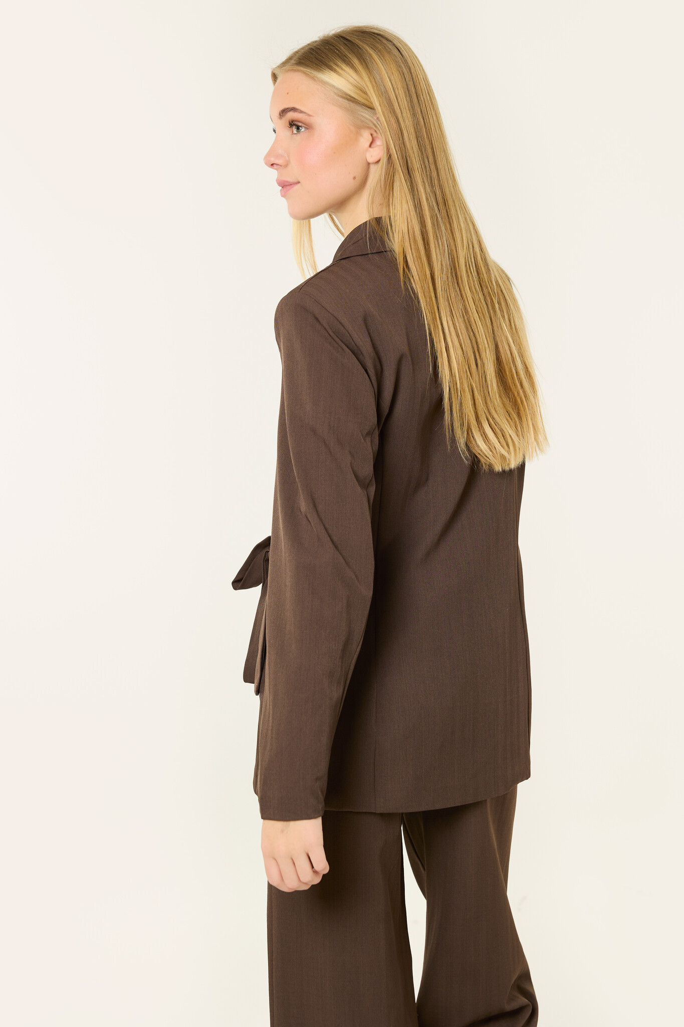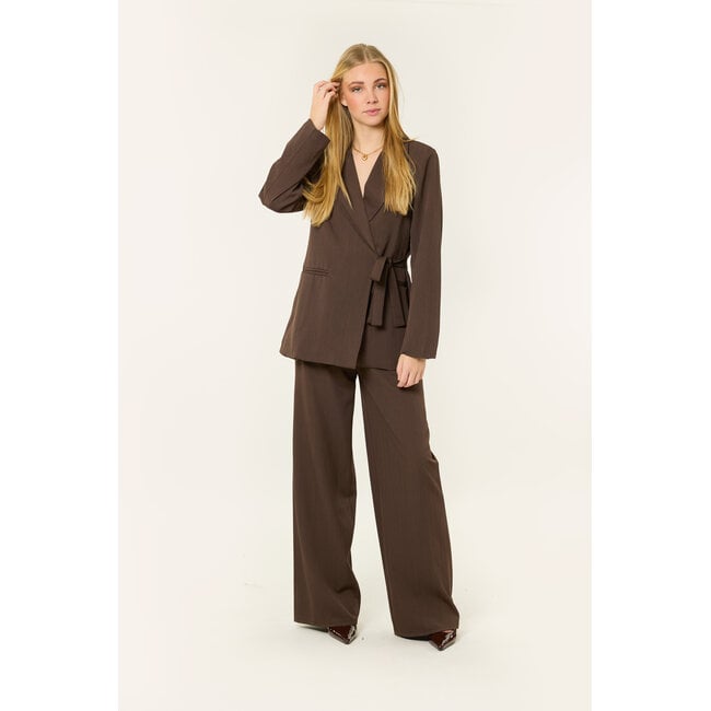 Deze bruine blazer set is een stijlvolle en comfortabele co-ord set met een subtiel lijnenpatroon, bestaande uit een blazer met strikdetail en een bijpassende broek. De blazer heeft een mooie pasvorm met lange mouwen en een strikdetail aan de zijkant. De broek heeft een rechte, wijde fit, waardoor deze mooi valt.