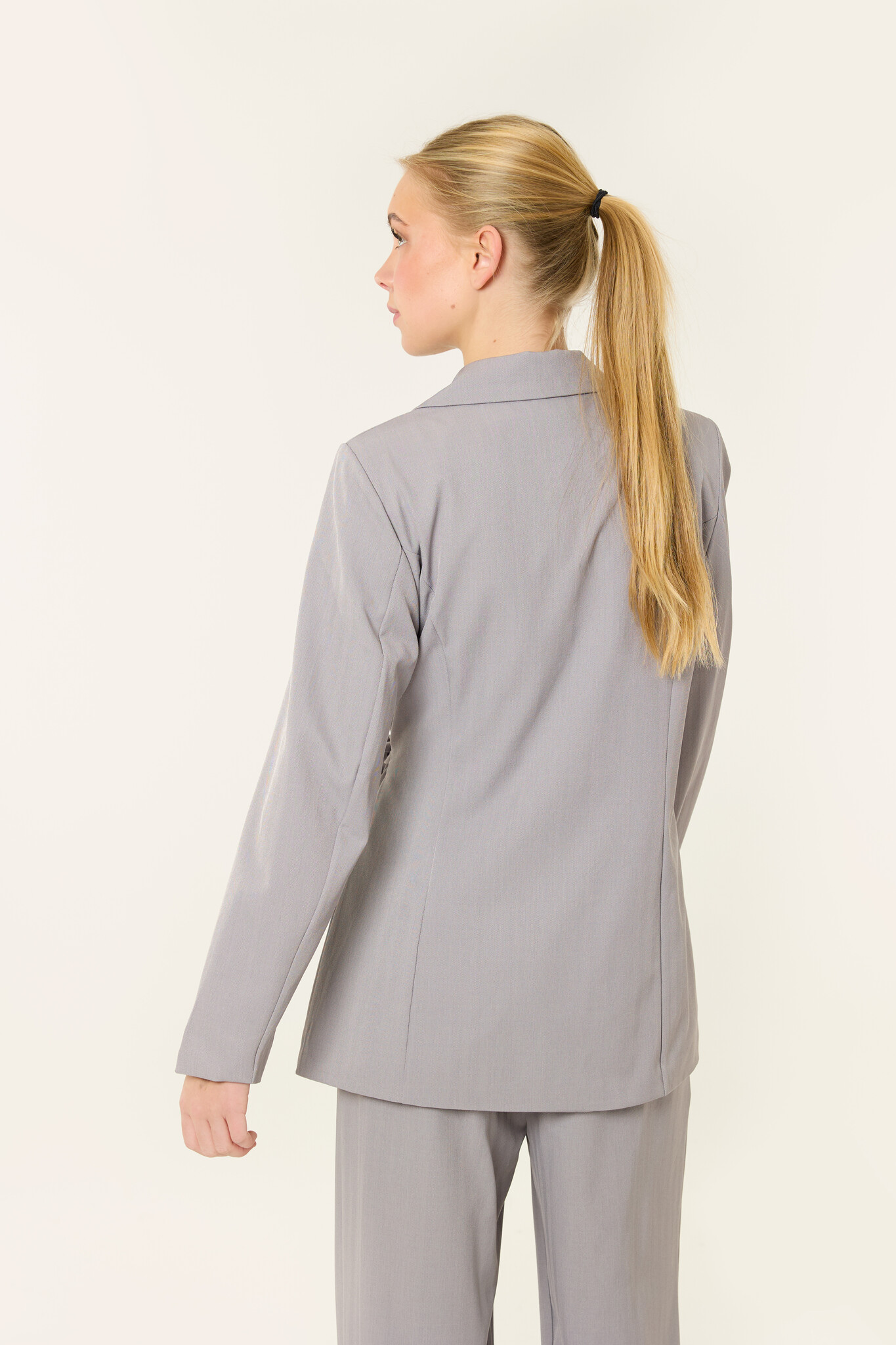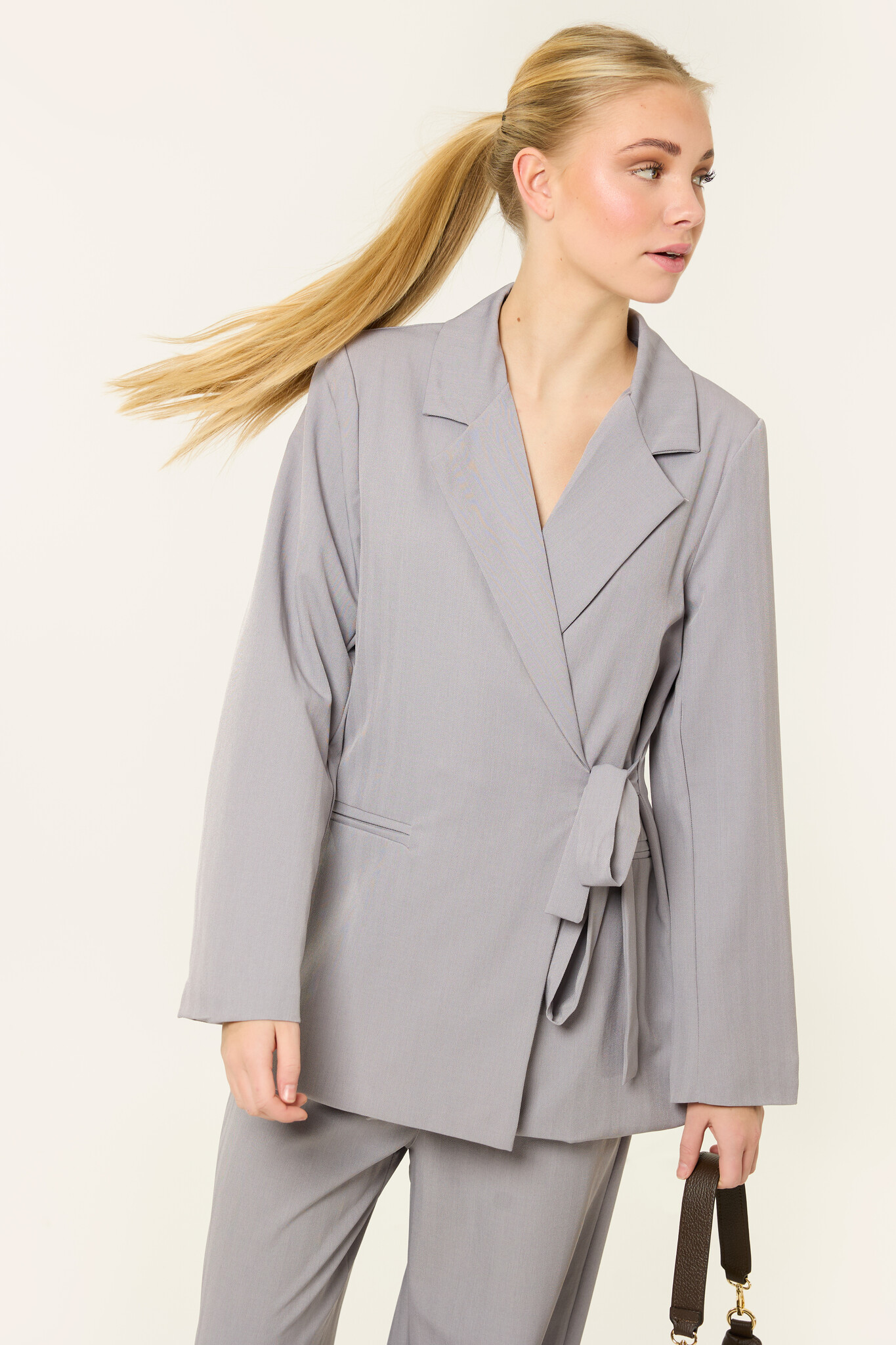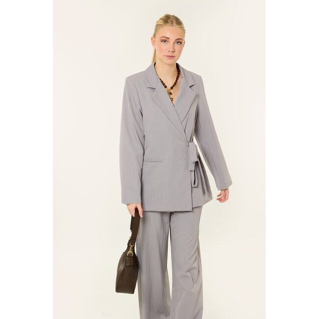 Deze lichtgrijze blazer set is een stijlvolle en comfortabele co-ord set met een subtiel lijnenpatroon, bestaande uit een blazer met strikdetail en een bijpassende broek. De blazer heeft een mooie pasvorm met lange mouwen en een strikdetail aan de zijkant. De broek heeft een rechte, wijde fit, waardoor deze mooi valt.