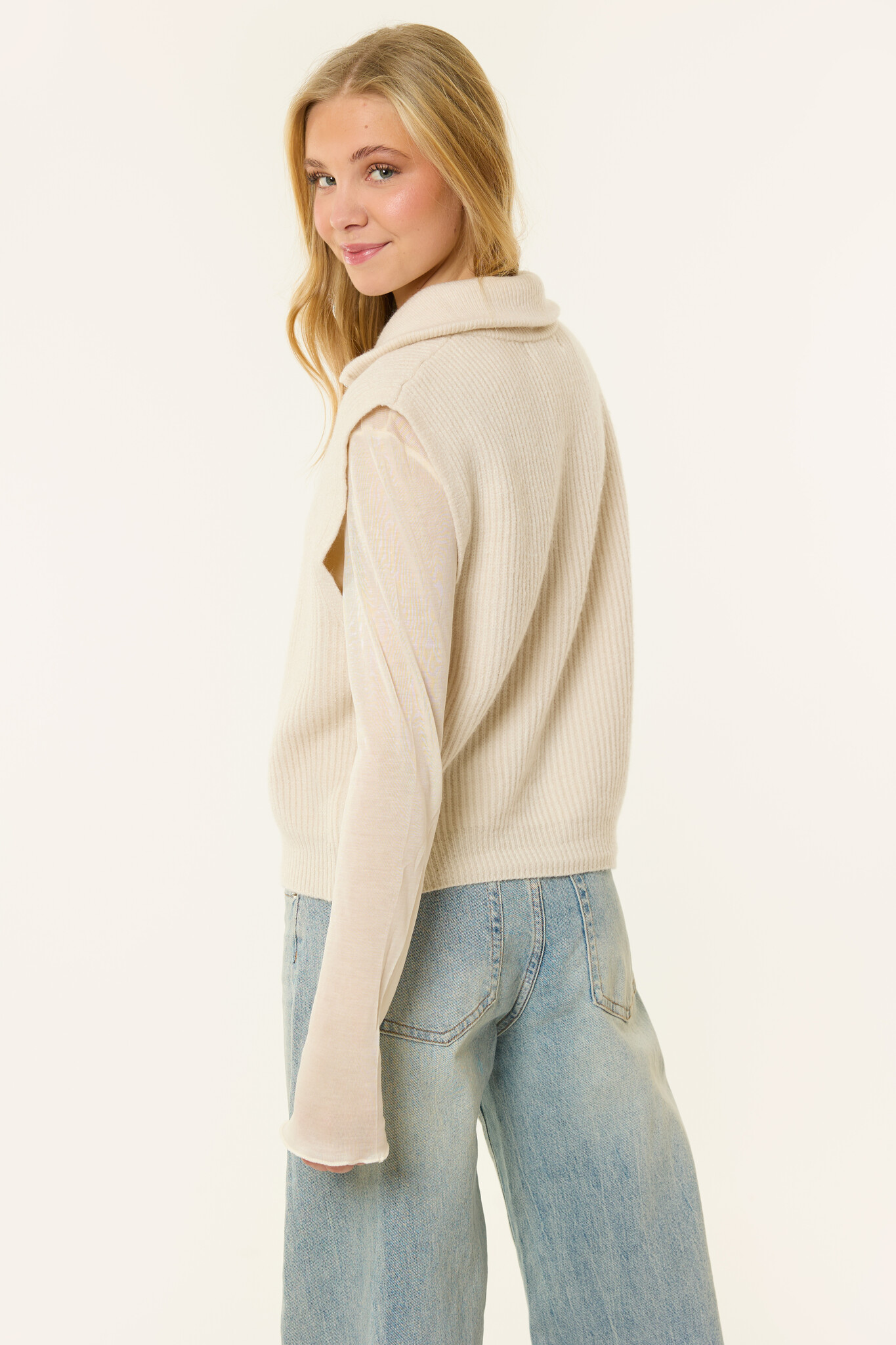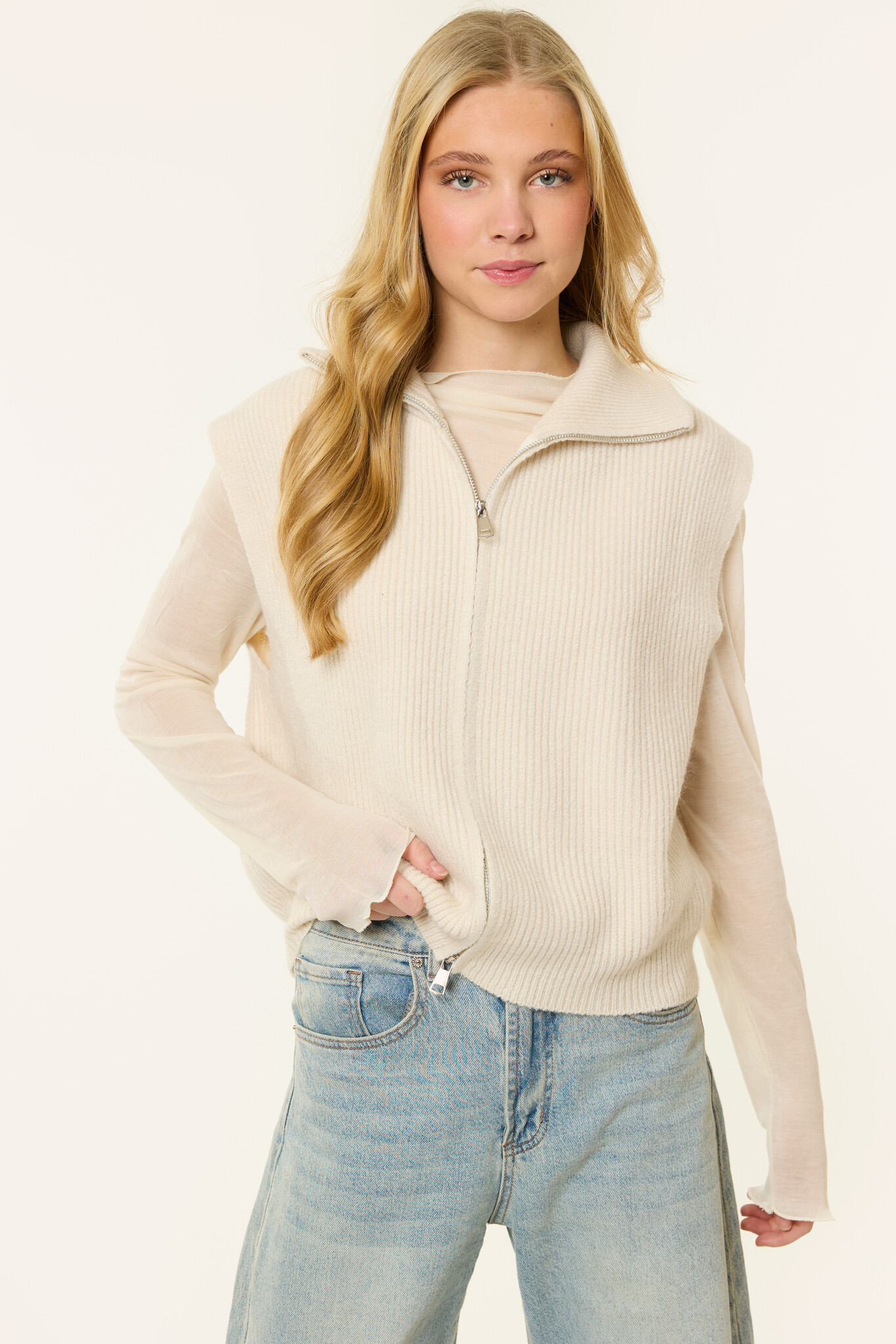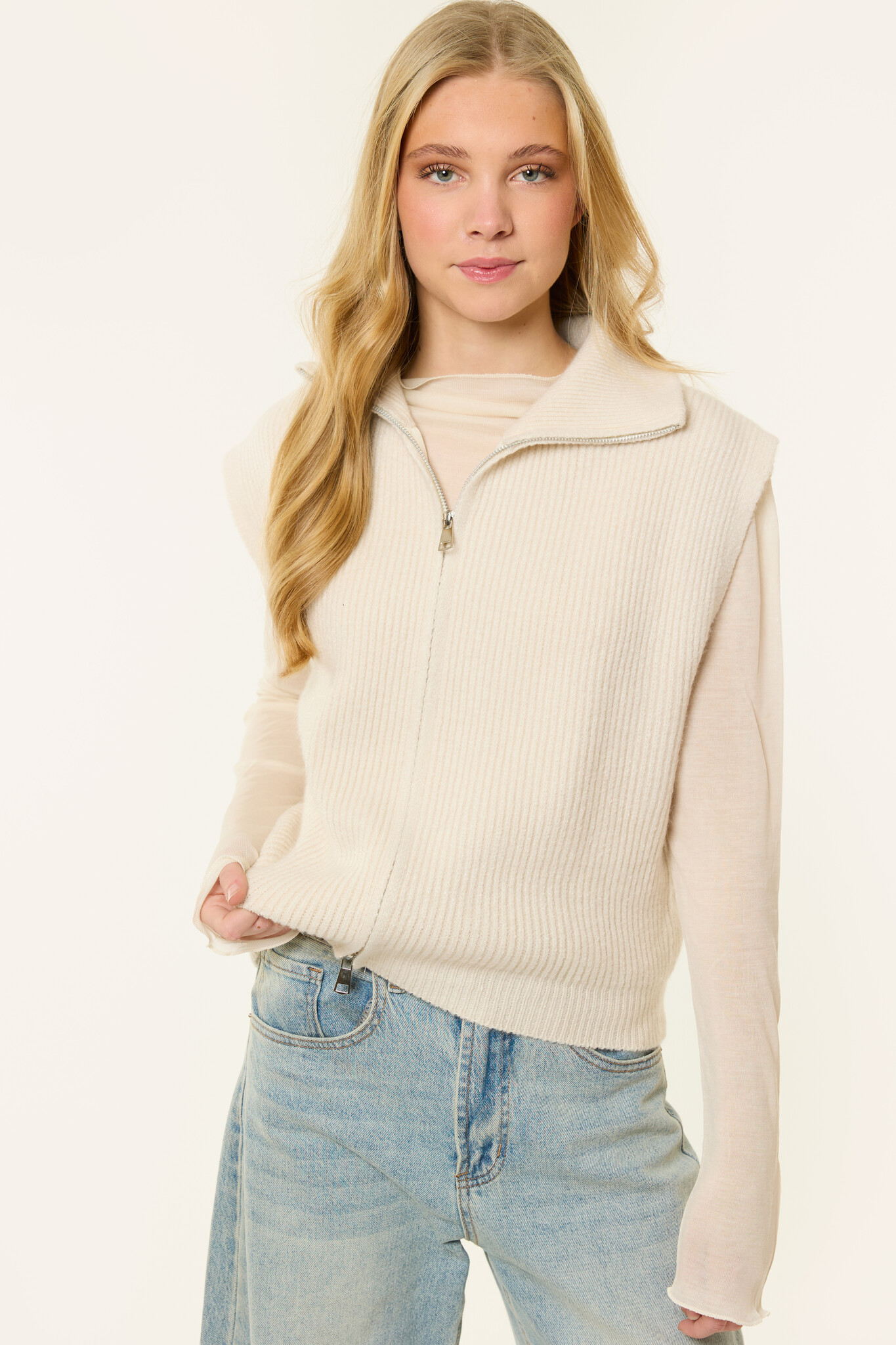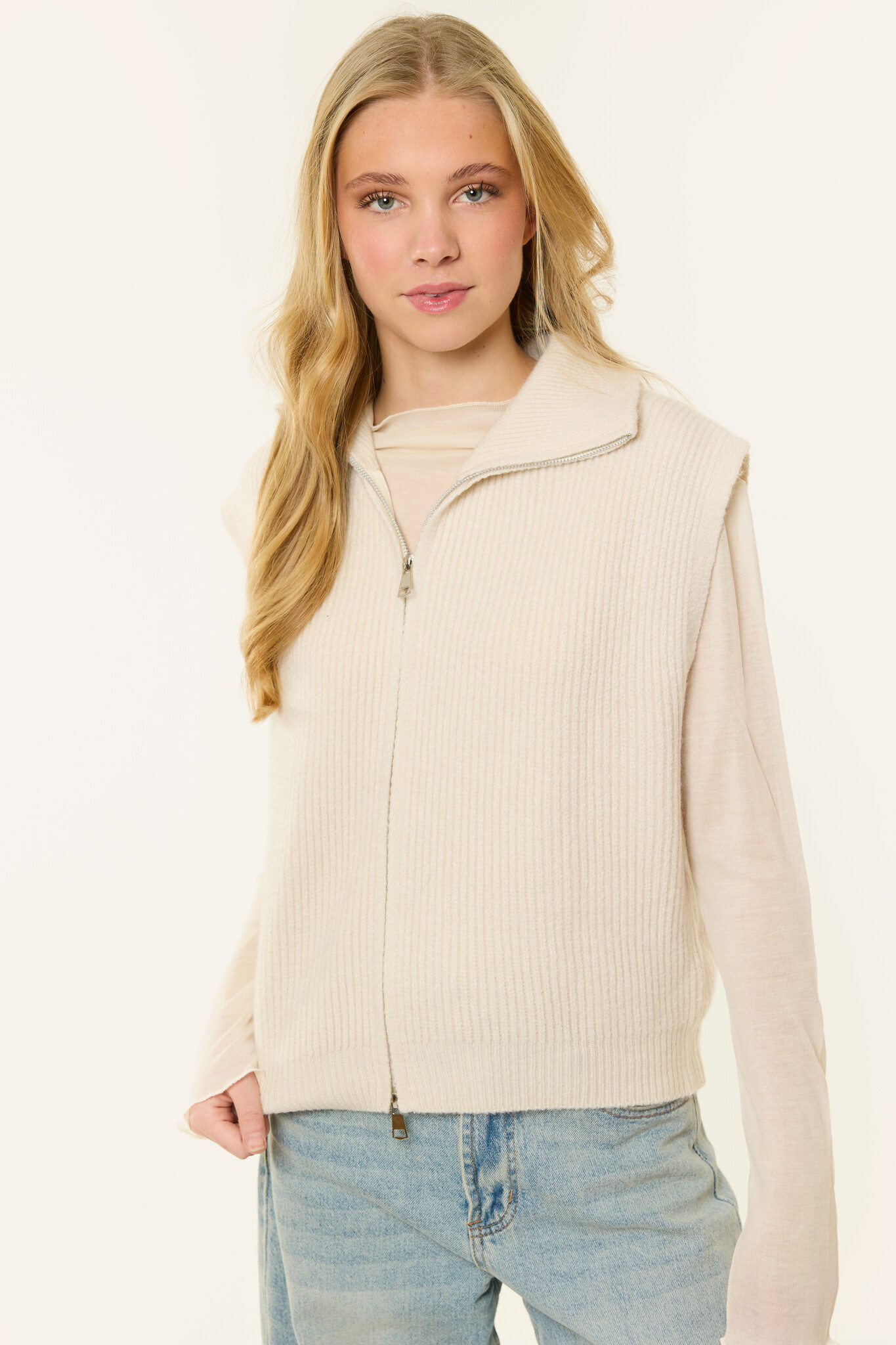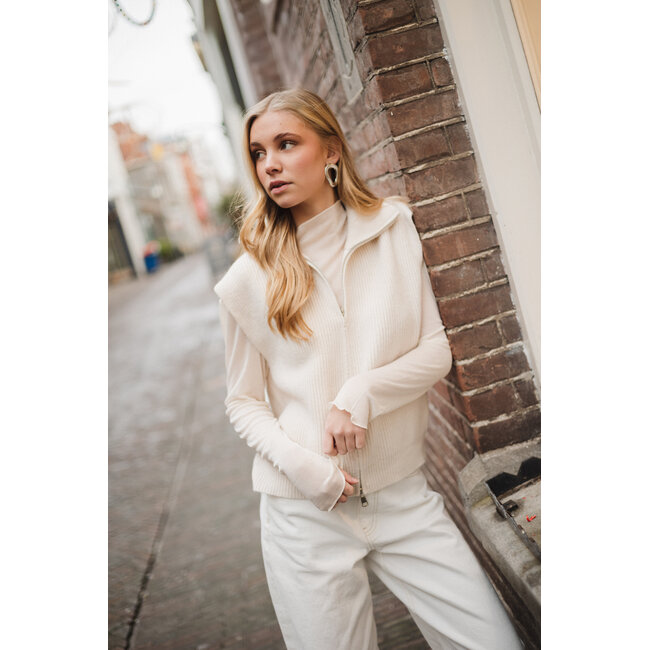 Deze beige spencer is een ideaal item voor het tussenseizoen. De spencer is gemaakt van een zachte, gebreide stof en heeft een mouwloos design met een dubbele rits en kraag. Dankzij de neutrale kleur en comfortabele pasvorm is deze spencer perfect om te dragen over een top, blouse of longsleeve.