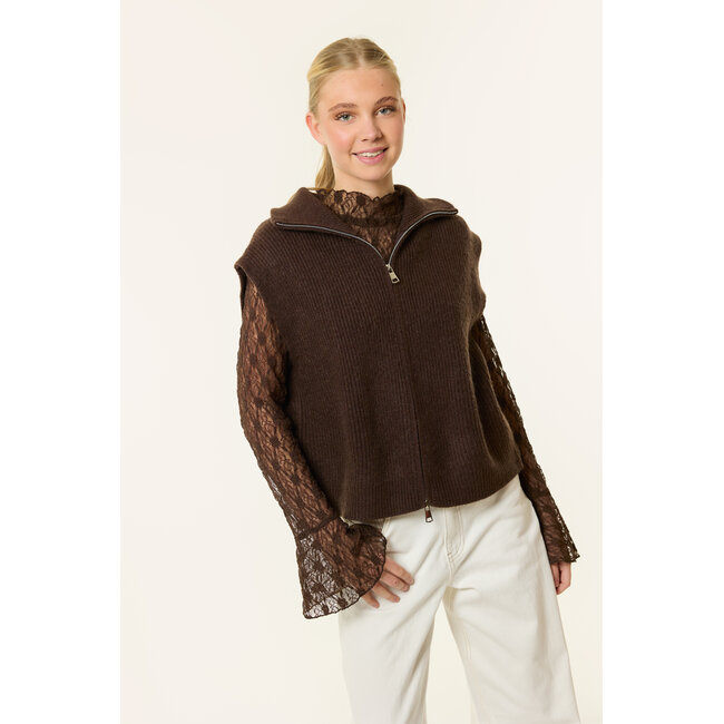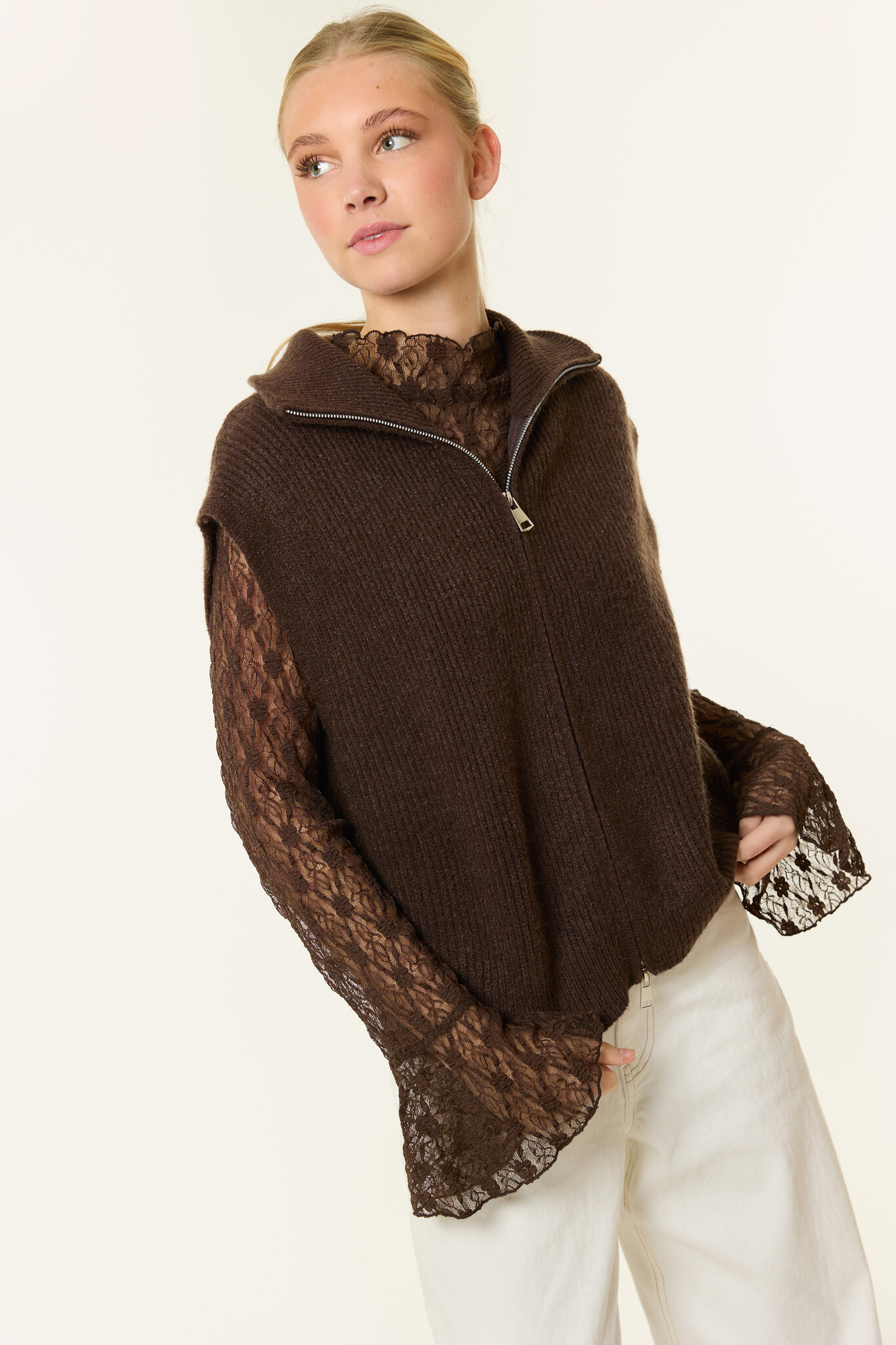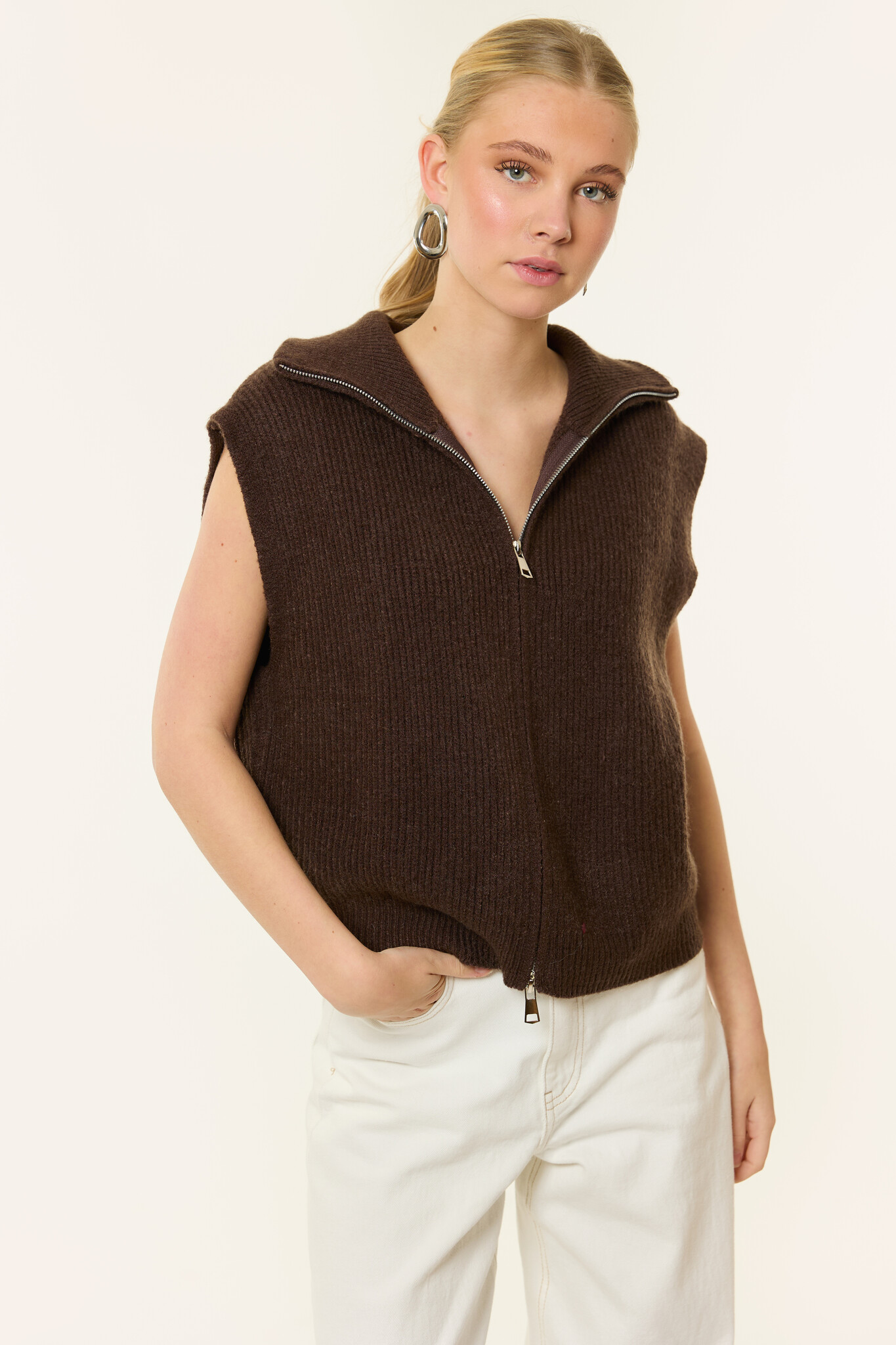 Deze beige spencer is een ideaal item voor het tussenseizoen. De spencer is gemaakt van een zachte, gebreide stof en heeft een mouwloos design met een dubbele rits en kraag. Dankzij de neutrale kleur en comfortabele pasvorm is deze spencer perfect om te dragen over een top, blouse of longsleeve.