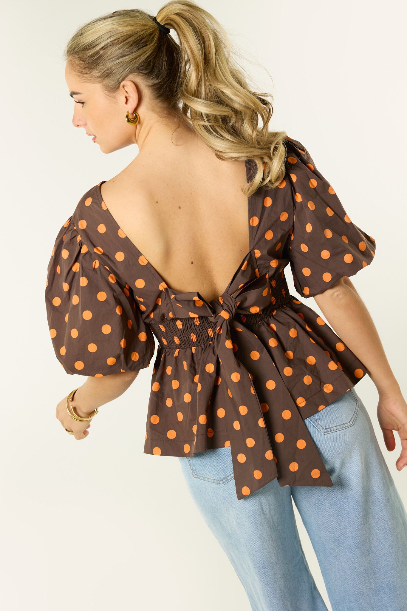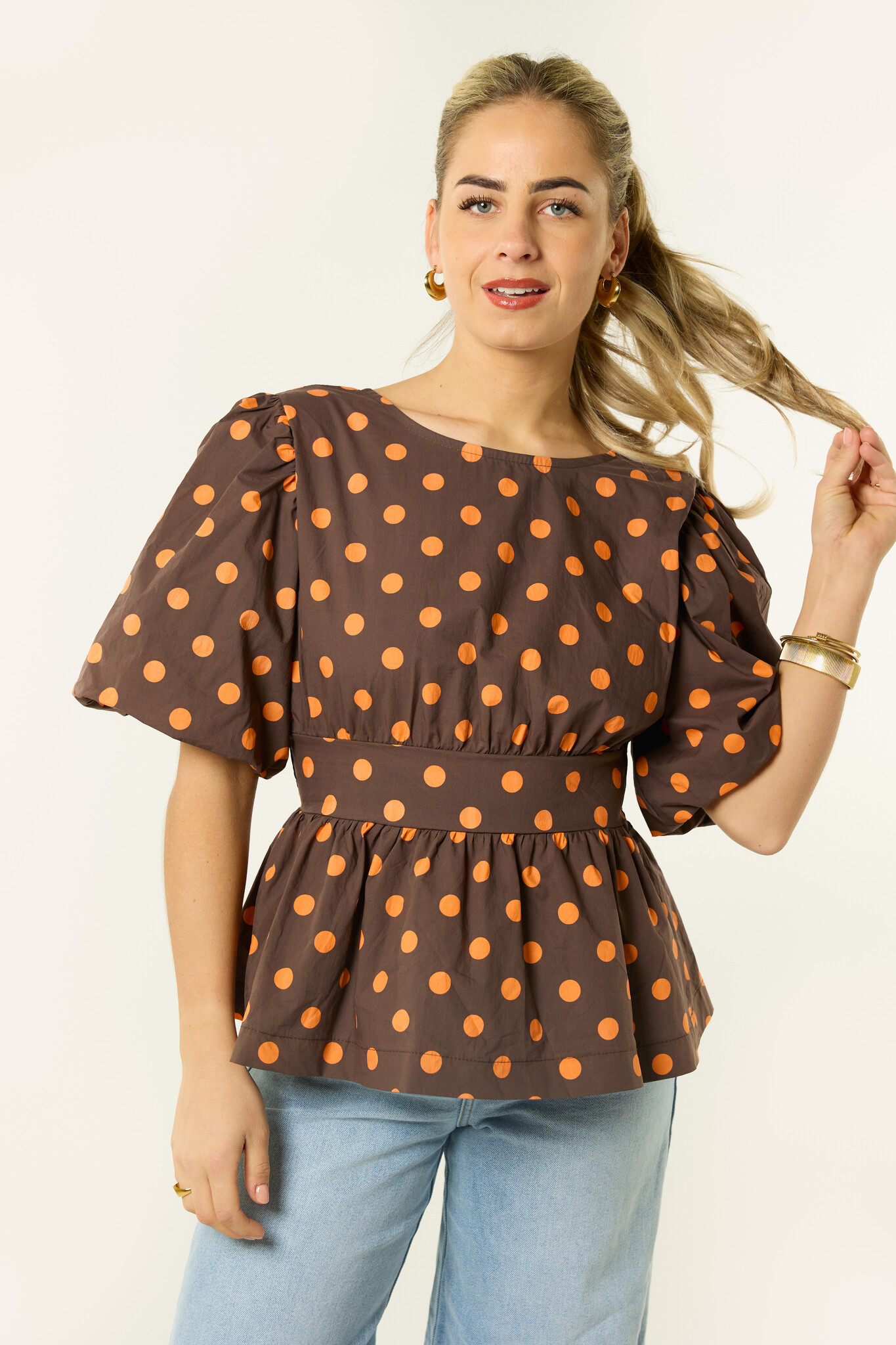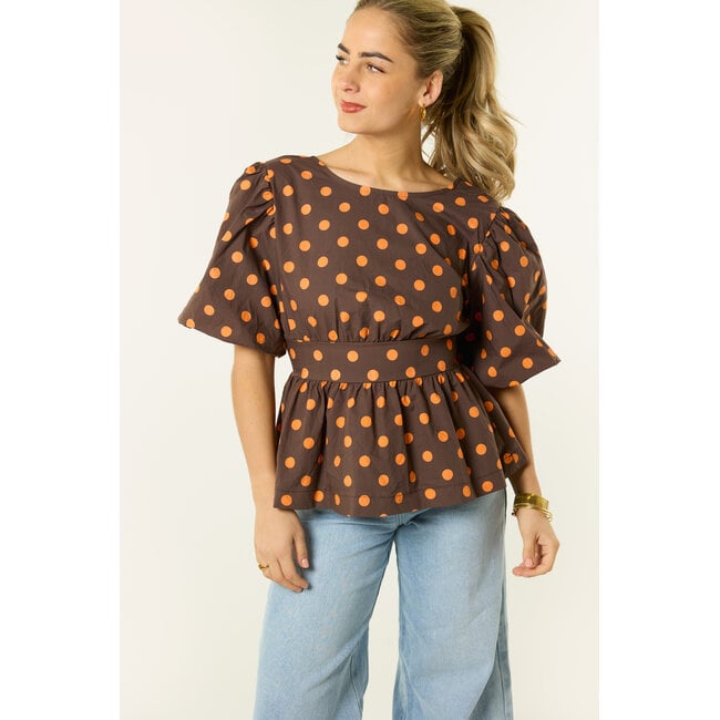 Deze bruine stippen top is een echte eyecatcher. De bruine top met oranje polka dots en pofmouwen geeft je outfit meteen een speelse en vrouwelijke look. De pasvorm met tailleband zorgt voor een mooie fit en de strik op de rug maakt de top extra bijzonder.