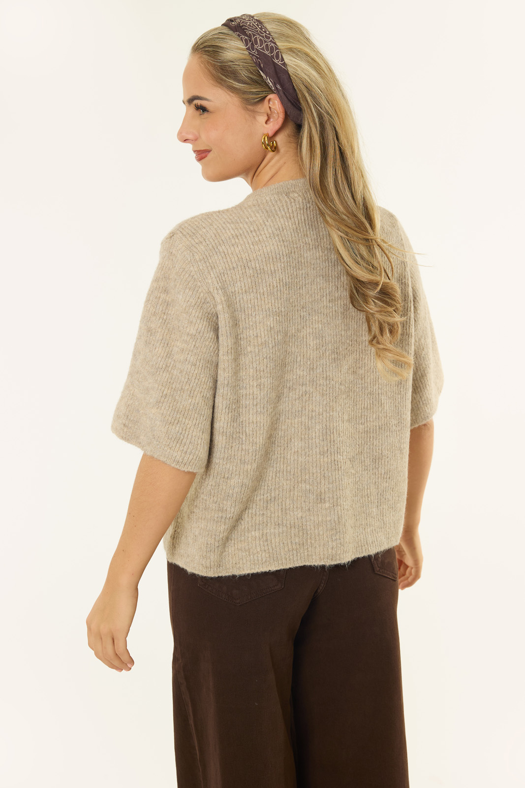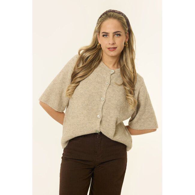 Deze taupe cardigan is een heerlijke, zachte basic met een moderne twist. De half-lange mouwen geven het vest een fun en luchtige look, terwijl de knoopsluiting zorgt dat je hem makkelijk open of dicht kunt dragen. Dankzij de relaxed fit voelt hij super comfortabel aan en combineer je moeiteloos met al je favoriete jeans en broeken. Een tijdloze knit die je het hele seizoen door blijft pakken.