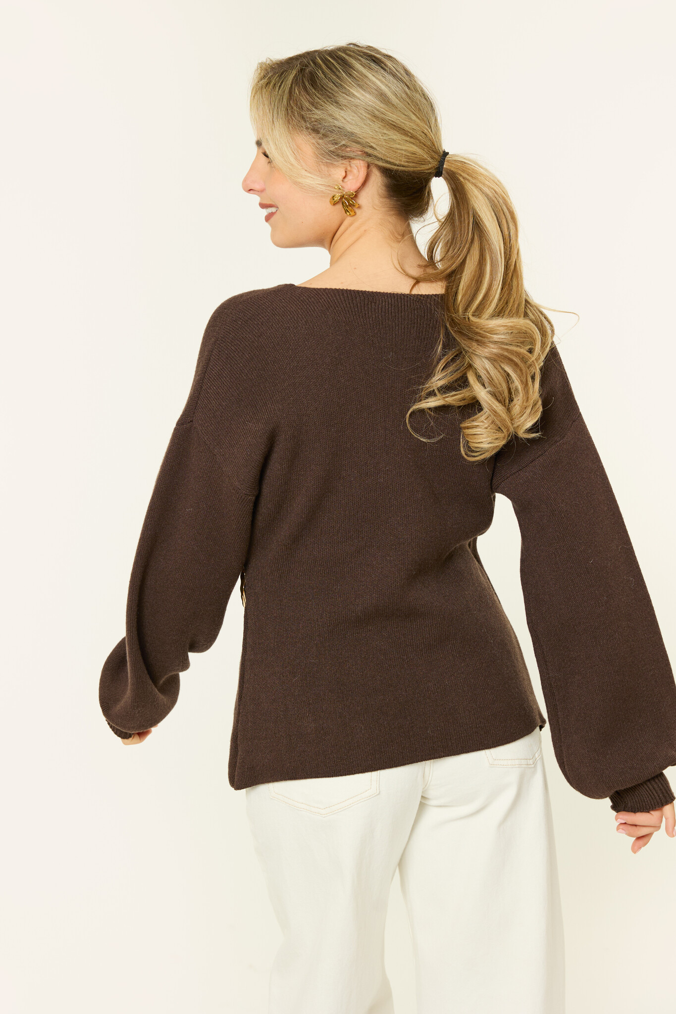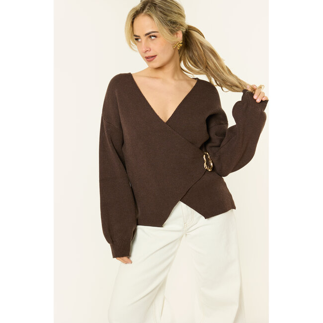 Deze bruine wikkeltop is echt zo’n item dat je aantrekt en meteen denkt: ja, deze zit goed. De V-hals en het overslagmodel laten je taille super mooi uitkomen en de gesp aan de zijkant geeft net dat speelse detail, waardoor de knitted top wat specialer is dan een basic trui. De stof voelt zacht en comfy aan en de fit valt lekker relaxed, dus hij zit gewoon heel fijn. Leuk op een jeans voor een casual look, maar ook heel mooi met een pantalon of rok als je de top iets chiquer wilt stylen. Echt zo’n top die je er makkelijk bij pakt en waarmee je outfit meteen klopt.
