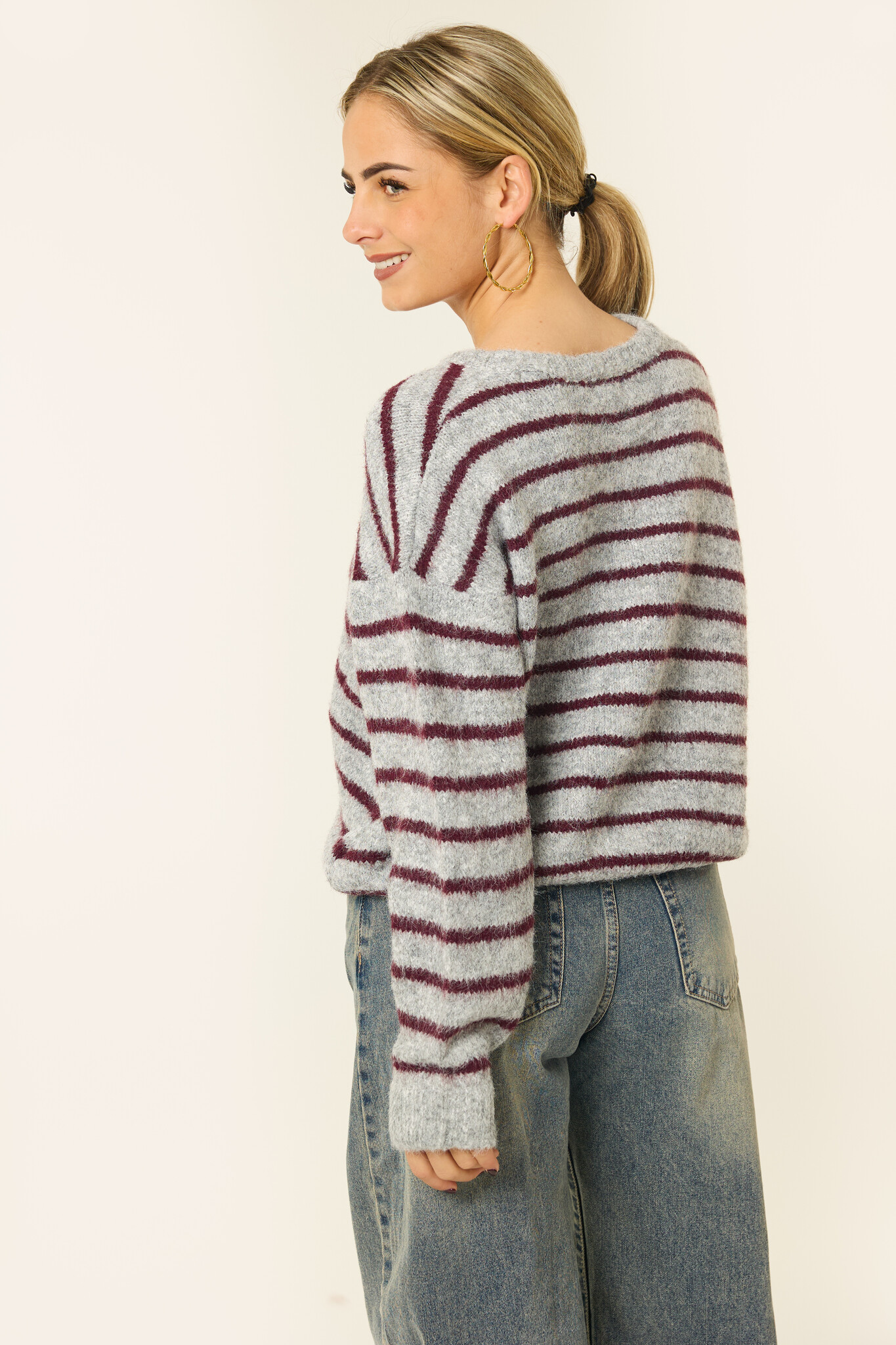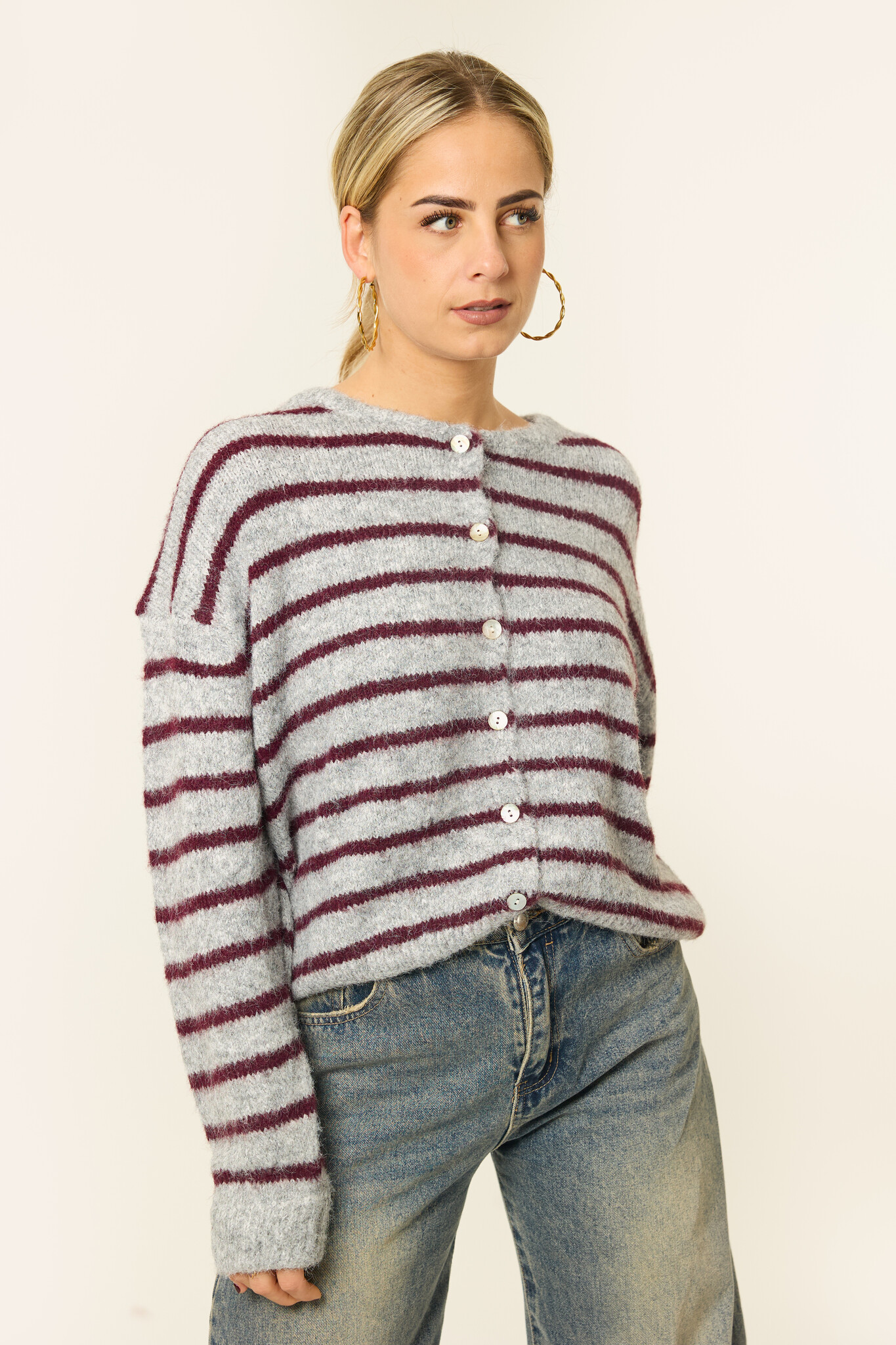 De gestreepte grijs-burgundy cardigan dames is zo’n item dat je meteen aantrekt als je iets zachts, warms en toch stijlvols wilt. De fluffy knit voelt super comfortabel aan en de combinatie van grijze basis met burgundy strepen geeft een fun, cozy look die perfect past bij het najaar. Dankzij de knoopsluiting kun je het vest open of dicht dragen. Leuk op een basic top, jeans of een leren broek. Een fijne musthave voor elke dag, met net dat beetje extra kleur en gezelligheid.