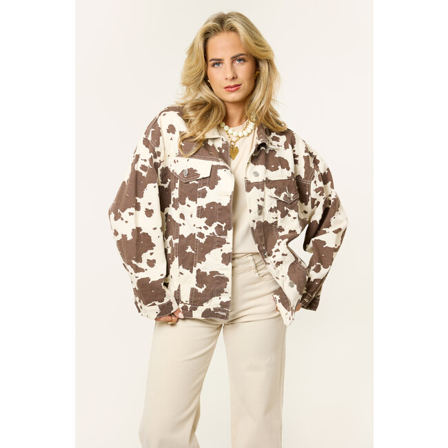 Deze spijkerjas is allesbehalve basic en echt de trend van aankomend najaar. De bruine koeienprint op offwhite denim maakt de jas een echte eyecatcher. De fit is oversized en makkelijk te combineren met een jeans en basic top of co-ord.