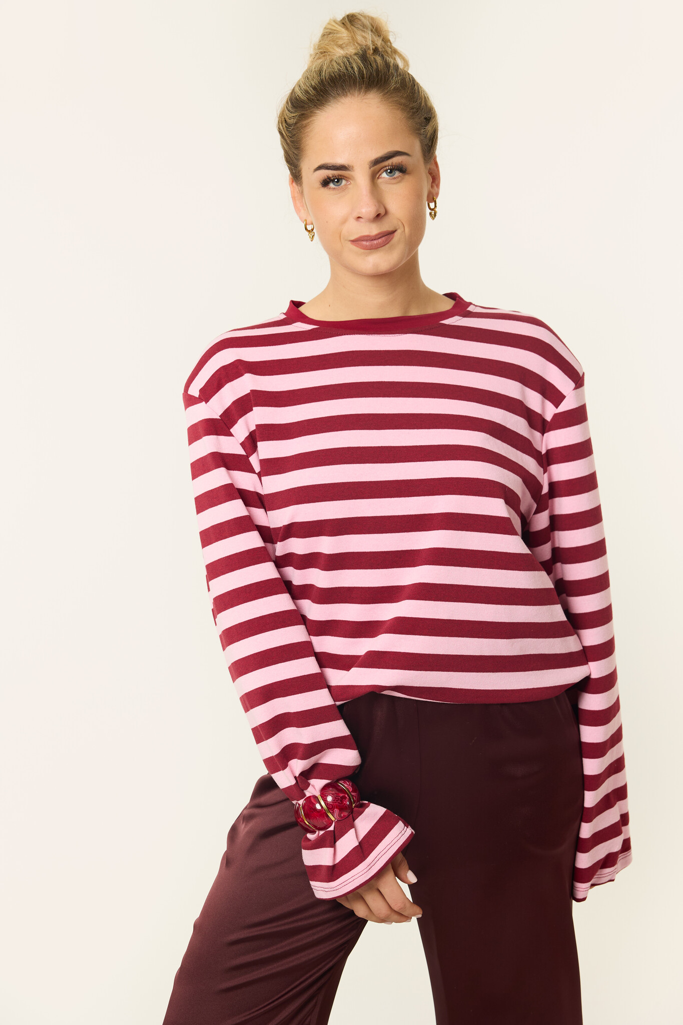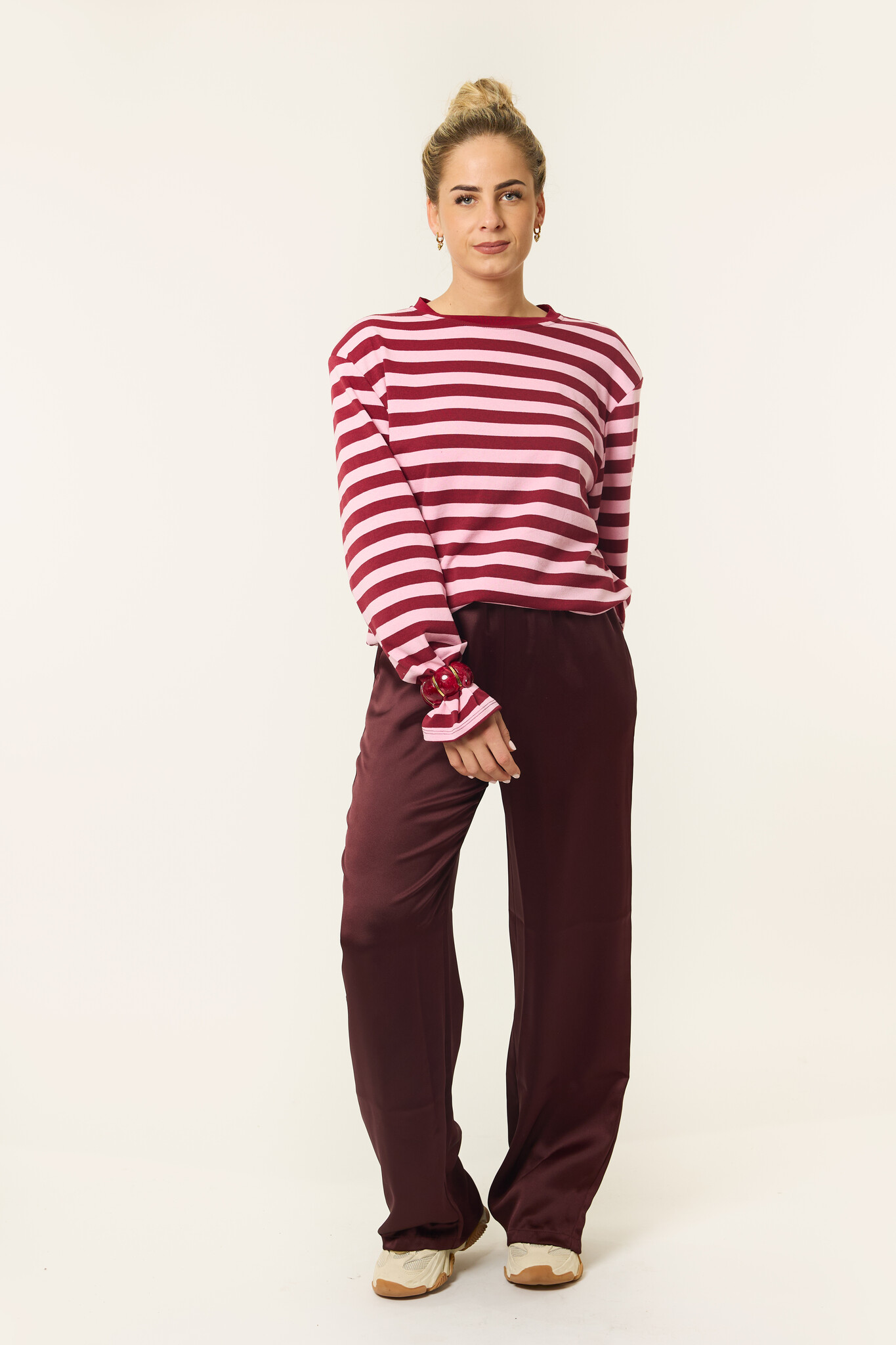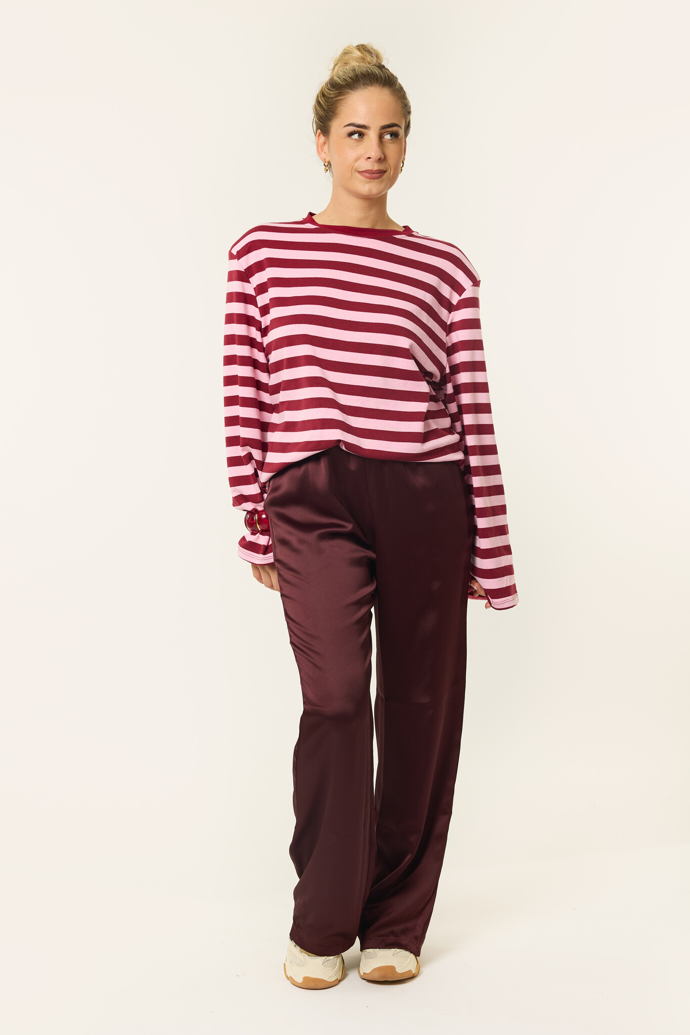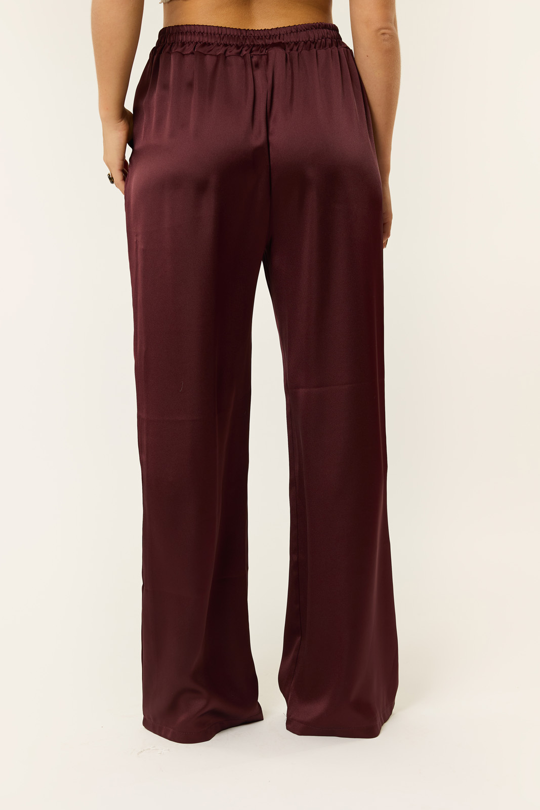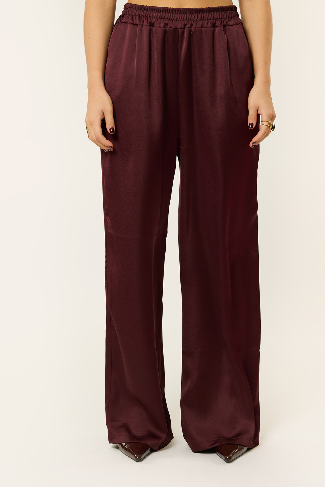 Deze burgundy rode satijnen pantalon heeft een luxe uitstraling en zit heerlijk comfortabel. Dankzij de elastische tailleband heeft de broek een relaxte pasvorm, terwijl de rechte pijpen zorgen voor een moderne, vrouwelijke look. Perfect te combineren met de bijpassende top voor een stijlvolle co-ord set of met een knit voor een meer casual outfit.