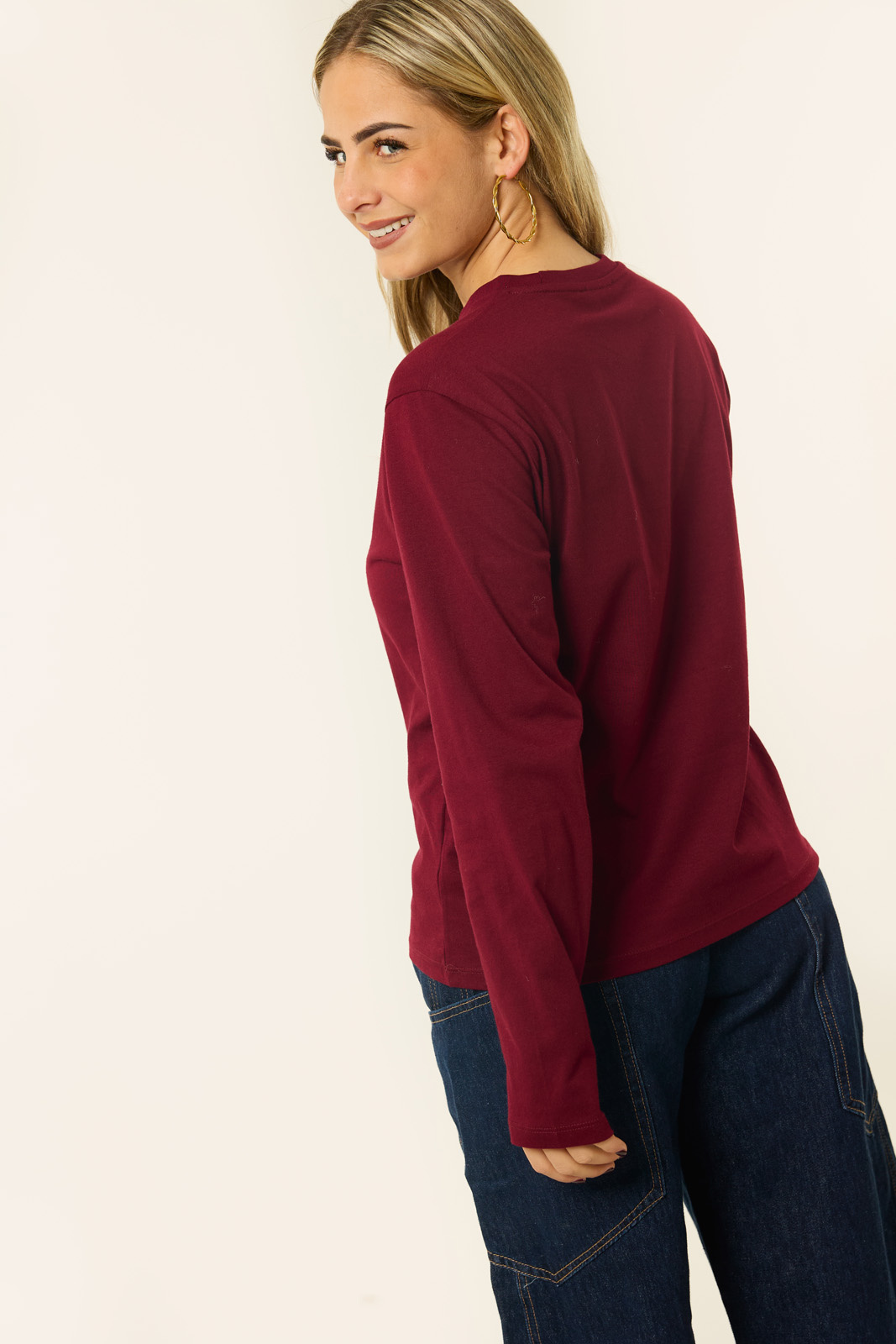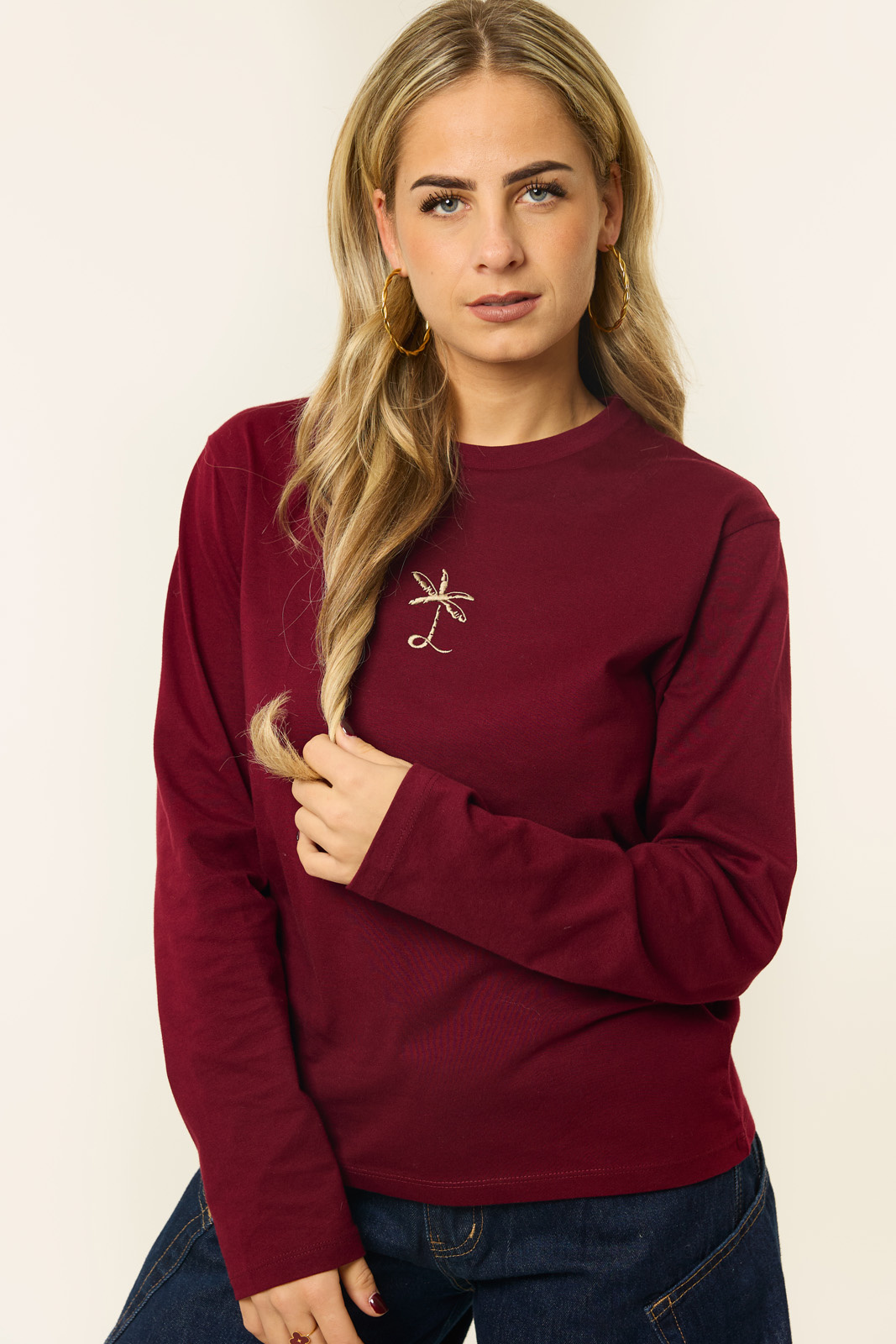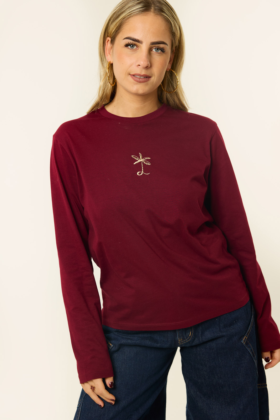 Deze bordeaux rode long sleeve met palmboom is het perfecte everyday item dat net even anders is: de diepe bordeaux kleur geeft een warme, chique uitstraling en het subtiele palmboom-borduursel voegt een fun touch toe zonder dat het te druk wordt. De long sleeve zit heerlijk zacht, heeft een fijne basic fit en is ideaal om casual te dragen met jeans, maar ook superleuk om te combineren in een laagjeslook voor het najaar. Dankzij de tijdloze kleur en het minimalistische design is deze bordeaux long sleeve dames een item dat je het hele seizoen blijft pakken: comfortabel, stijlvol en altijd makkelijk te combineren.