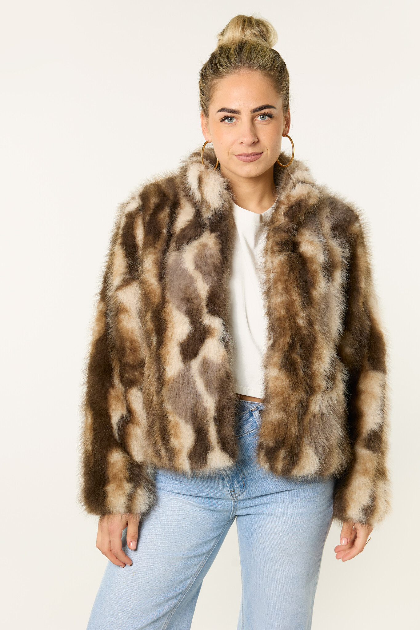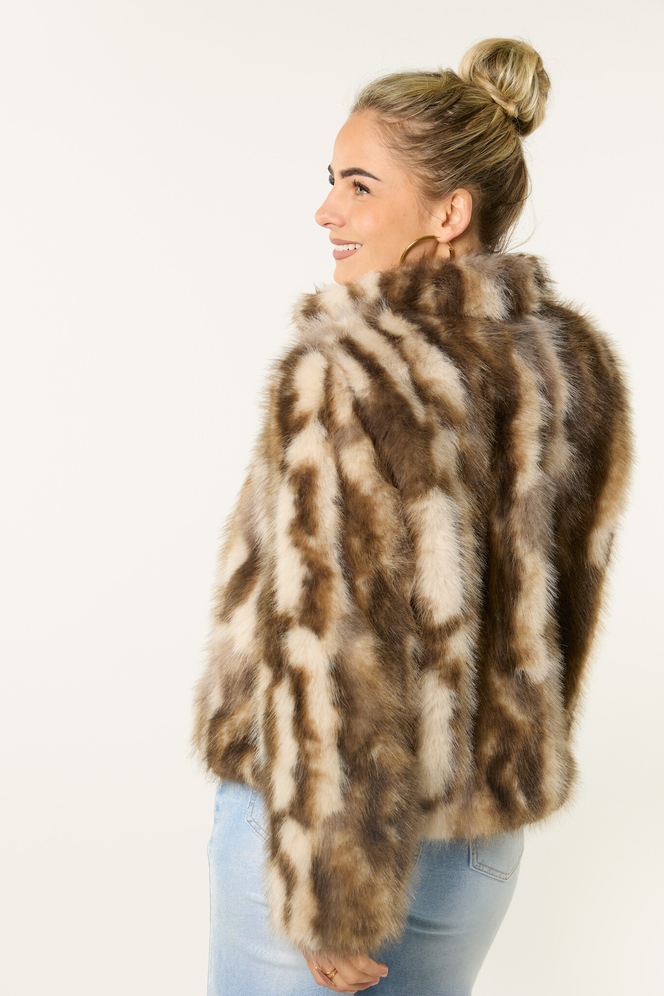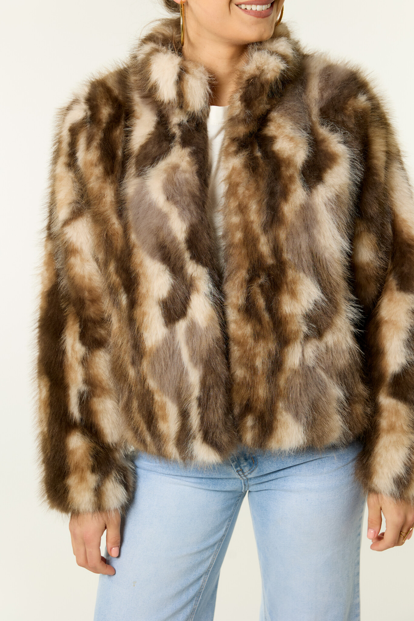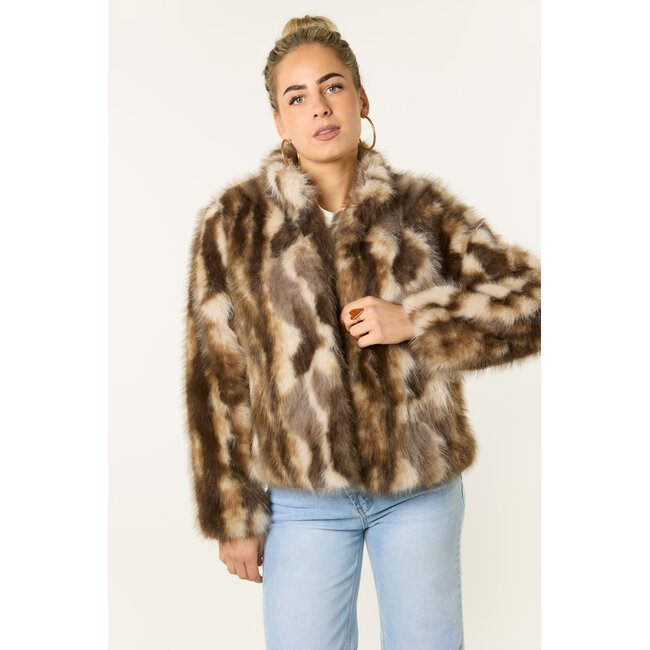 Deze bruine faux fur bontjas is een echte eyecatcher. De faux fur jas heeft een zachte, fluffy stof en een comfortabele pasvorm. Dankzij het korte model geeft deze bruine bontjas je outfit meteen een stijlvolle uitstraling. De faux fur bontjas is een perfecte tussenjas en ideaal om je outfit net dat beetje extra te geven. Een trendy bruine faux fur jas die niet mag ontbreken in je garderobe.