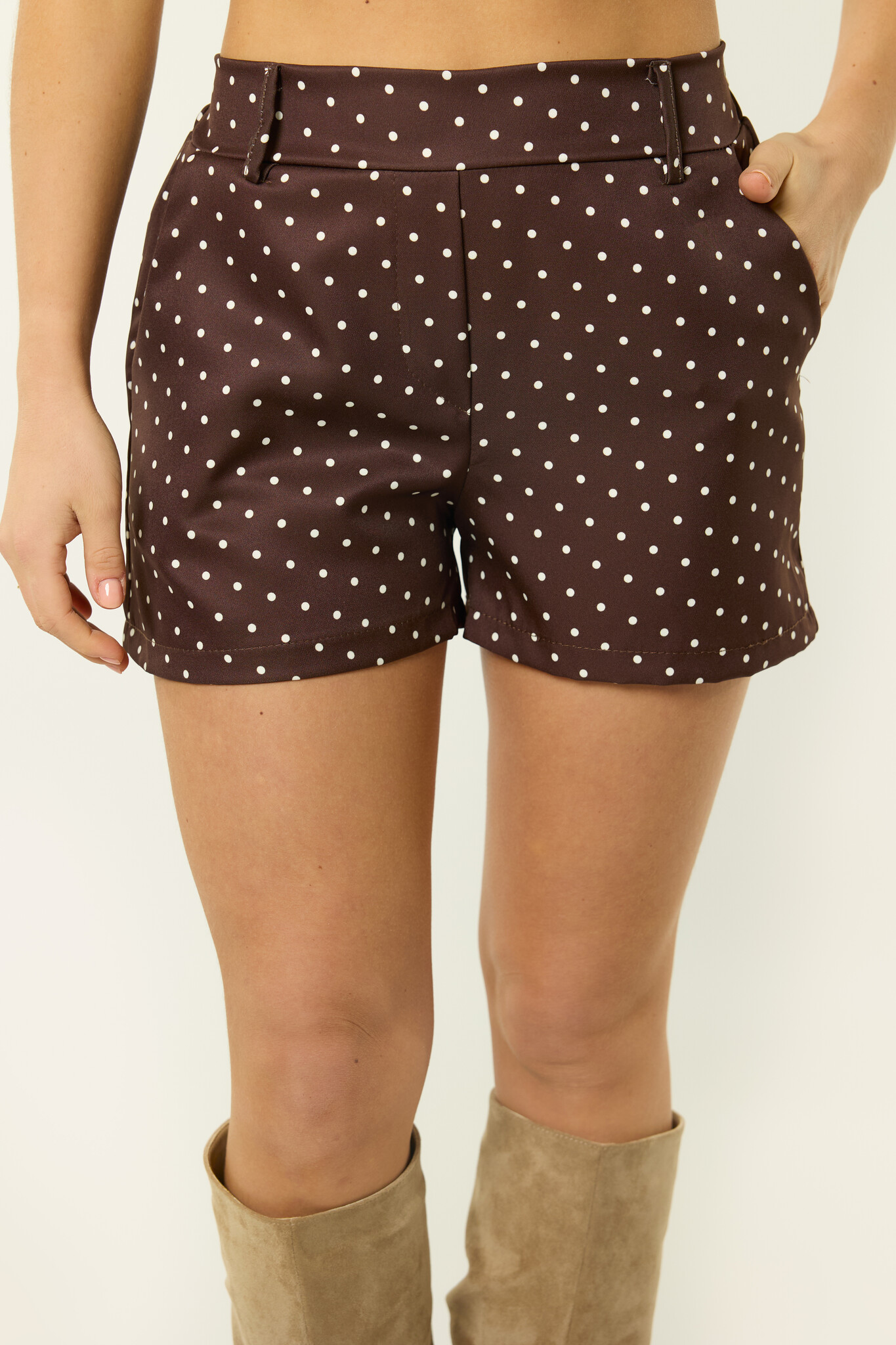 Deze bruine co-ord set met witte stippen is zo’n outfit die meteen opvalt. De polka dot set bestaat uit een bruin jasje met een bijpassende short, waardoor je in één keer een complete look hebt. Draag de bruine matching polka dot set samen voor een stijlvolle outfit. Extra leuk te combineren met laarzen voor een stoere look. Perfect voor een festival of een voorjaarsdag.