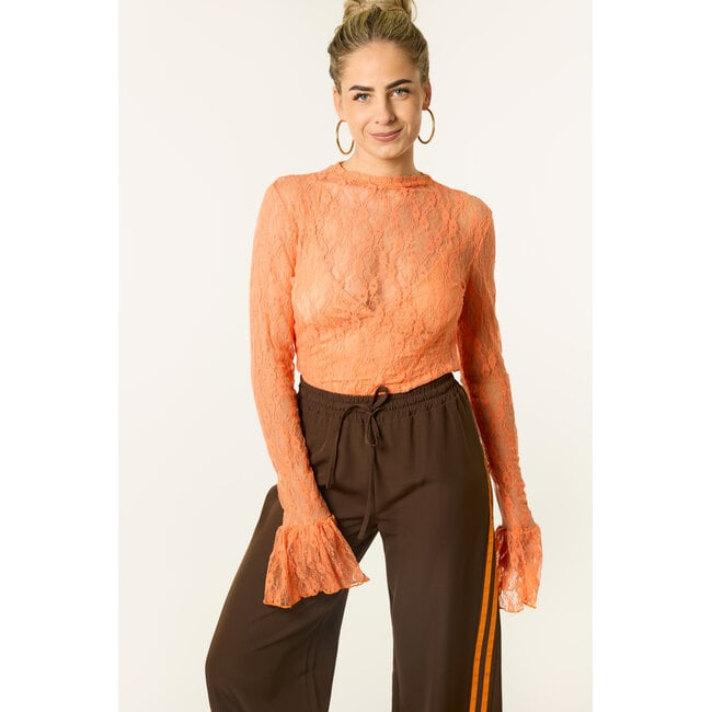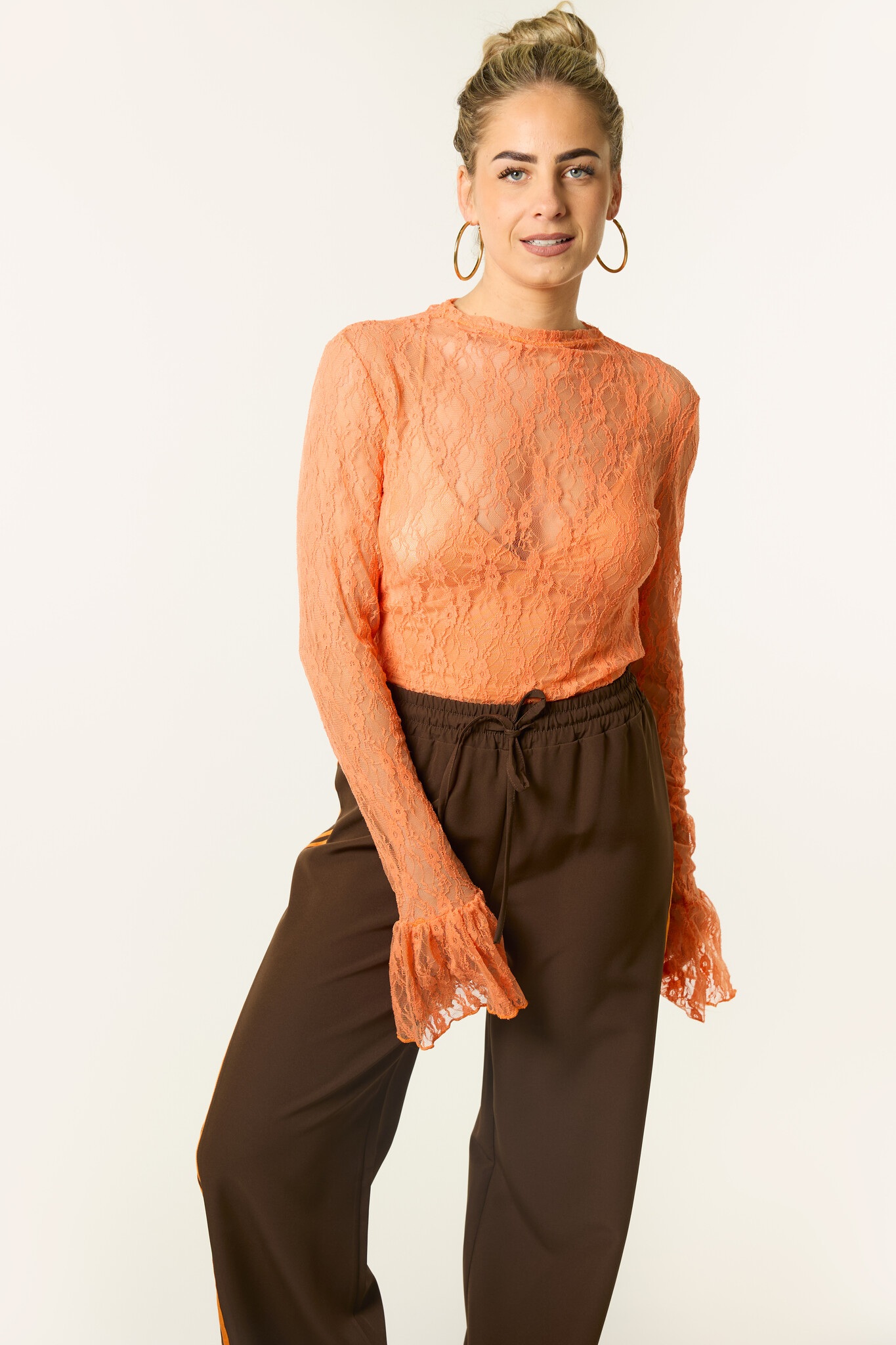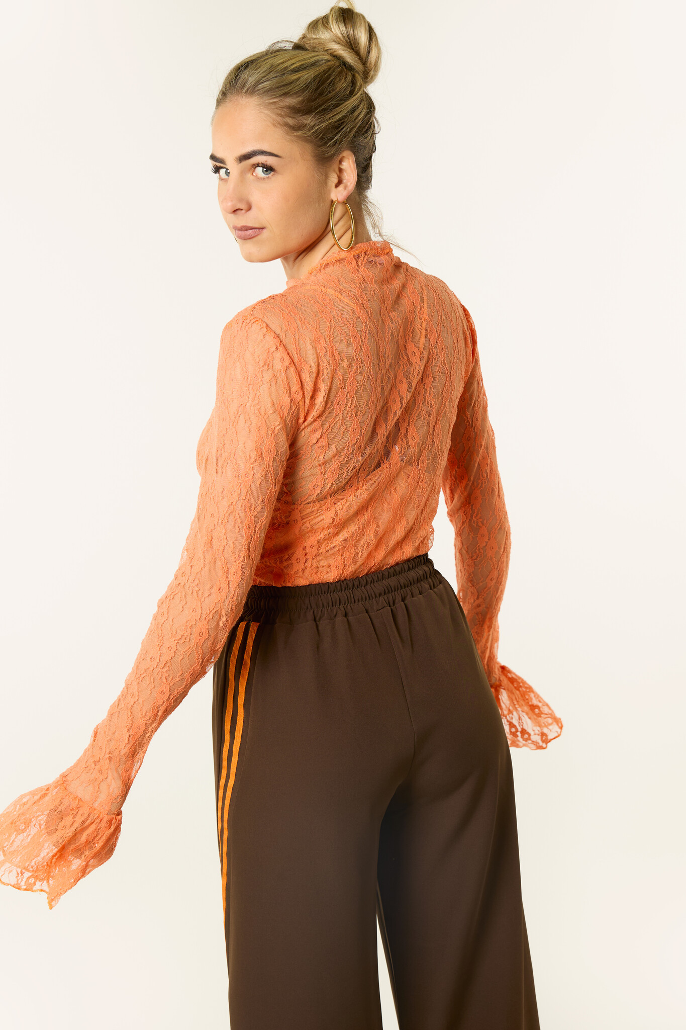 Deze oranje kanten body met uitlopende mouwen is een echte eyecatcher. De transparante lace stof en de lange mouwen met uitlopende mouwuiteinden geven de body een vrouwelijke en trendy uitstraling. De oranje kanten top is perfect voor Koningsdag, maar ook daarna nog leuk te dragen. Combineer de top met een jeans, pantalon of rok voor een stijlvolle outfit. Een trendy kanten top die je look meteen net wat specialer maakt.