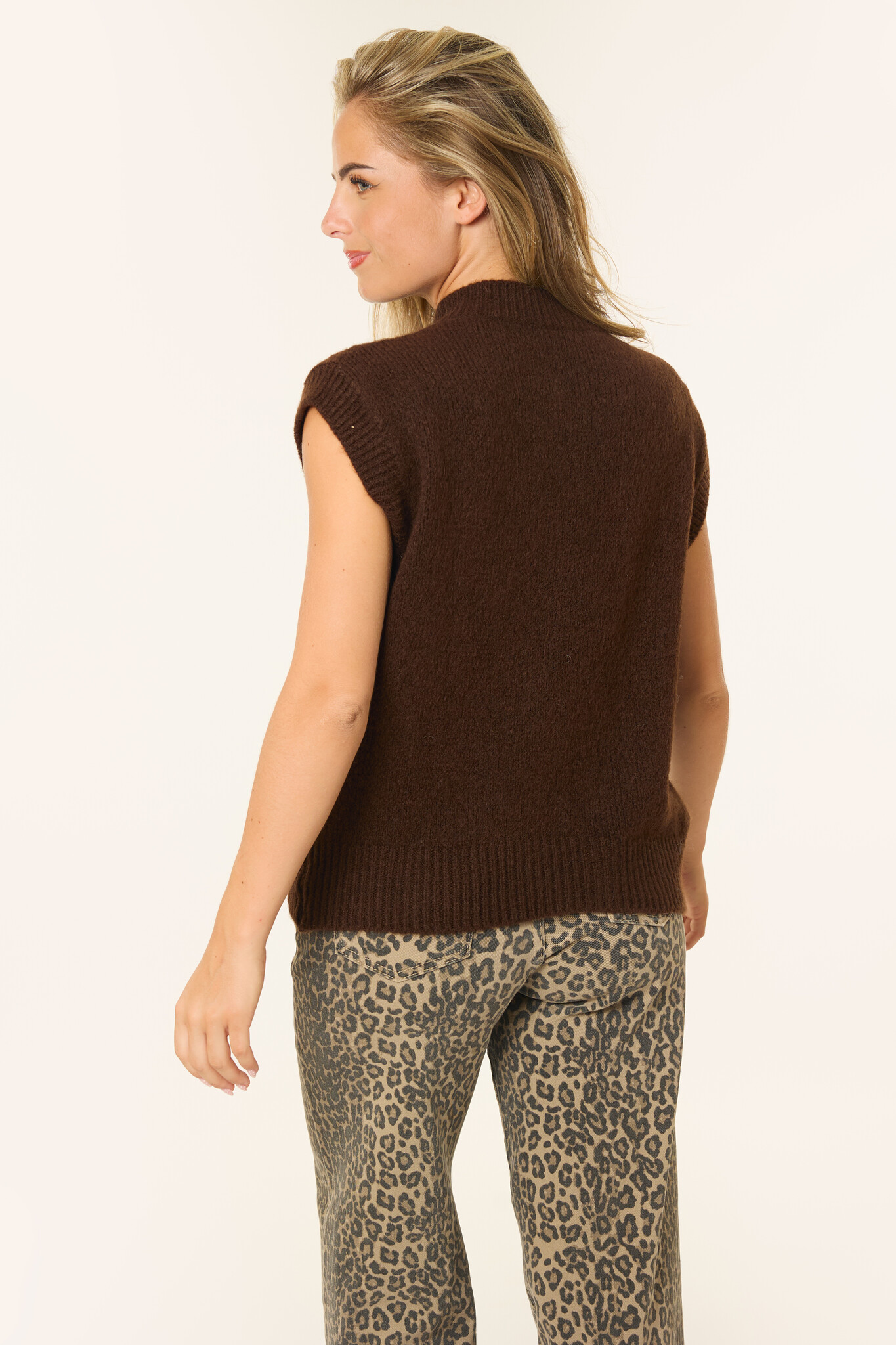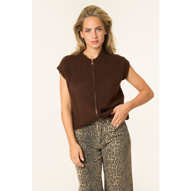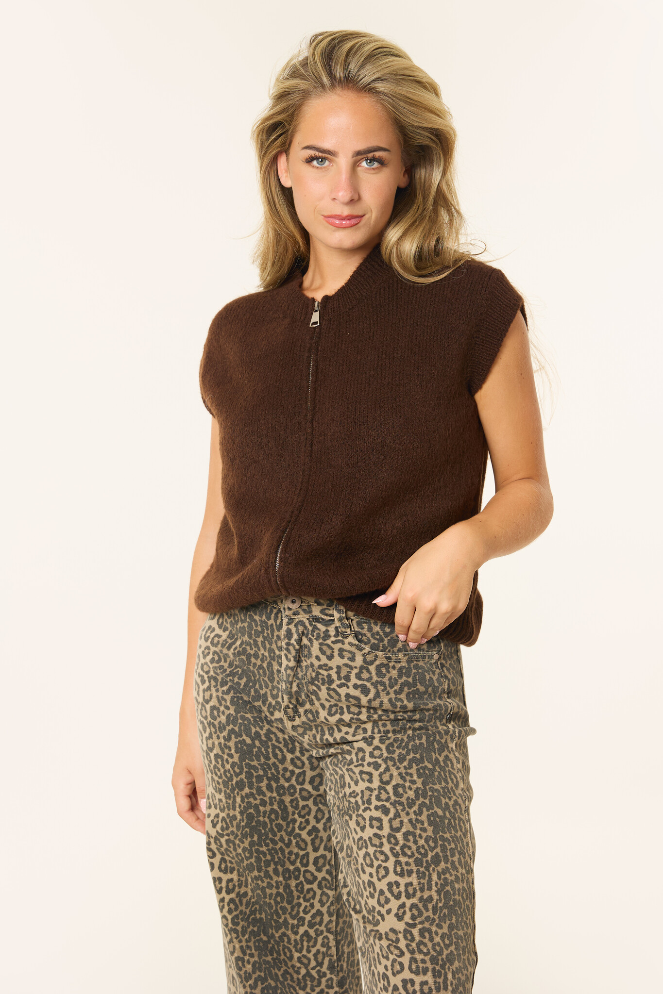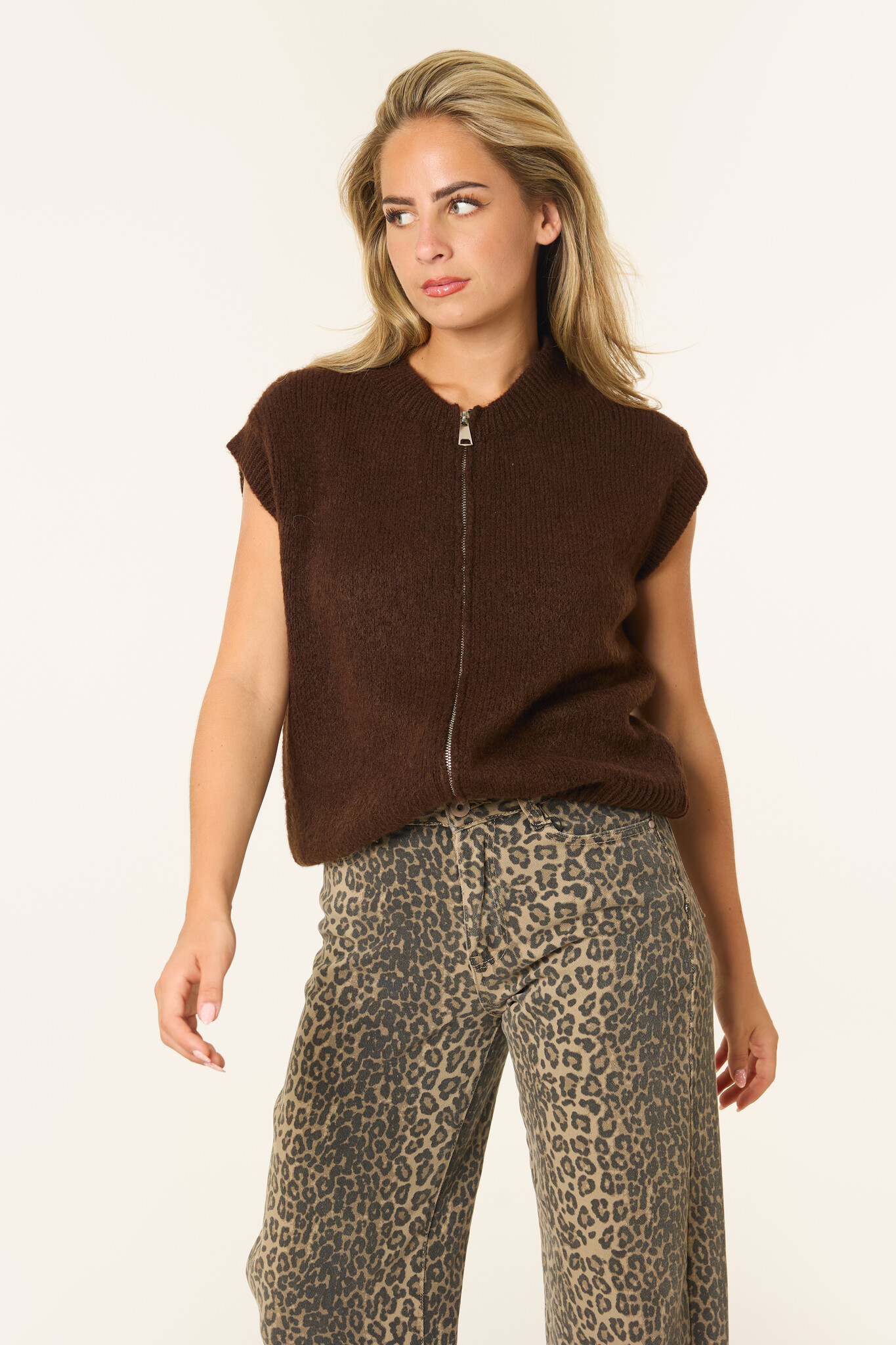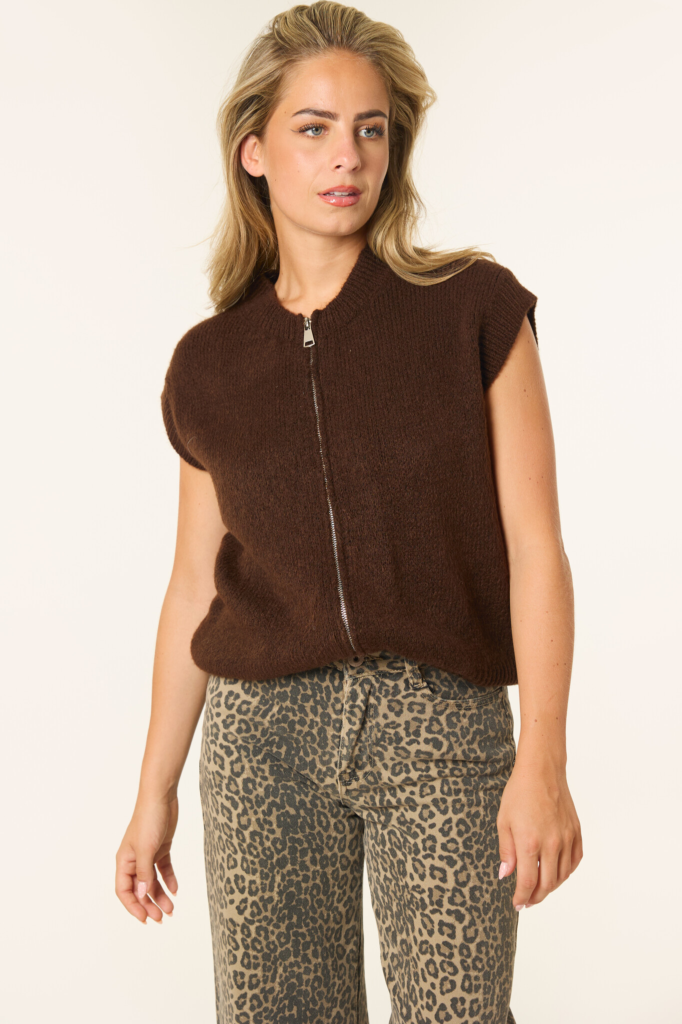 Deze donkerbruine spencer met rits is de perfecte layering piece voor jouw herfst garderobe. Het design met de rits geeft dat beetje extra, terwijl de neutrale bruine kleur zorgt dat je de spencer eindeloos kunt combineren. Draag de spencer over een blouse of basic tee voor een casual look, of style met een pantalon voor een classy vibe.