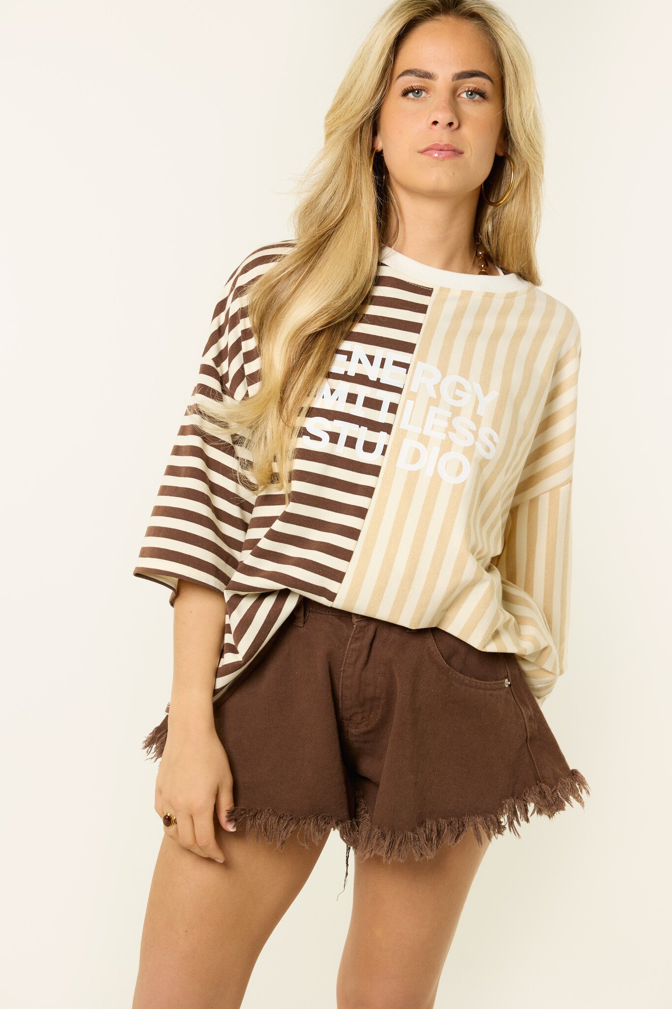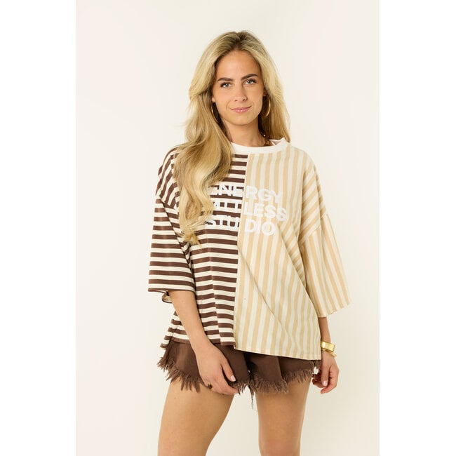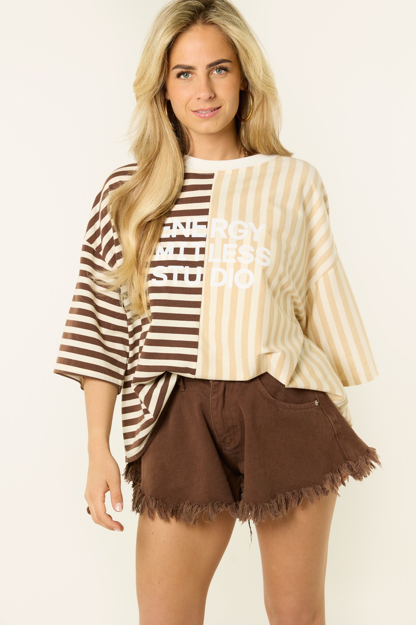 Dit oversized t-shirt is zo’n item dat meteen opvalt. De half and half strepen in bruin/wit en taupe/wit geven het shirt een speelse en trendy look, terwijl de tekstprint zorgt voor net dat beetje extra.