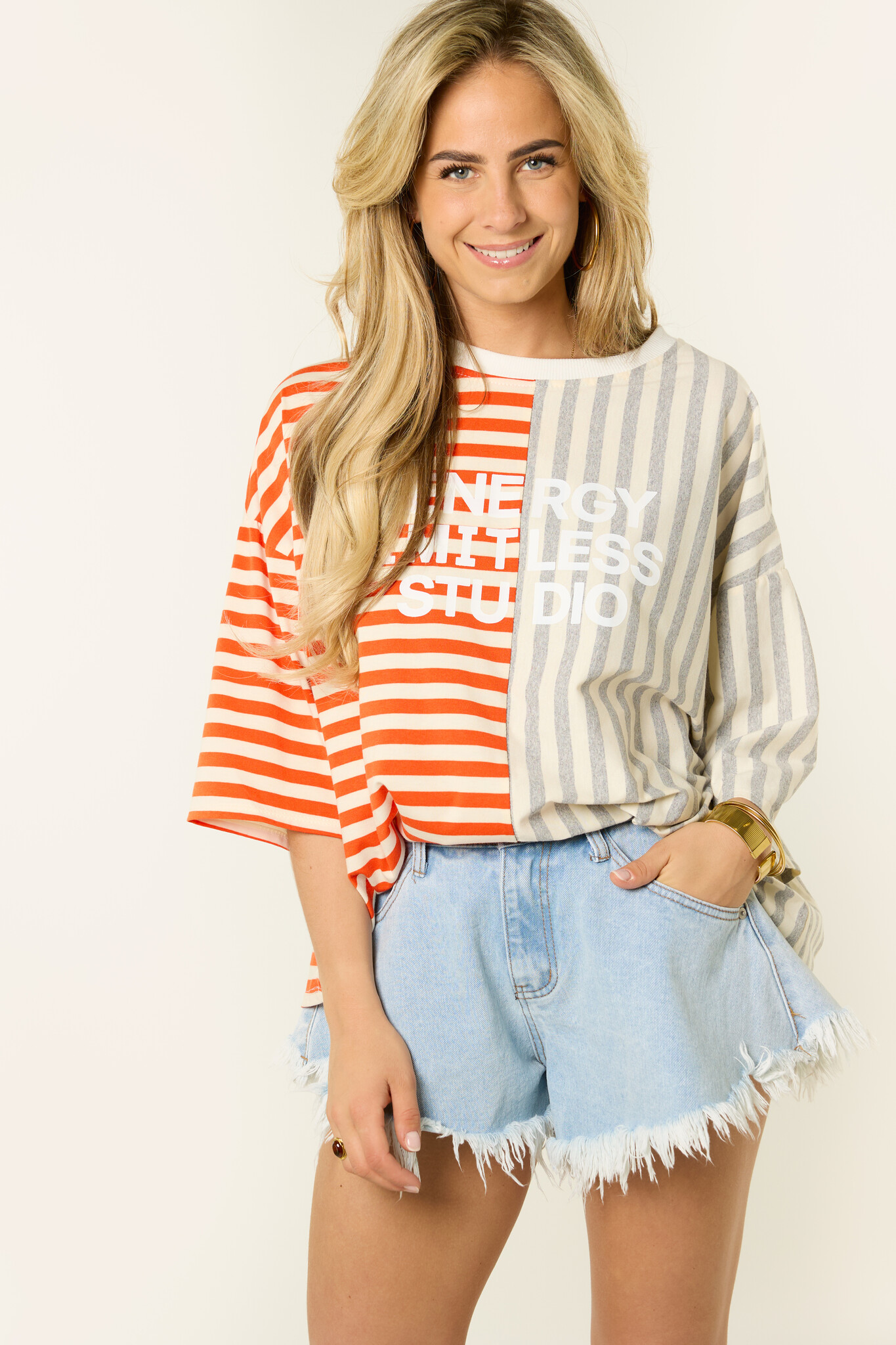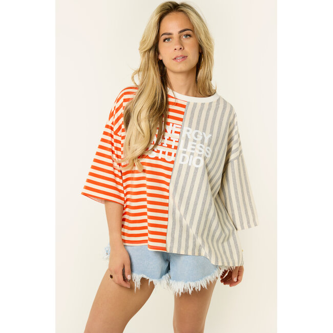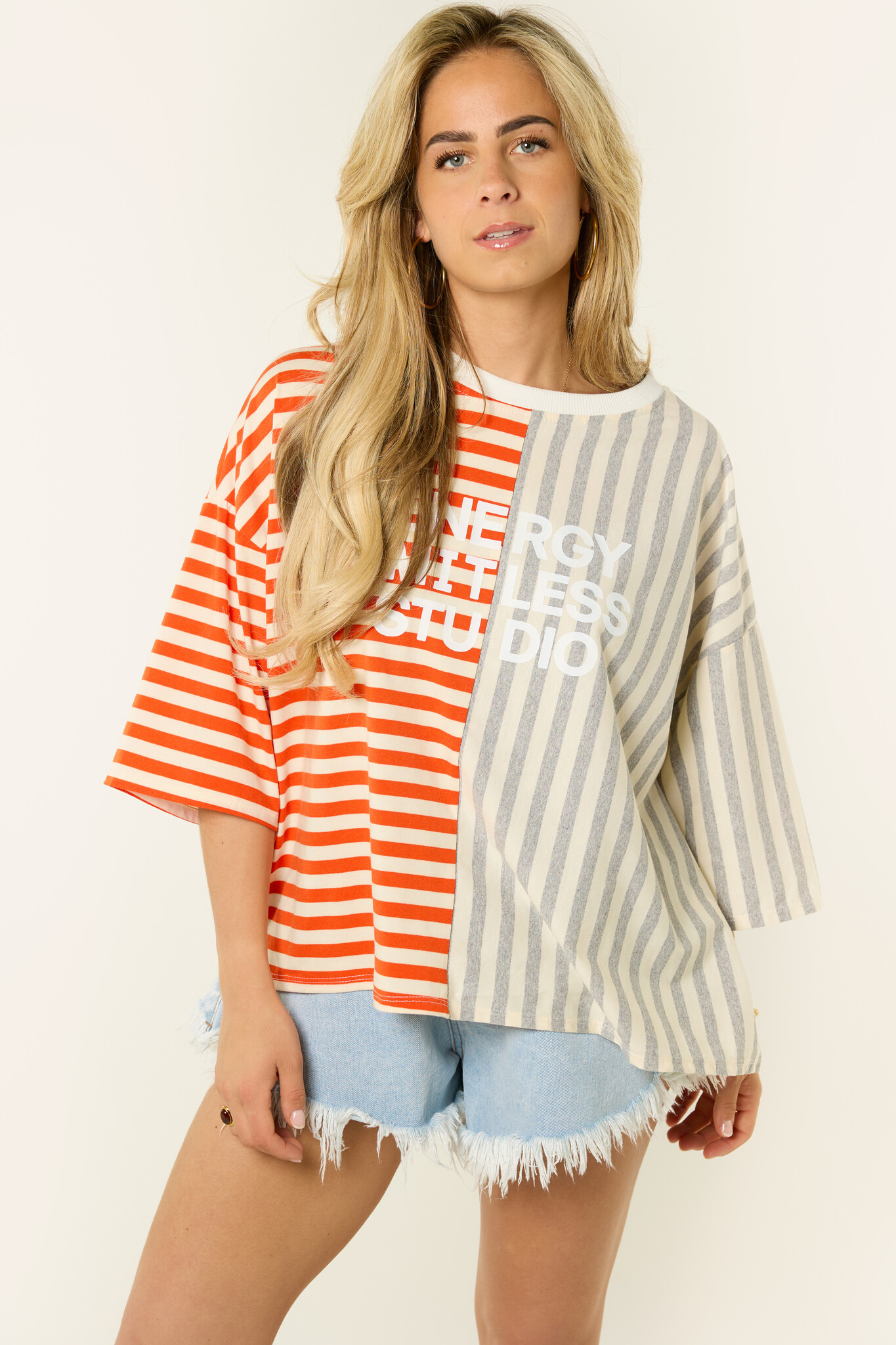 Dit oversized t-shirt is zo’n item dat meteen opvalt. De half and half strepen in oranje/wit en grijs/wit geven het shirt een speelse en trendy look, terwijl de tekstprint zorgt voor net dat beetje extra.