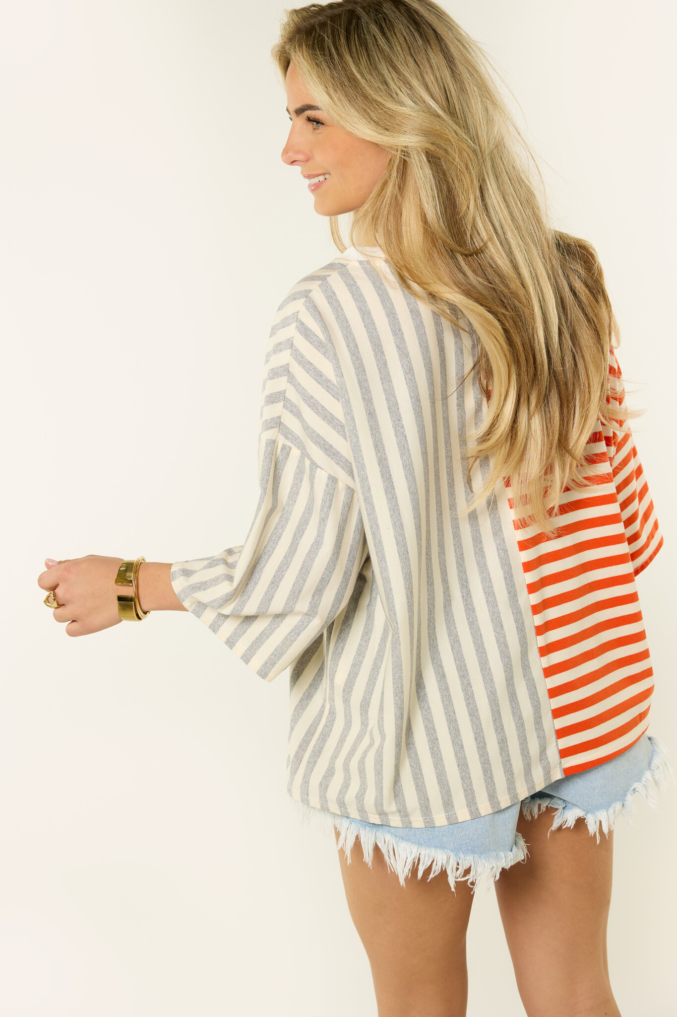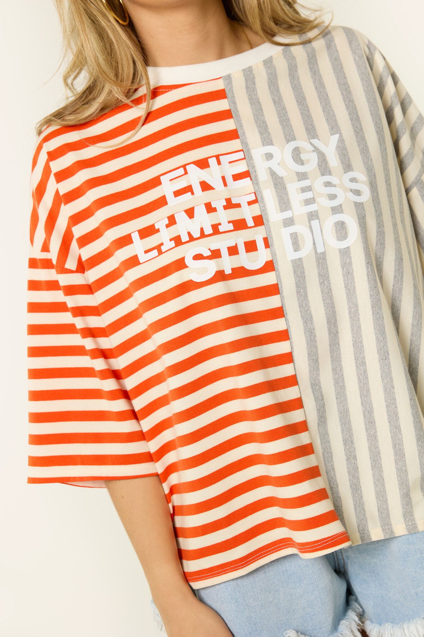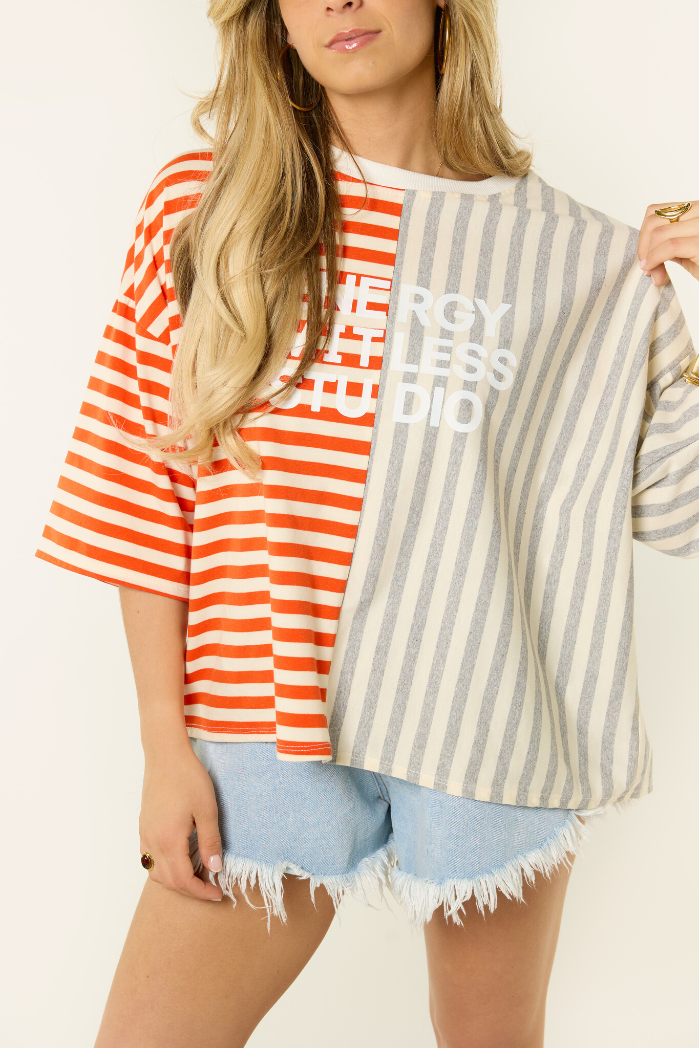 Dit oversized t-shirt is zo’n item dat meteen opvalt. De half and half strepen in oranje/wit en grijs/wit geven het shirt een speelse en trendy look, terwijl de tekstprint zorgt voor net dat beetje extra.