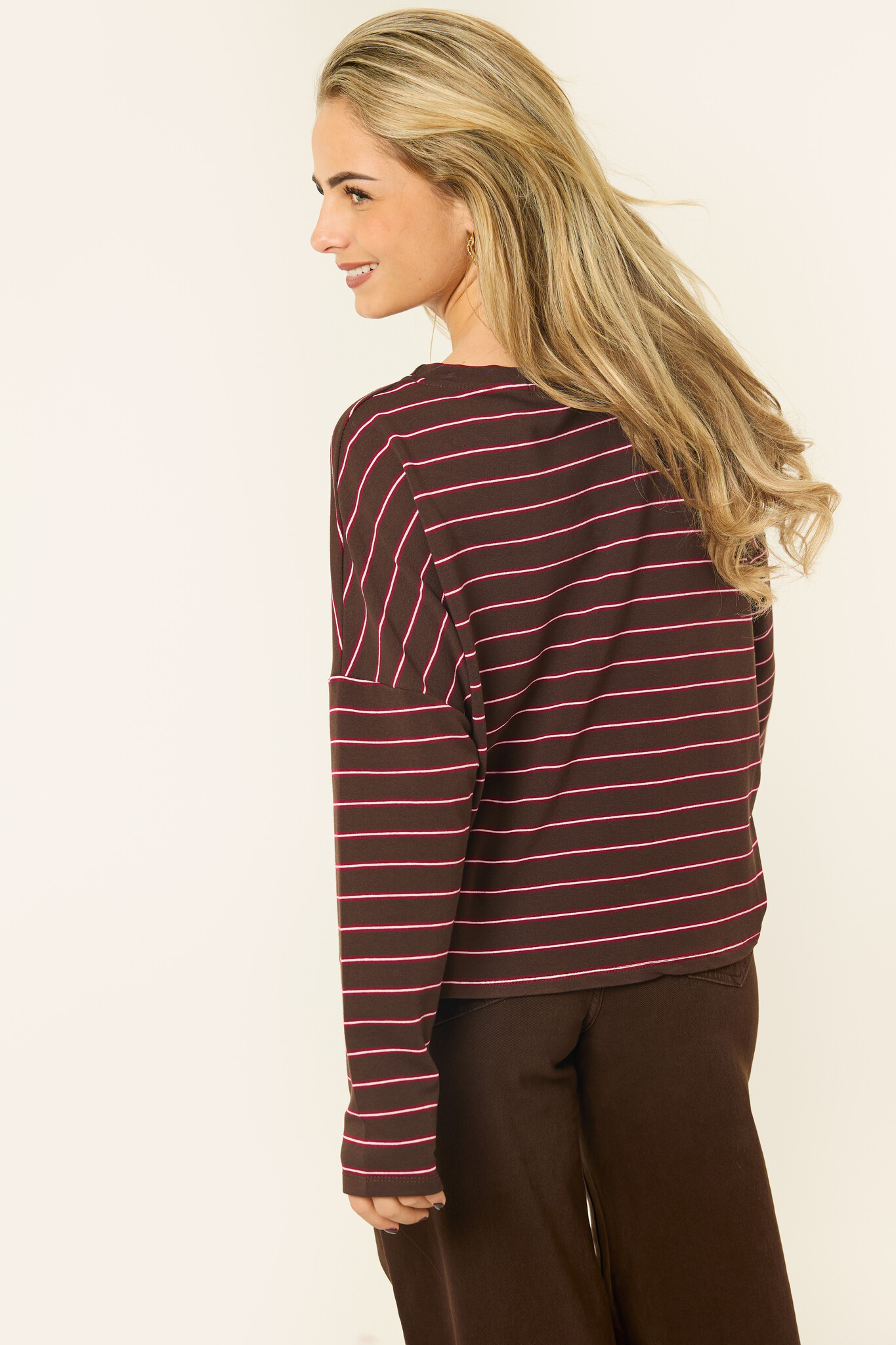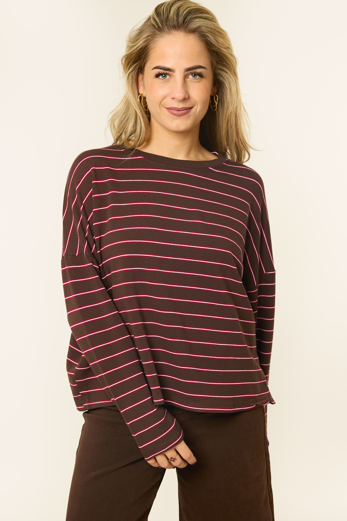 Deze bruin met roze gestreepte longsleeve is zo’n item dat je zonder nadenken aantrekt en toch meteen goed zit. Het shirt heeft een relaxte, iets oversized pasvorm waardoor hij comfortabel valt en lekker meebeweegt. De fijne roze strepen geven de longsleeve een fun touch, terwijl het zachte materiaal zorgt voor ultiem draagcomfort. Perfect voor iedere dag, of je het shirt met lange mouwen nu combineert met een jeans of een pantalon. Een veelzijdig en trendy striped longsleeve shirt dat je garderobe echt aanvult.
