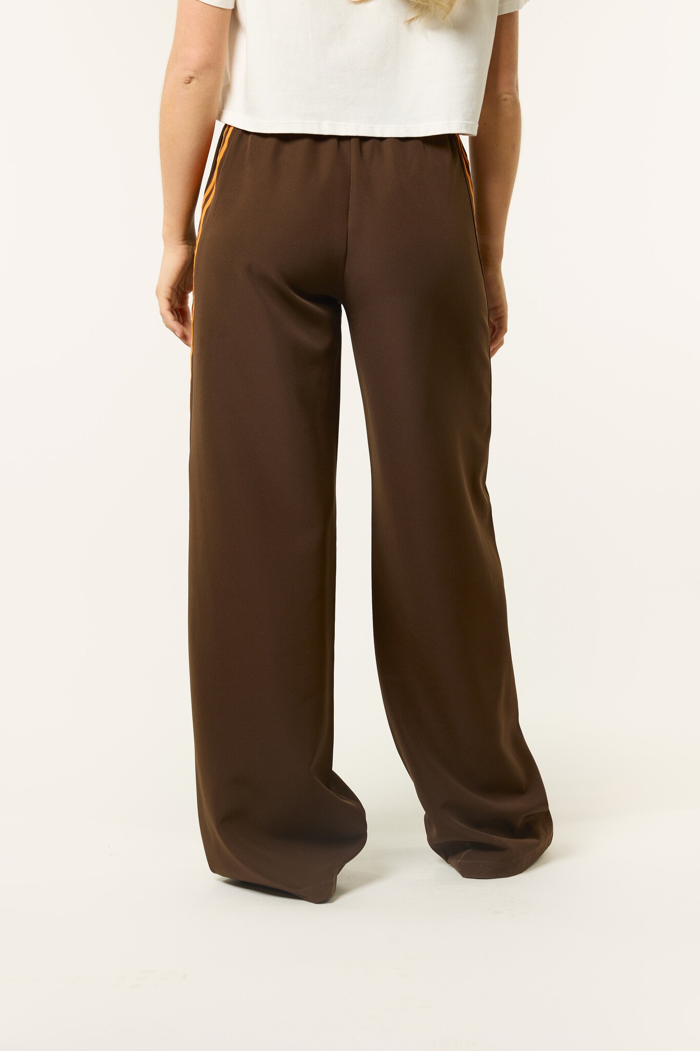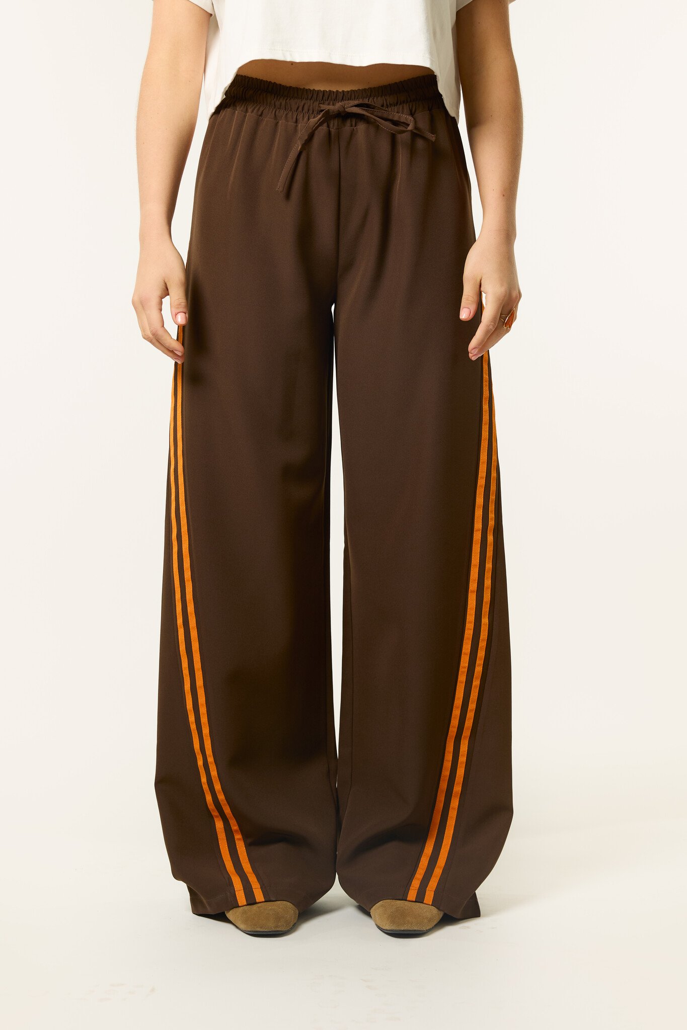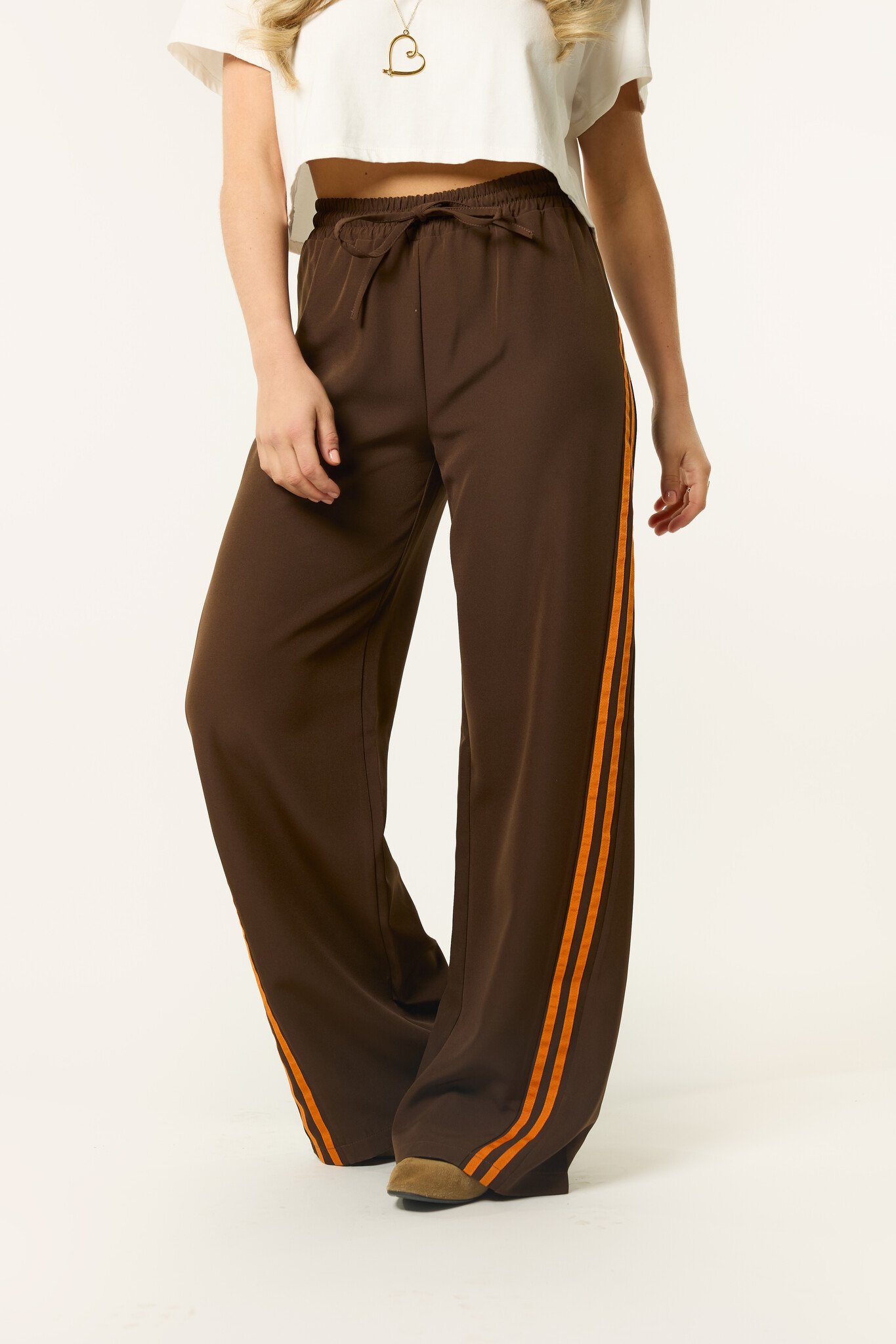 Deze bruine wide leg broek zit lekker en ziet er tegelijk leuk uit. De bruine broek heeft een elastische taille met strik detail en oranje strepen aan de zijkant, waardoor hij perfect is voor Koningsdag, maar ook daarna nog leuk te dragen blijft. Combineer de broek met een top, sweater of blazer voor een comfortabele en trendy look.
