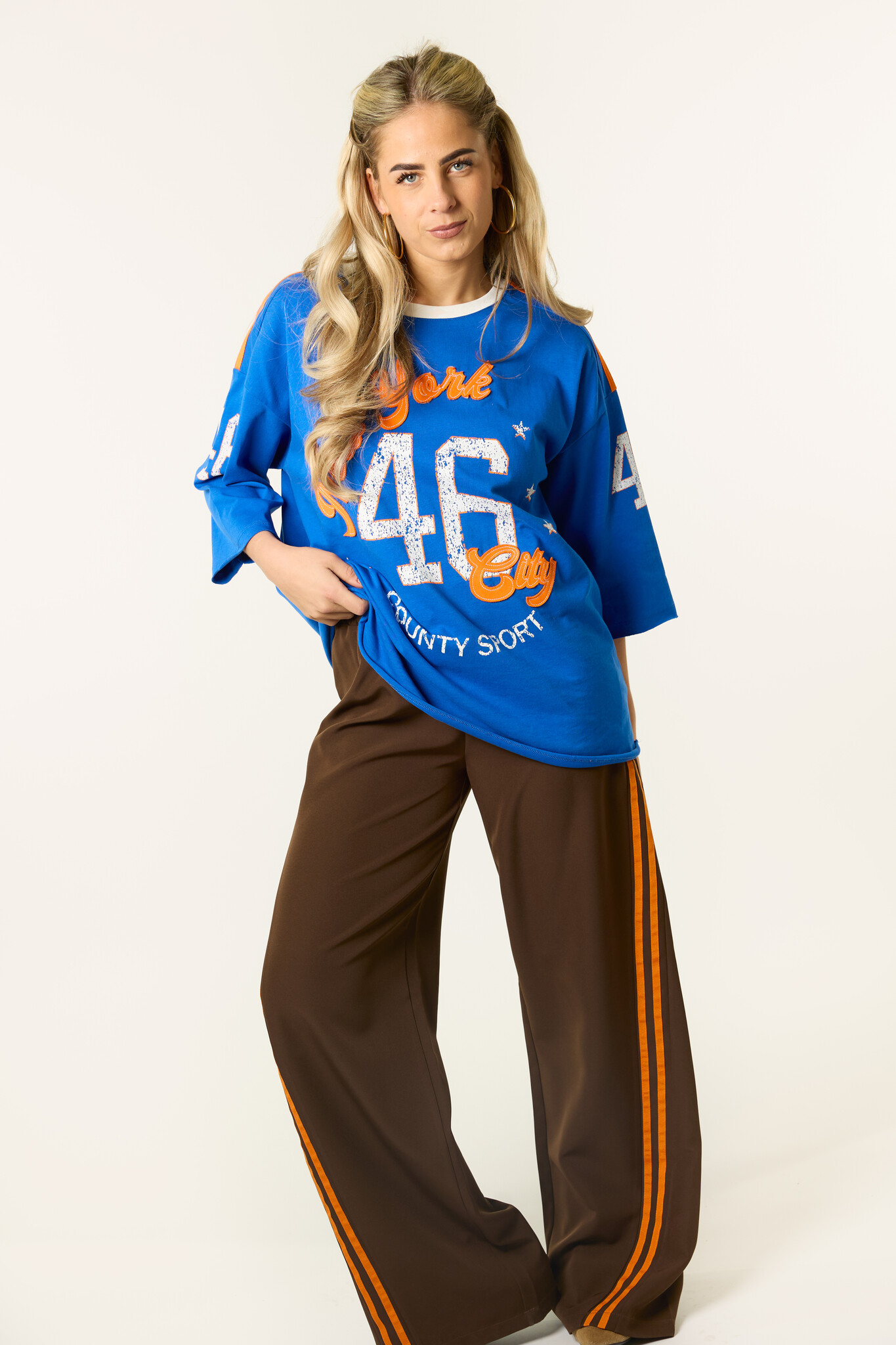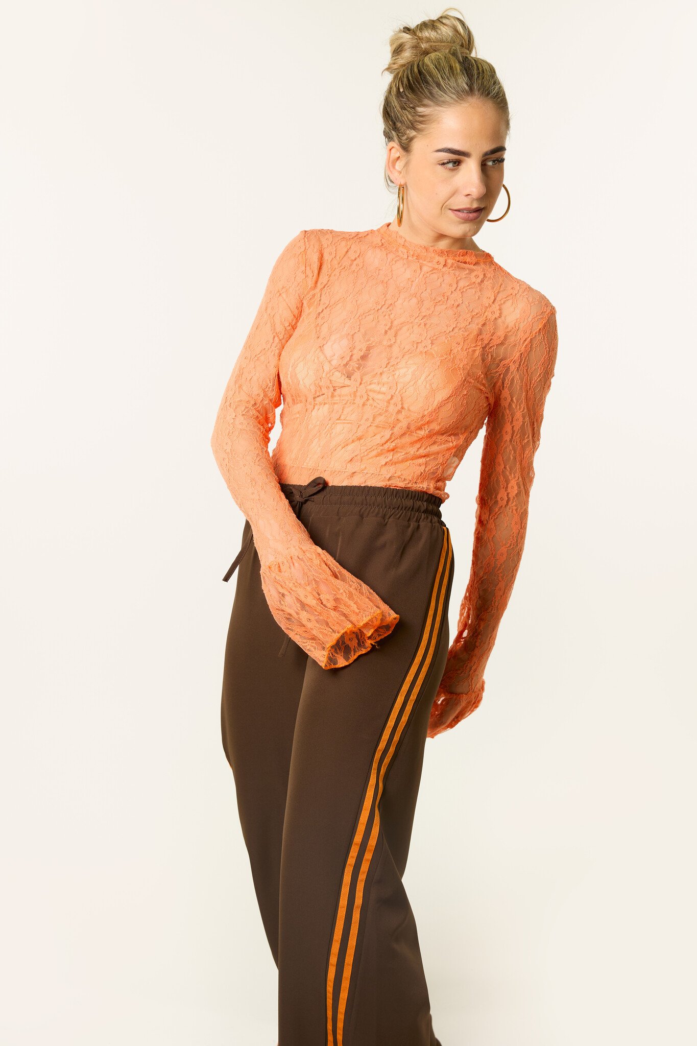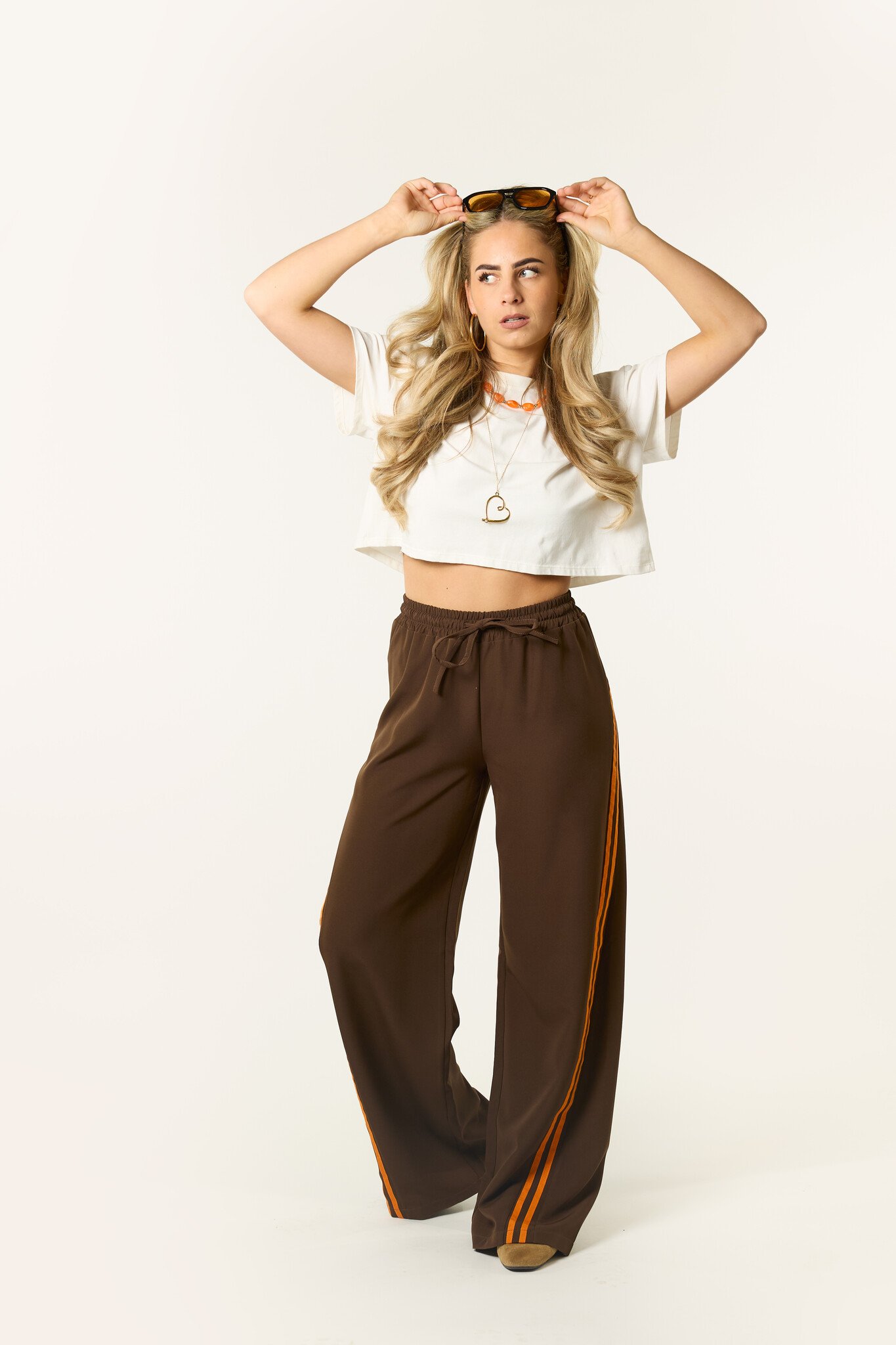 Deze bruine wide leg broek zit lekker en ziet er tegelijk leuk uit. De bruine broek heeft een elastische taille met strik detail en oranje strepen aan de zijkant, waardoor hij perfect is voor Koningsdag, maar ook daarna nog leuk te dragen blijft. Combineer de broek met een top, sweater of blazer voor een comfortabele en trendy look.