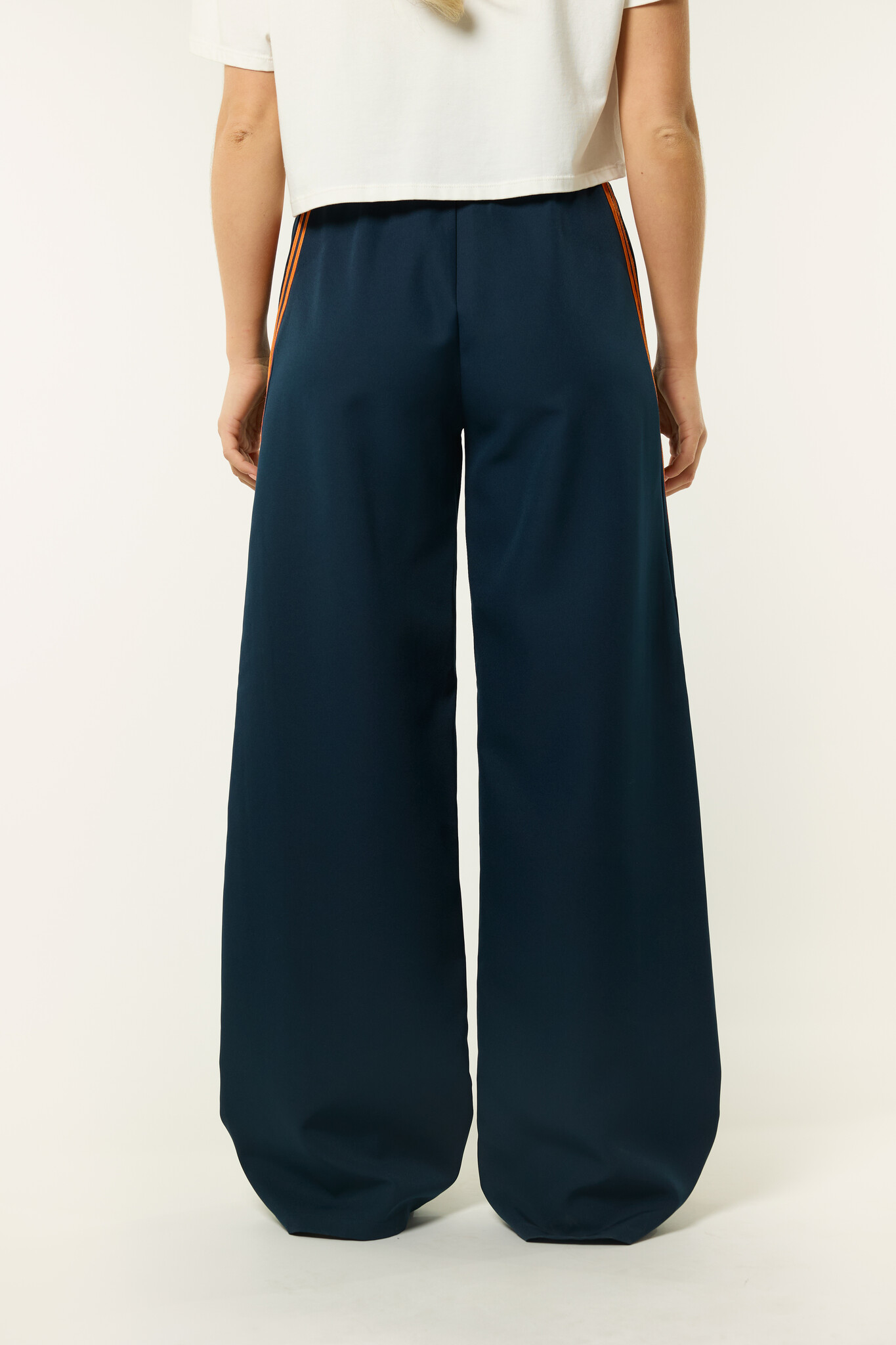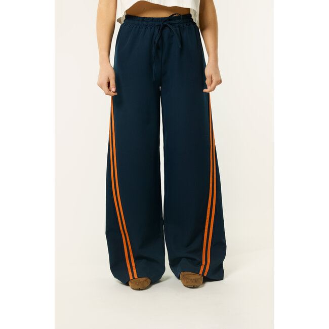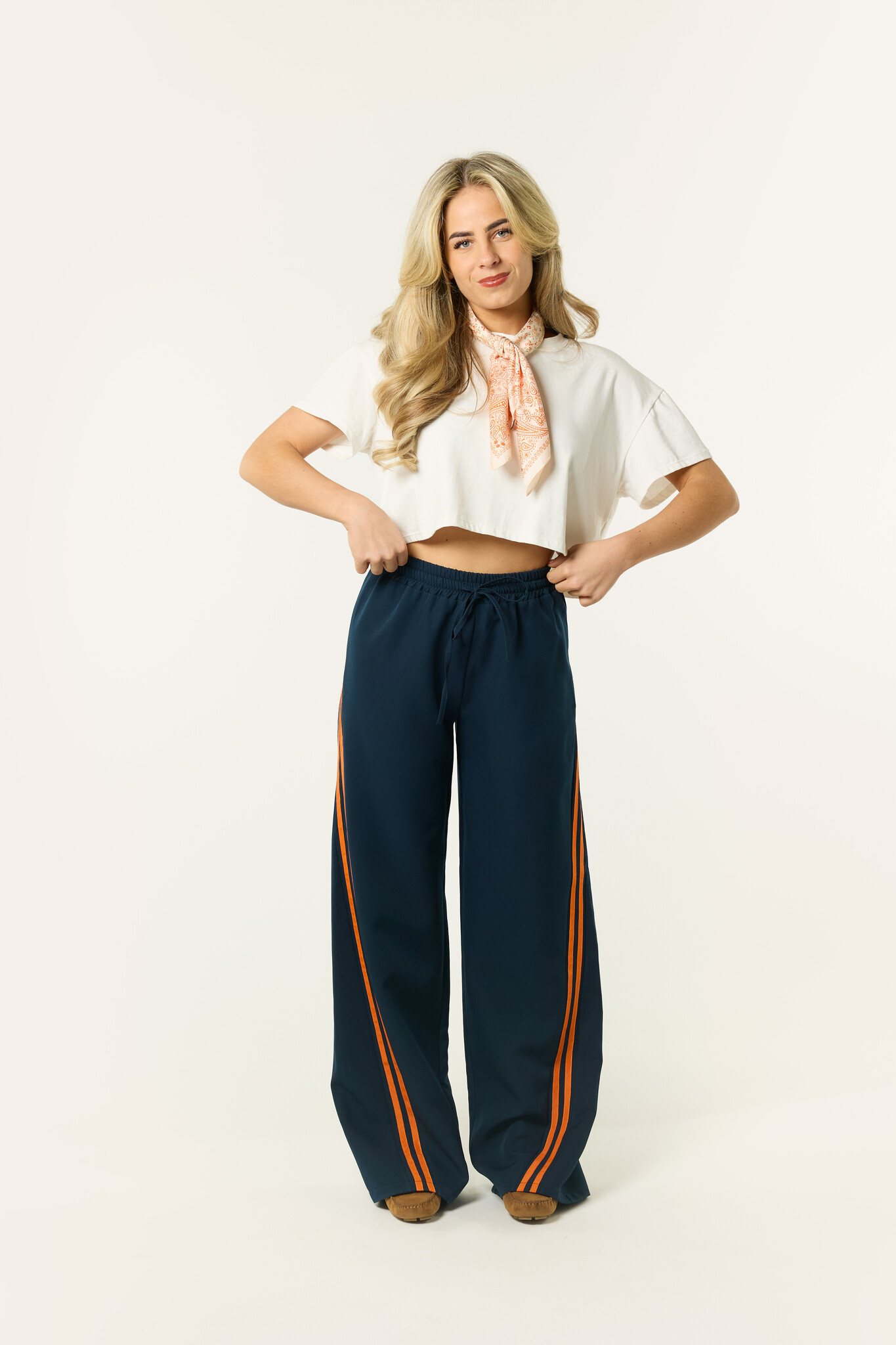 Deze donkerblauwe wide leg broek zit lekker en ziet er tegelijk leuk uit. De broek heeft een elastische taille met strik detail en oranje strepen aan de zijkant, waardoor hij perfect is voor Koningsdag, maar ook daarna nog leuk te dragen blijft. Combineer de broek met een top, sweater of blazer voor een comfortabele en trendy look.