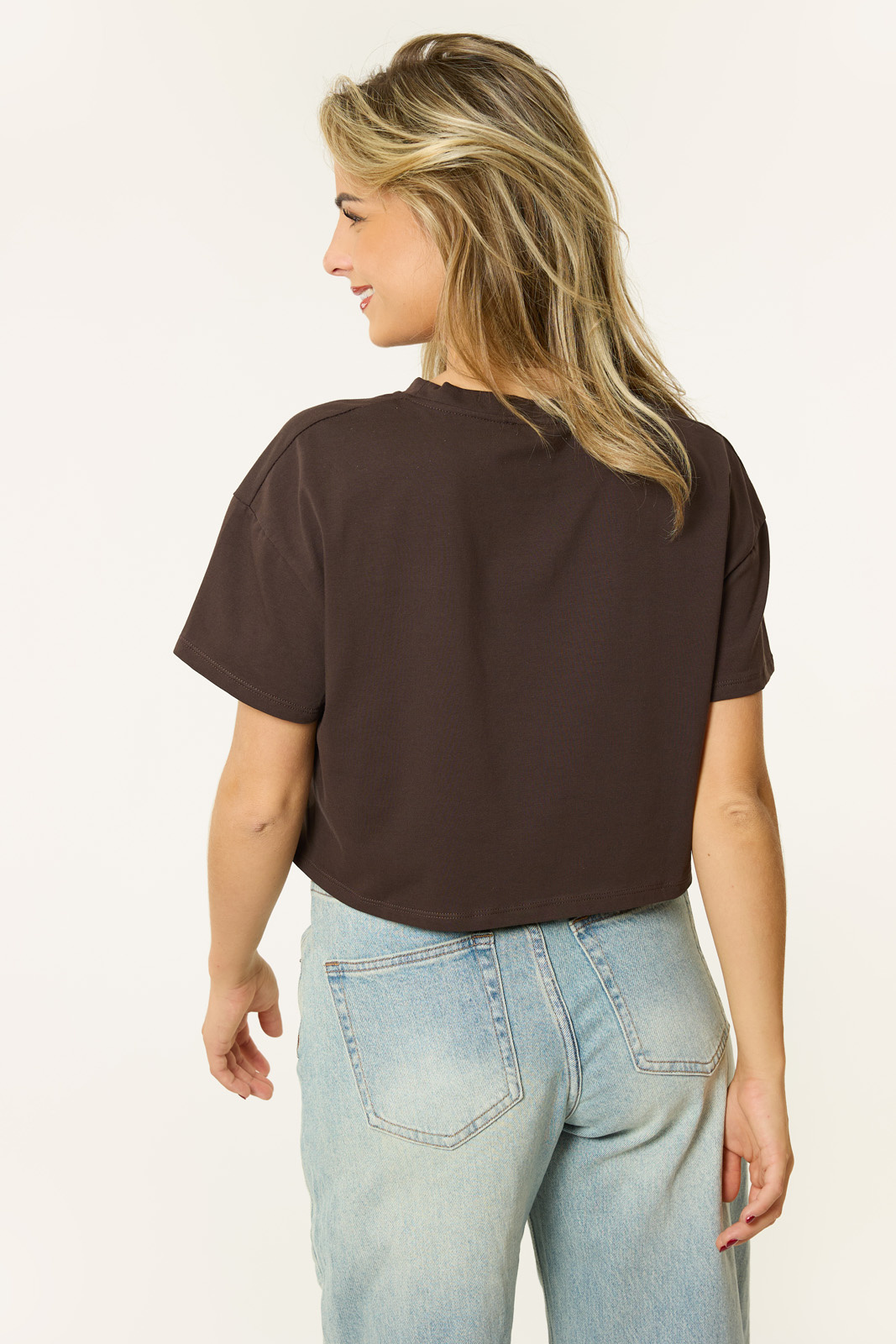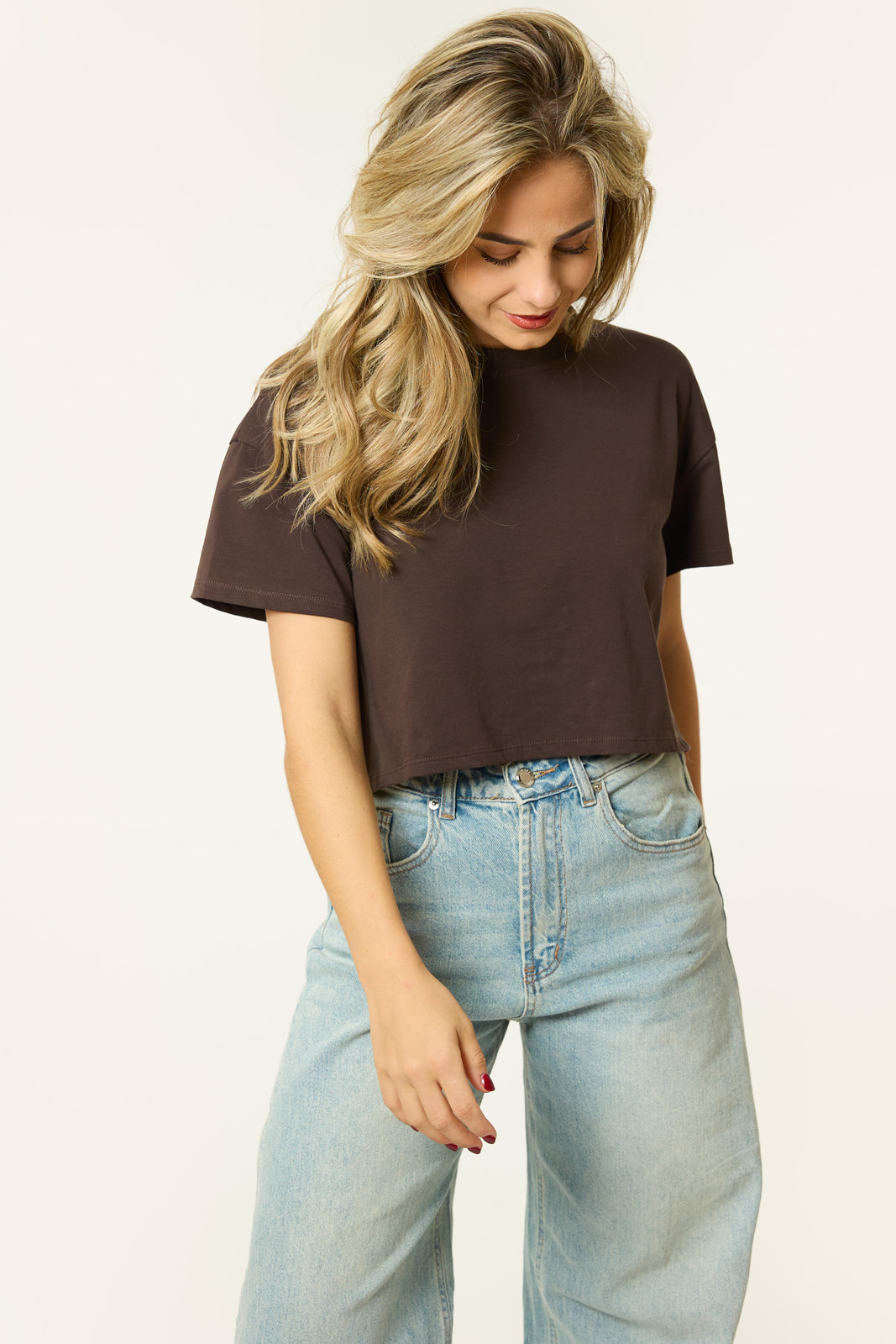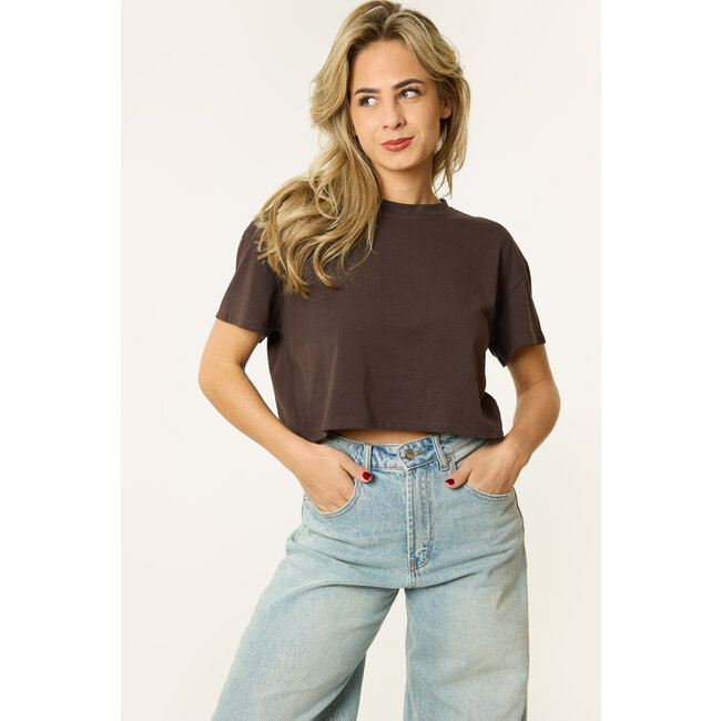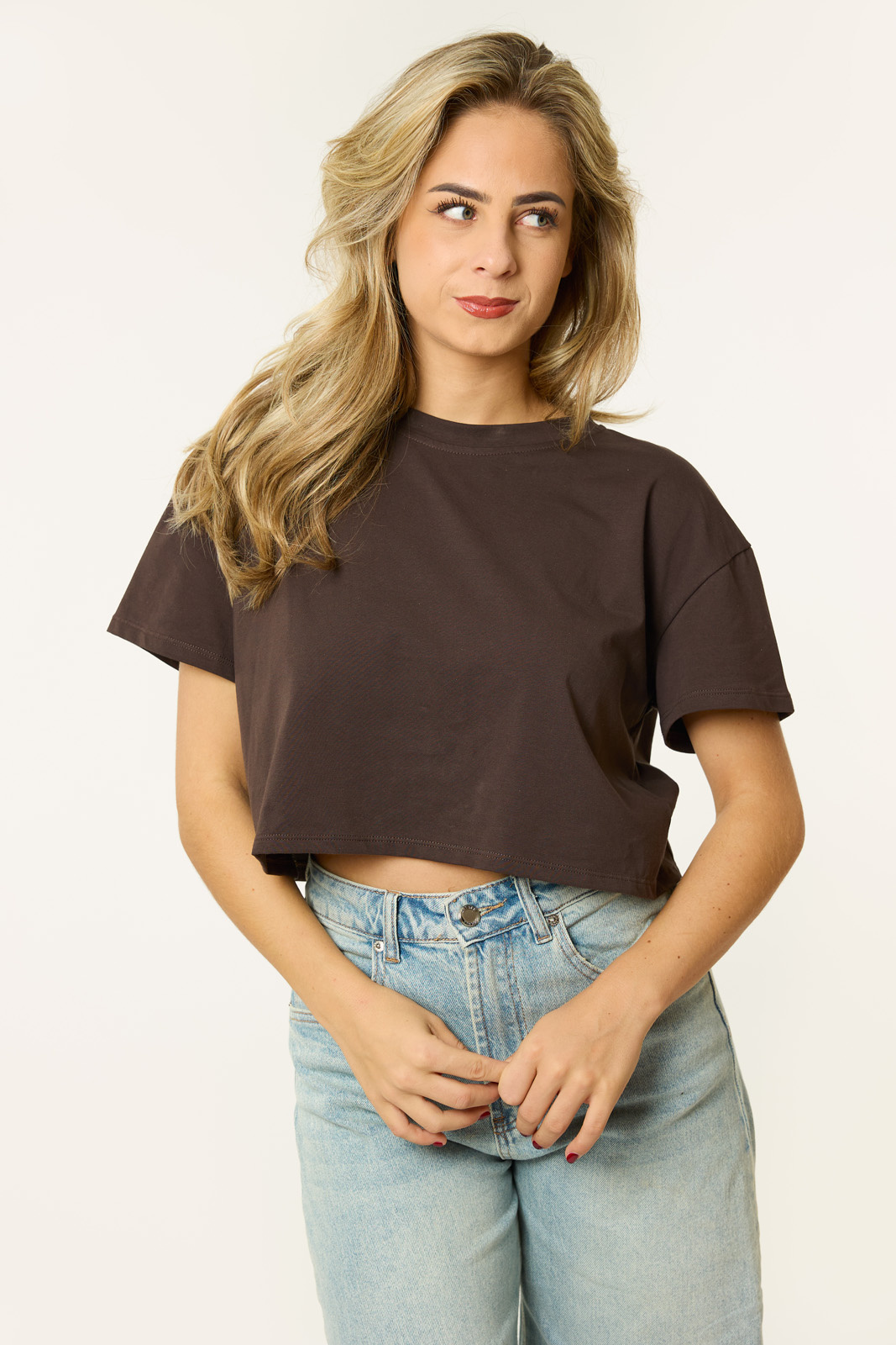 Deze bruine crop top is een echte musthave voor dit seizoen. De warme kleur matcht perfect met jeans of lichte tinten en geeft je outfit een cozy maar toch trendy vibe. Dankzij de cropped fit creëer je moeiteloos een moderne look die je zowel casual als stijlvol kunt dragen.