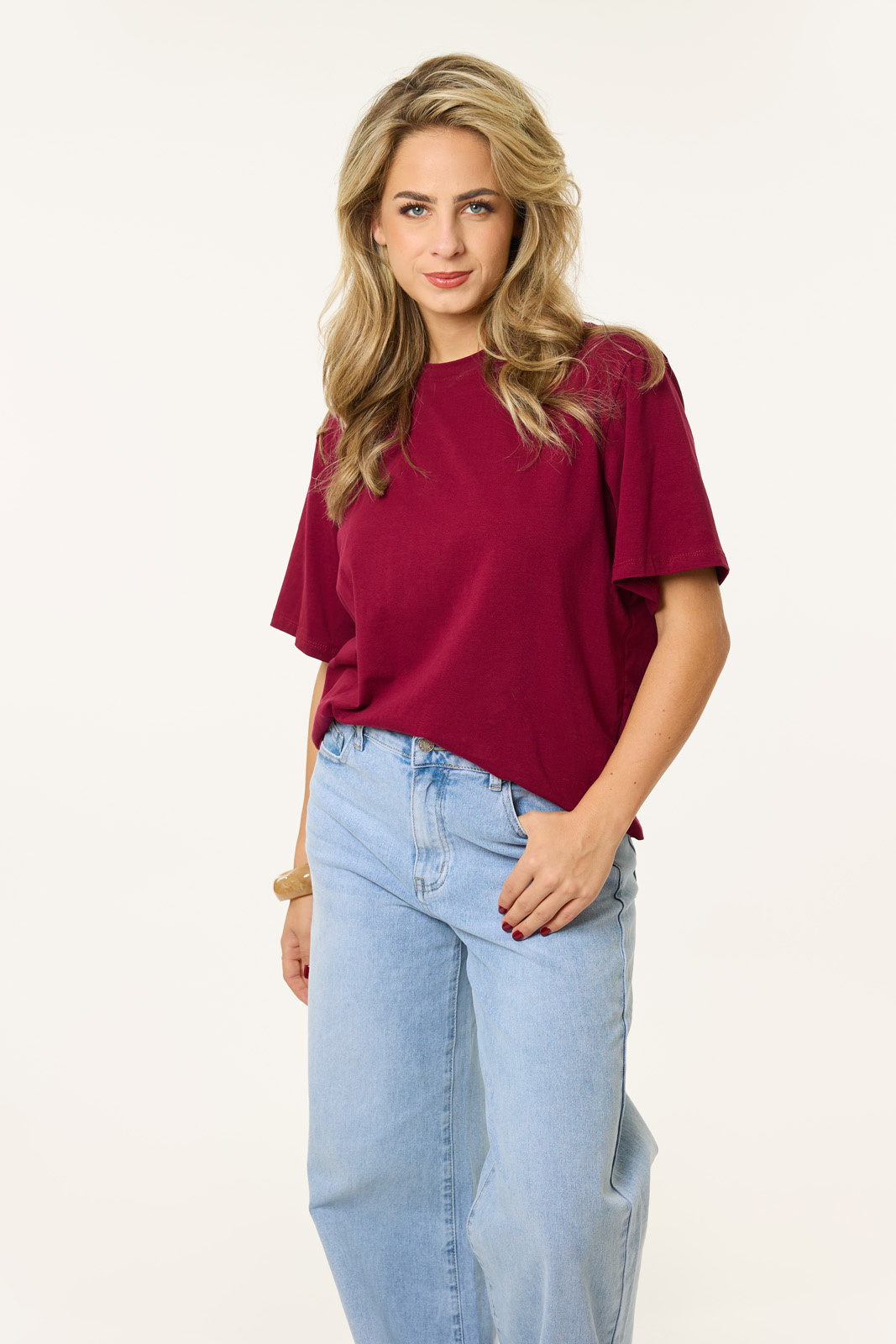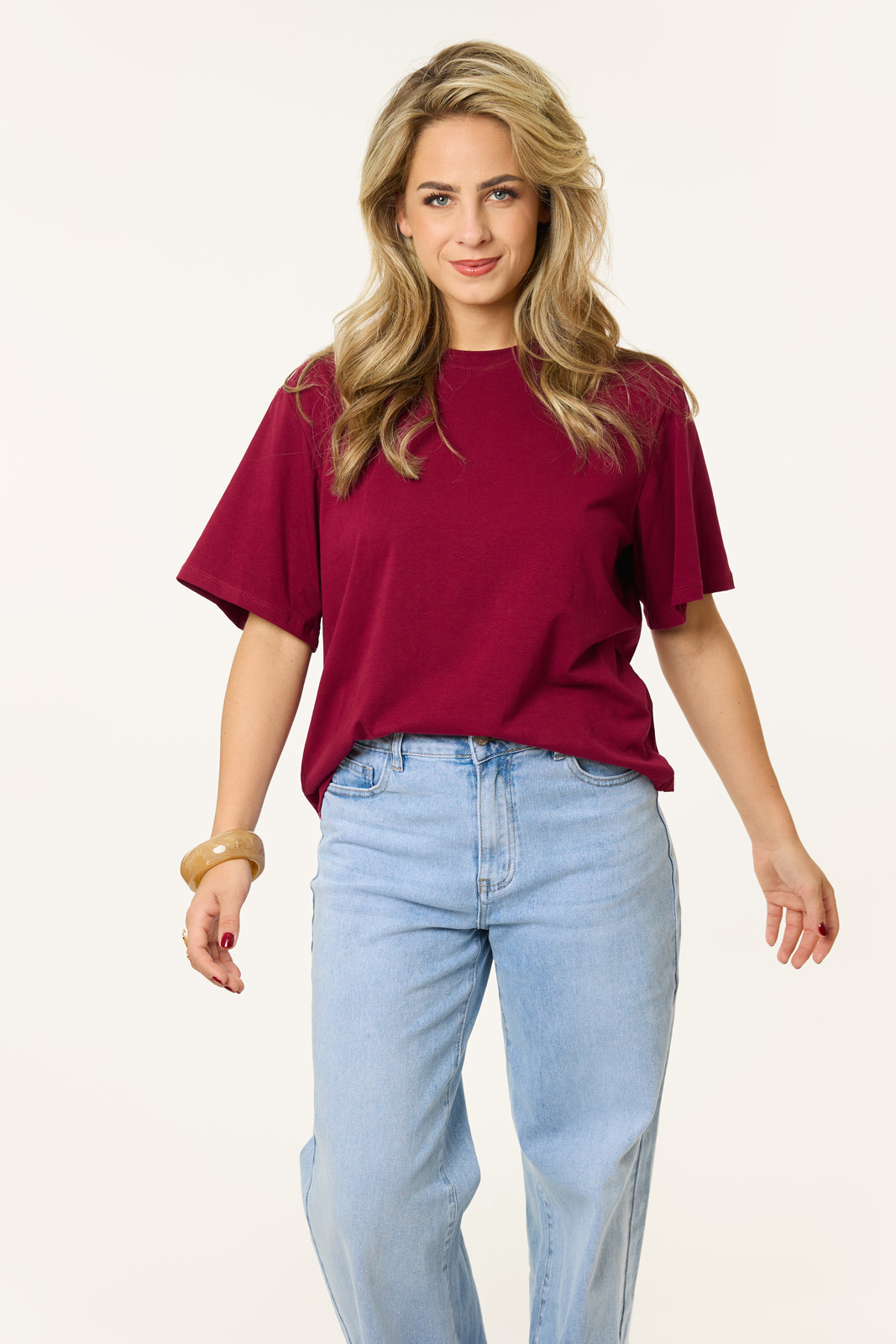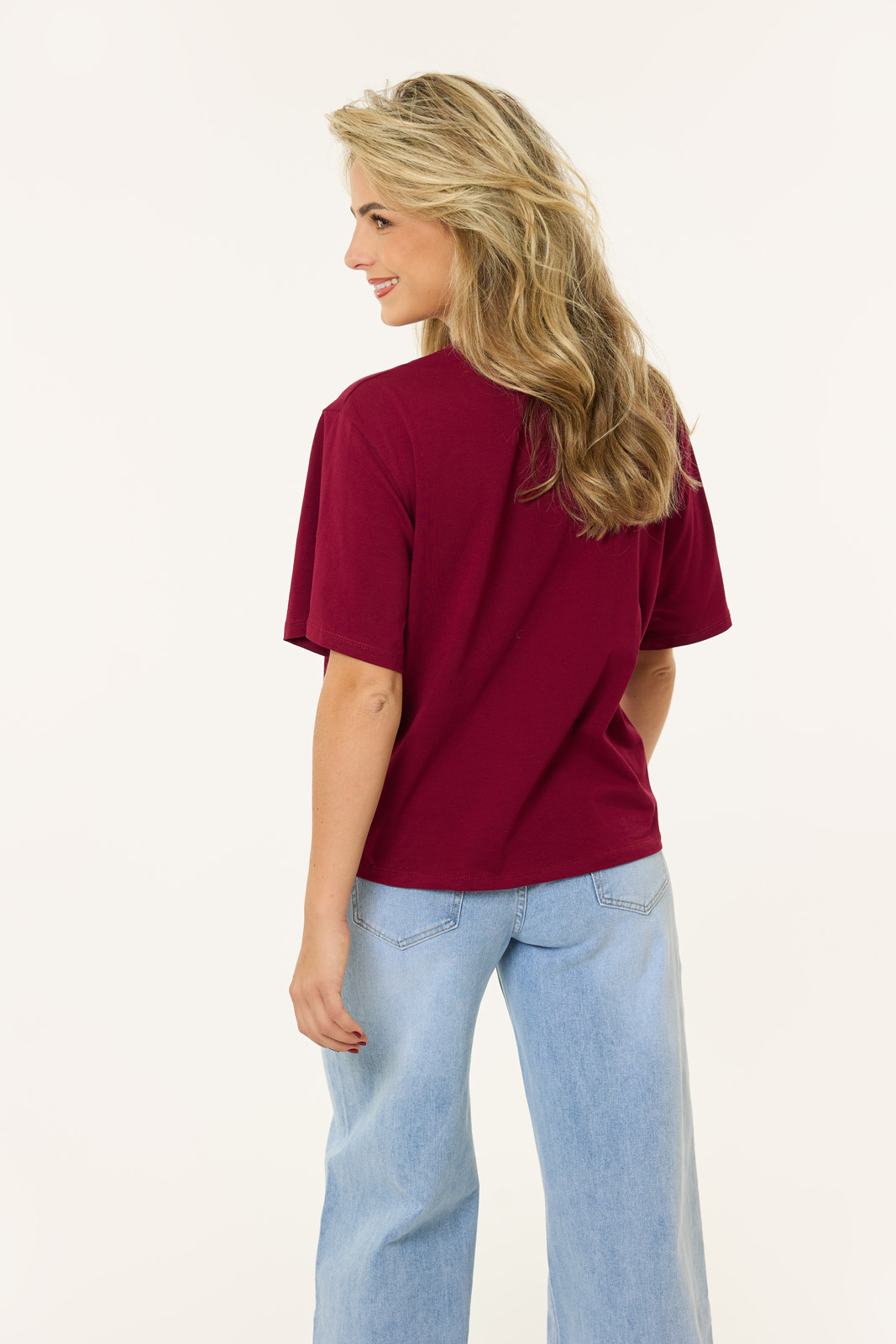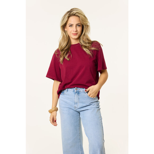 Dit bordeaux rode T-shirt is de wardrobe essential die je nodig hebt voor aankomende herfst. Perfect om te layeren met een bomberjacket en om te combineren met een opvallende jeans of shorts, dit shirt past overal bij.