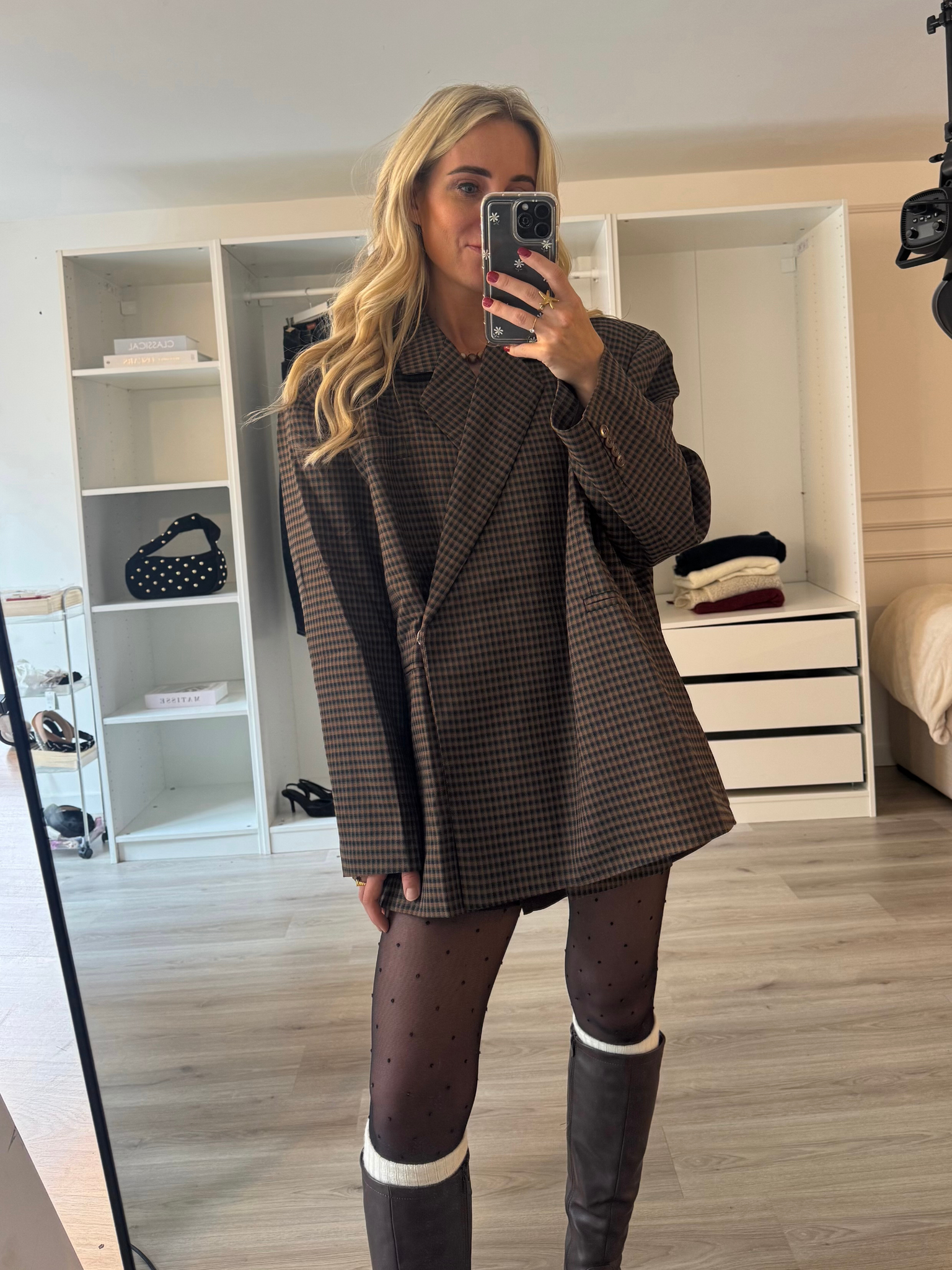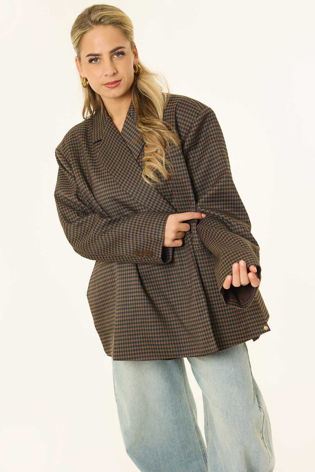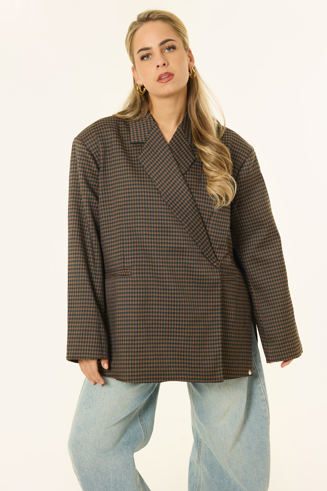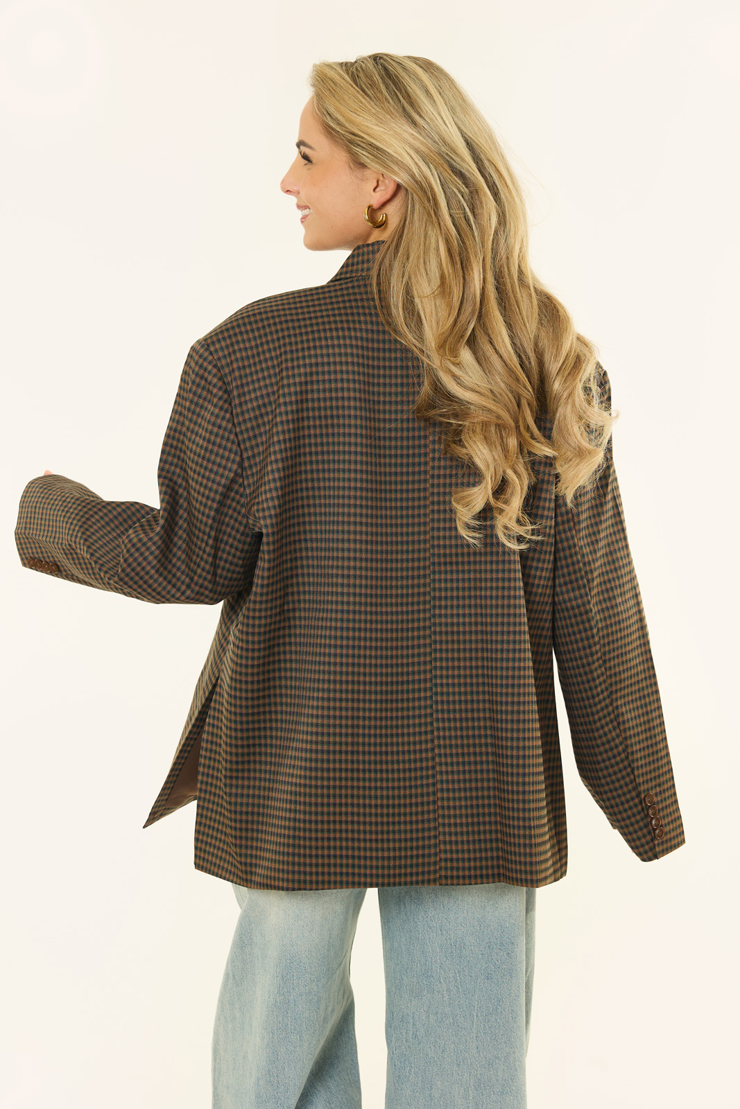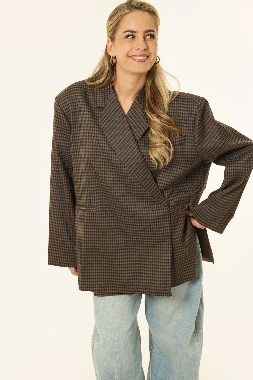 Deze bruine oversized geruite blazer is een echte eyecatcher voor het najaar. De warme bruine tint in combinatie met de subtiele ruitprint geeft je outfit direct een stijlvolle, tijdloze uitstraling, terwijl de losse pasvorm zorgt voor die moderne, effortless vibe. Dankzij de iets langere lengte draag je de blazer zowel als blazerjurk met laarzen als casual over een jeans met een knit. De schoudervullingen en double-breasted sluiting maken de look helemaal compleet, klaar voor het nieuwe seizoen.