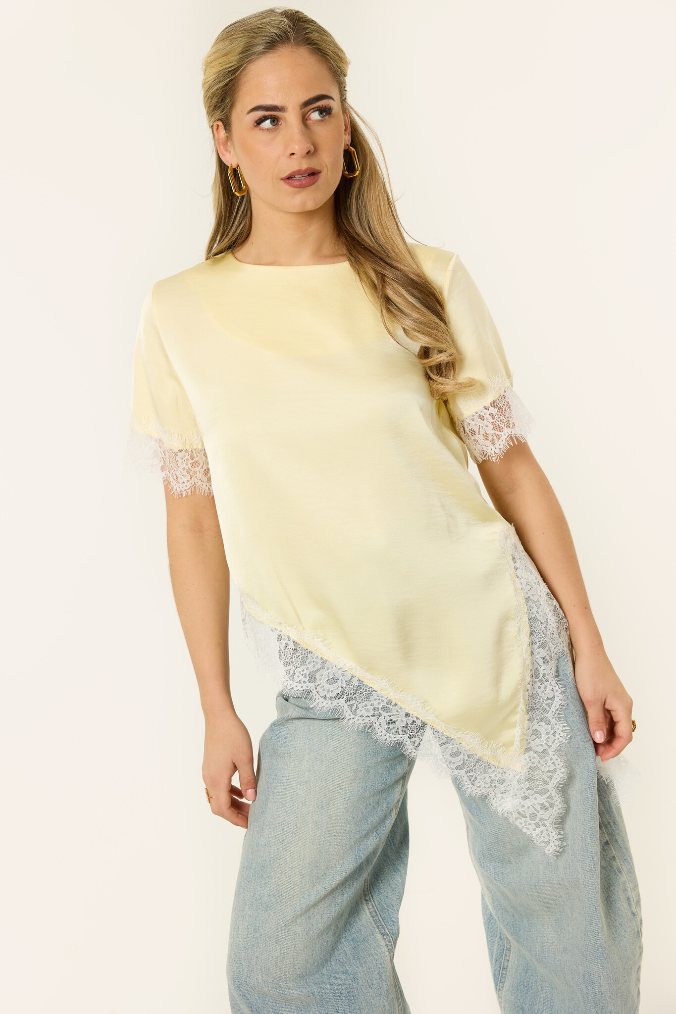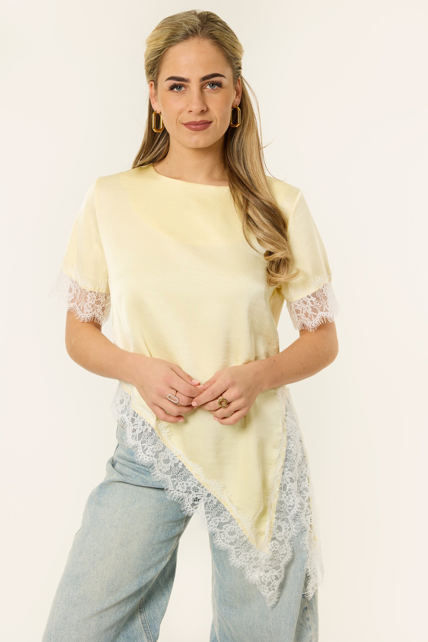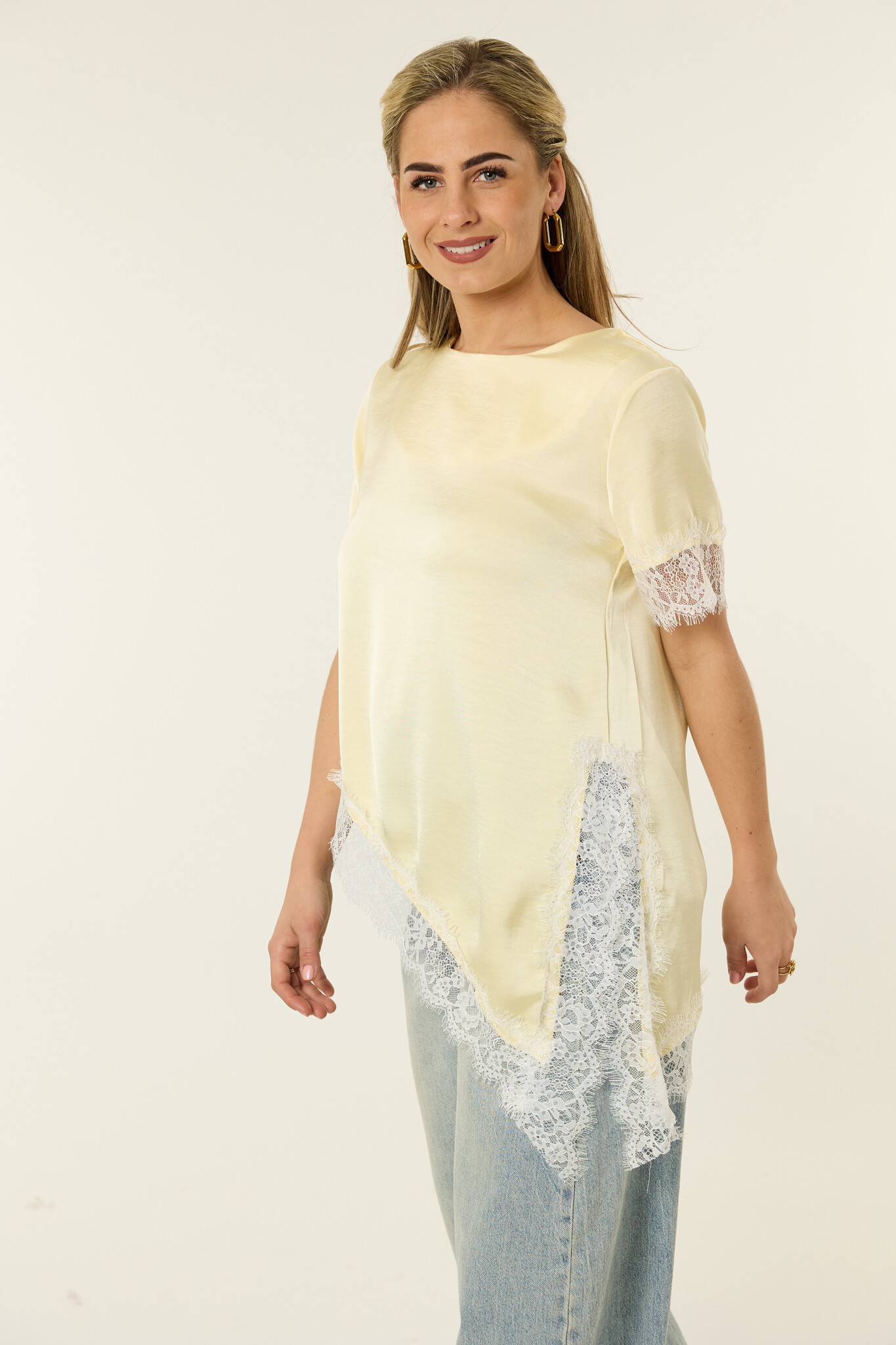 Deze gele top met satijne look is een echte eyecatcher die je outfit meteen een frisse en stijlvolle uitstraling geeft. De soepelvallende stof heeft een zachte glans en voelt licht en comfortabel aan. De kanten details aan de mouwen en onderkant zorgen voor een vrouwelijke touch en maken de top net wat specialer dan een basic shirt. Door de losvallende pasvorm valt hij mooi en draag je ’m moeiteloos de hele dag. Combineer met een jeans voor een frisse, casual look of met een pantalon voor een meer geklede outfit. Zo’n top die je makkelijk styled, maar er altijd leuk uitziet.