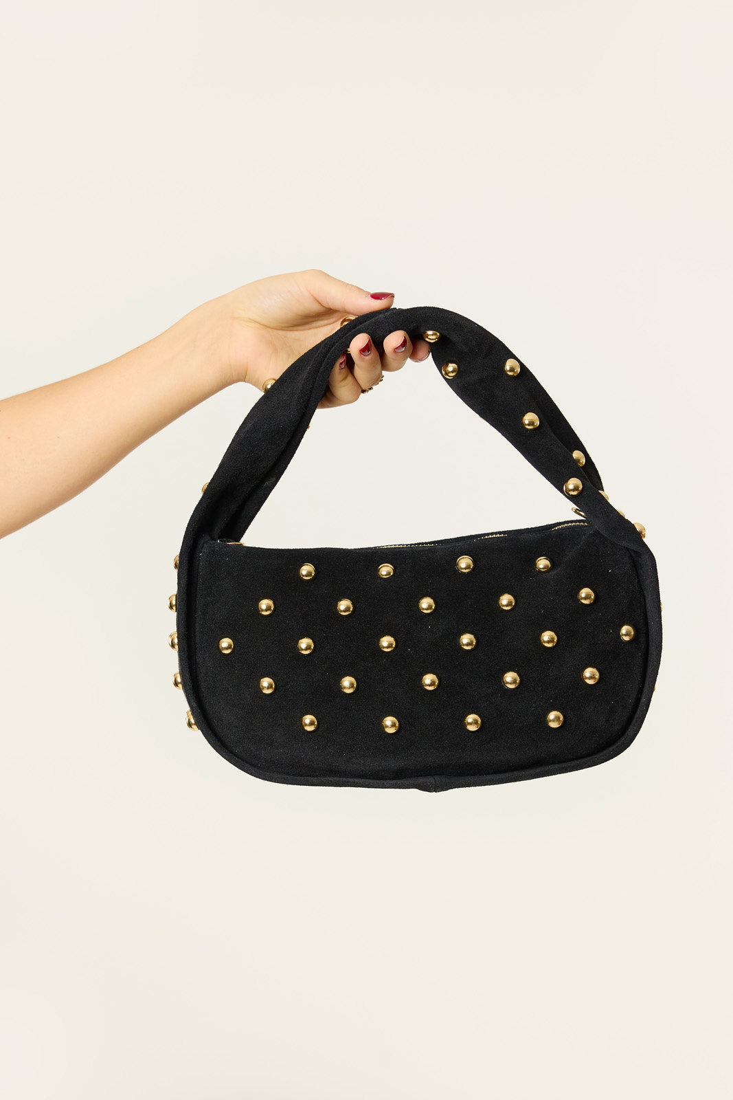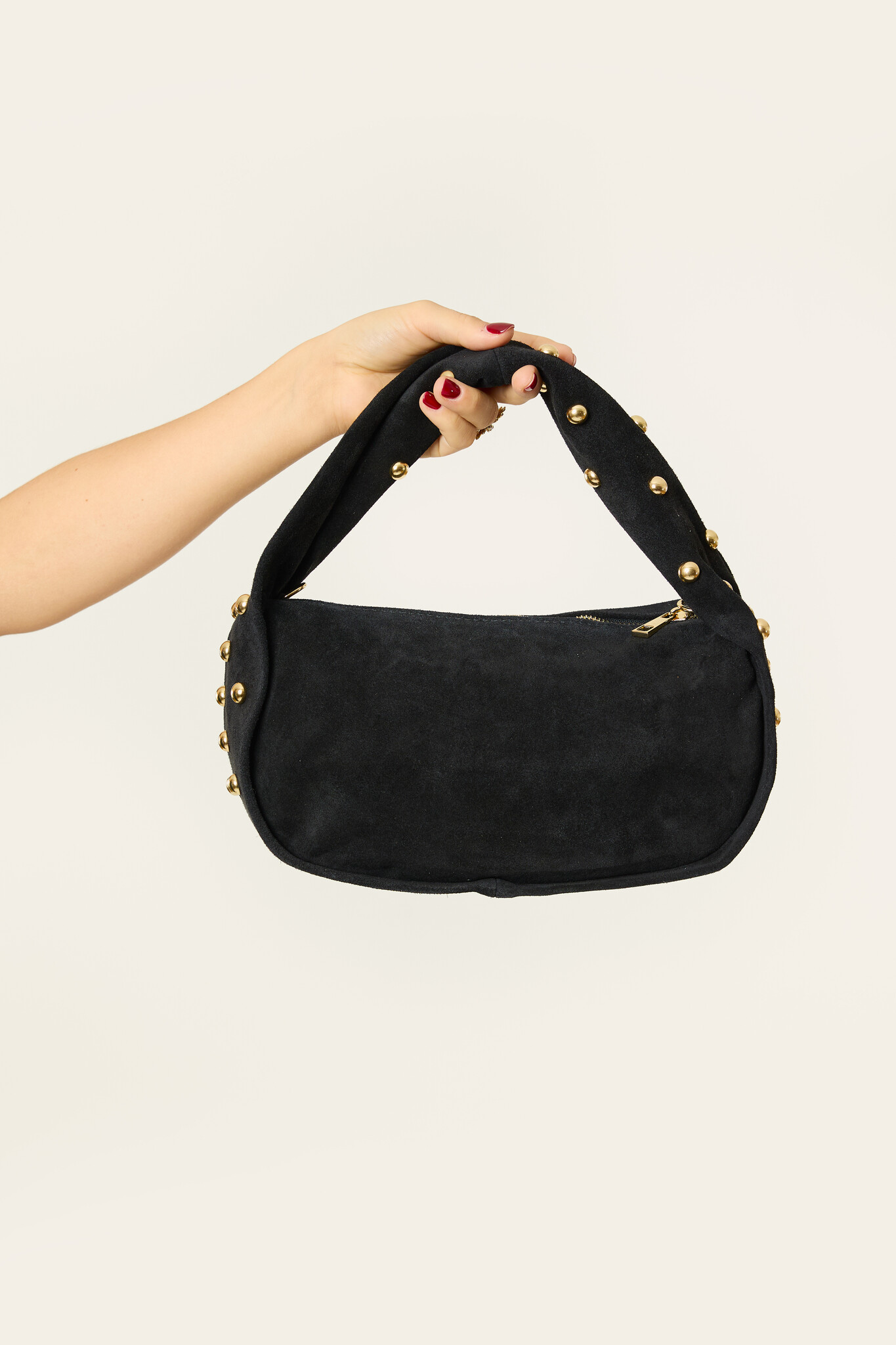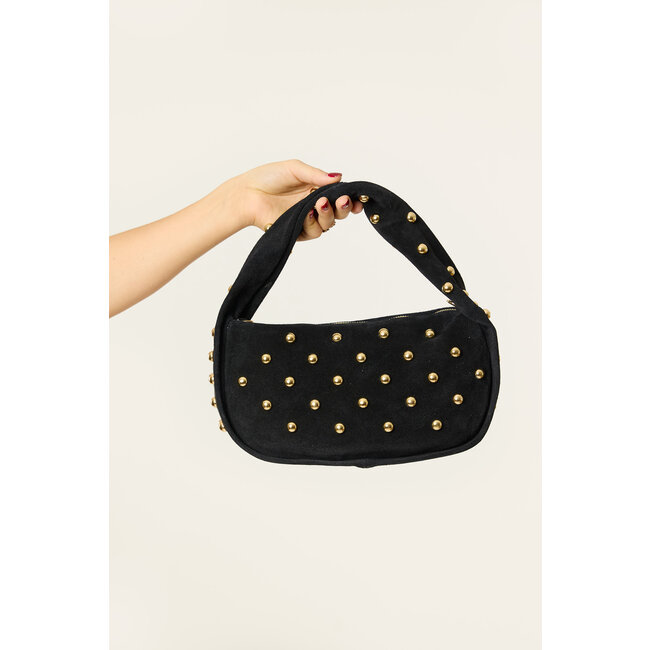 Deze zwarte suède tas is de perfecte mix van basic en statement. Suede is helemaal de trend van aankomend najaar samen met de gouden studs. De tas is ruim genoeg voor al je essentials, ideaal voor dagelijks gebruik of een avond uit.