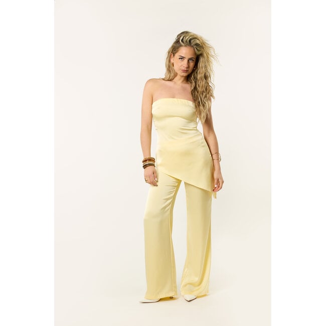 De gele satijnen top kun je makkelijk los combineren met een jeans, rok of pantalon. Ga je liever voor een complete look? Draag hem dan samen met de bijpassende satijnen broek voor een stijlvolle set.