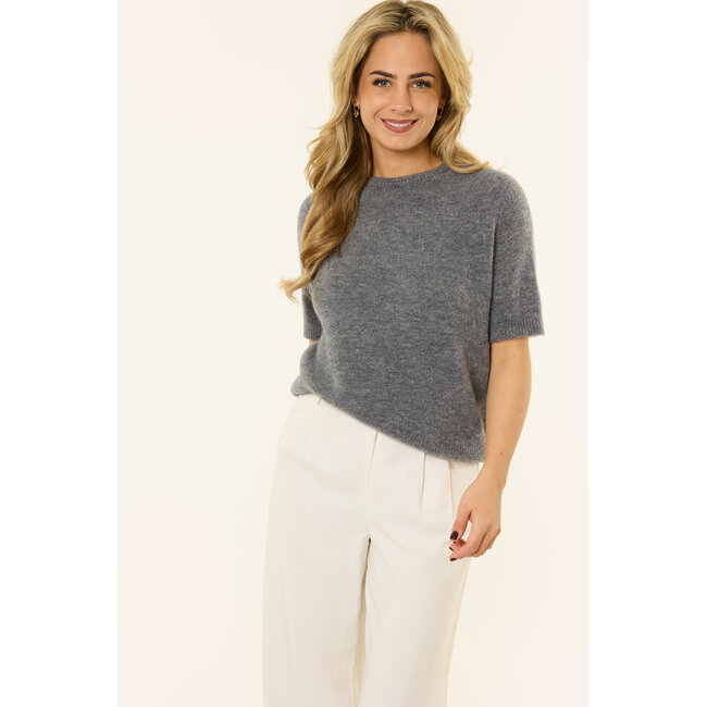 Deze grijze top is de perfecte mix van comfy en stijlvol. De zachte, wollige stof voelt heerlijk aan en is de perfecte kleur die overal bij past. Met de korte mouwen en rechte pasvorm is het makkelijk te combineren en dus de perfecte basic voor al je outfits!