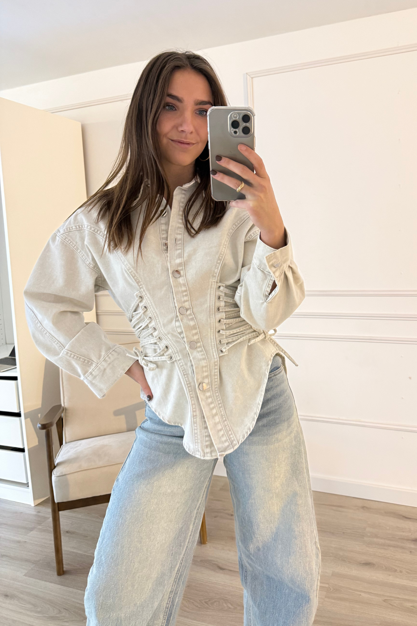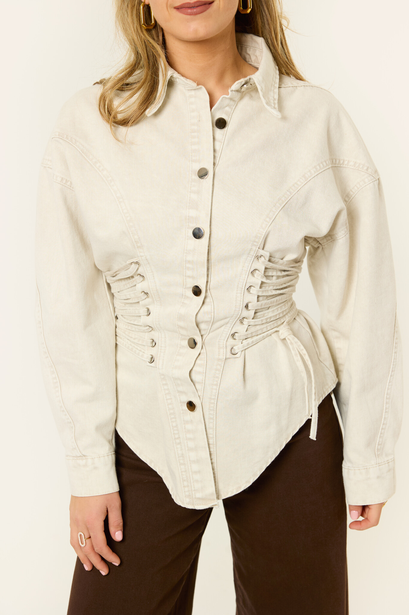 Deze getailleerde denim jacket is een echte statement piece. De lichte wassing geeft de top een frisse uitstraling, terwijl de veters aan de zijkant zorgen voor een mooi, vrouwelijk silhouet dat je zelf kunt aanpassen. De stevige maar soepelvallende stof zit comfortabel en valt mooi om het lichaam. Met de klassieke kraag en knoopsluiting heeft de jacket een stoere touch, terwijl de fit juist elegant blijft. Draag de beige denim jacket als statement piece op een jeans of pantalon.
