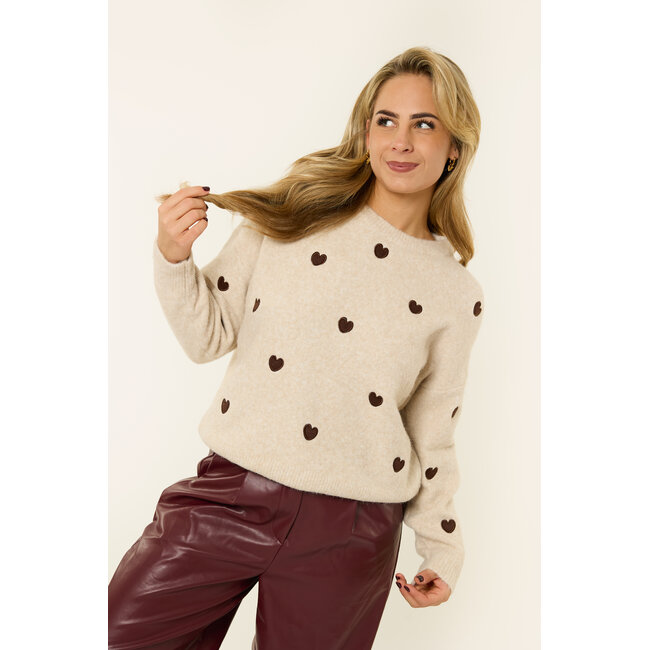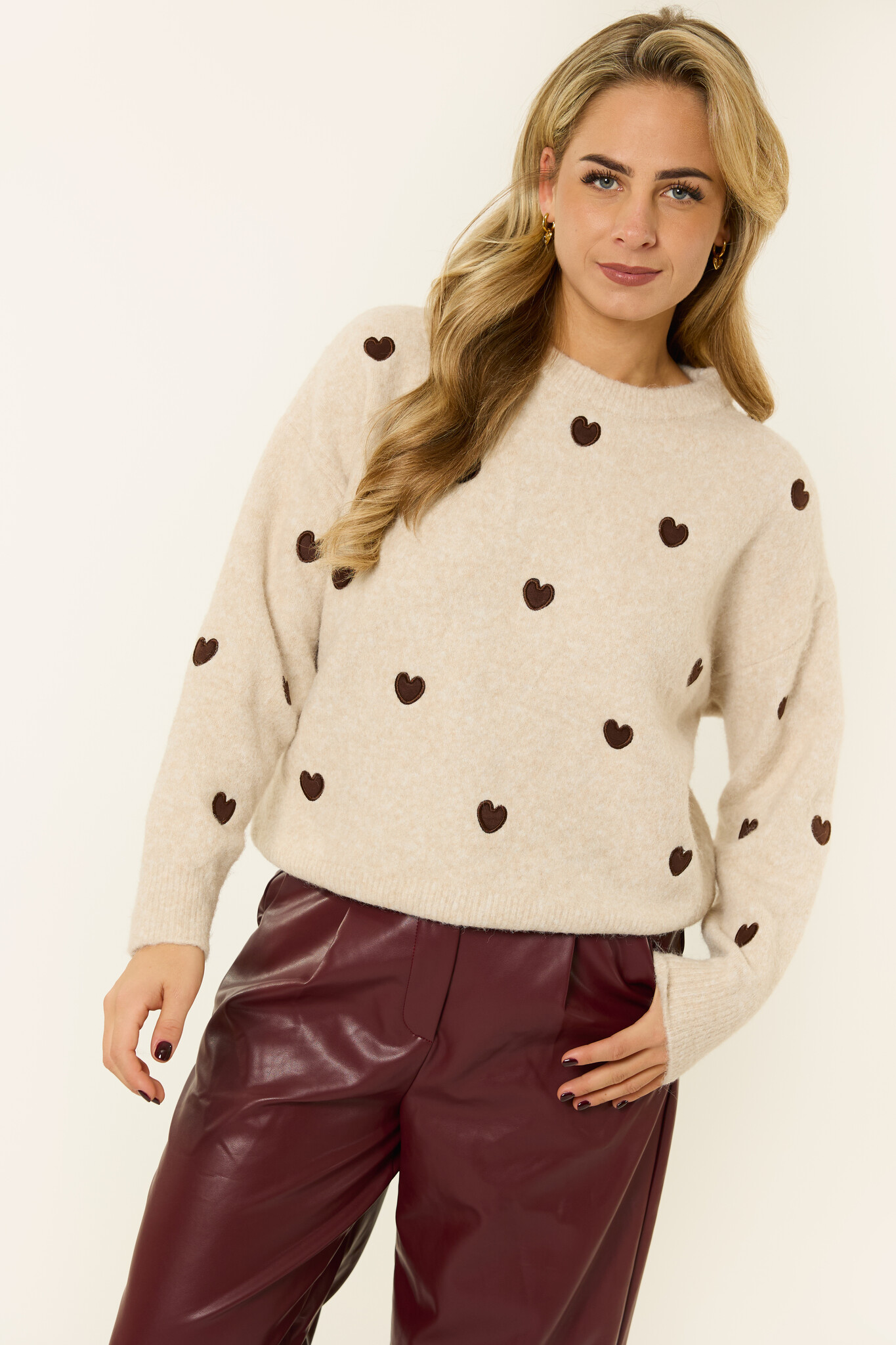 Deze beige trui met hartjes is cute en comfy tegelijk! De zachte stof voelt heerlijk warm aan en de all-over hart details geven de trui een leuke uitstraling! Perfect om casual te combineren met een jeans of girly met een rokje of skort!