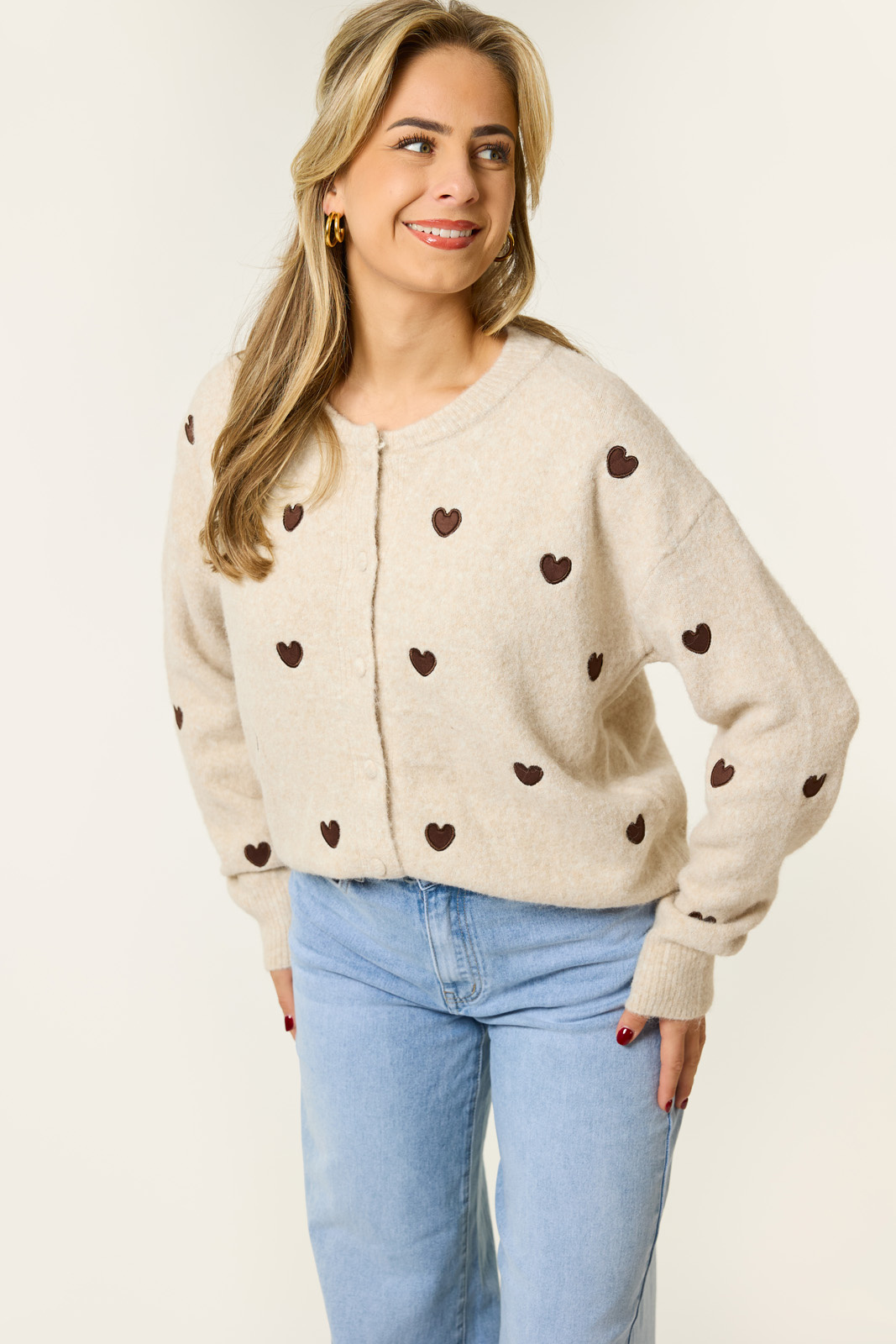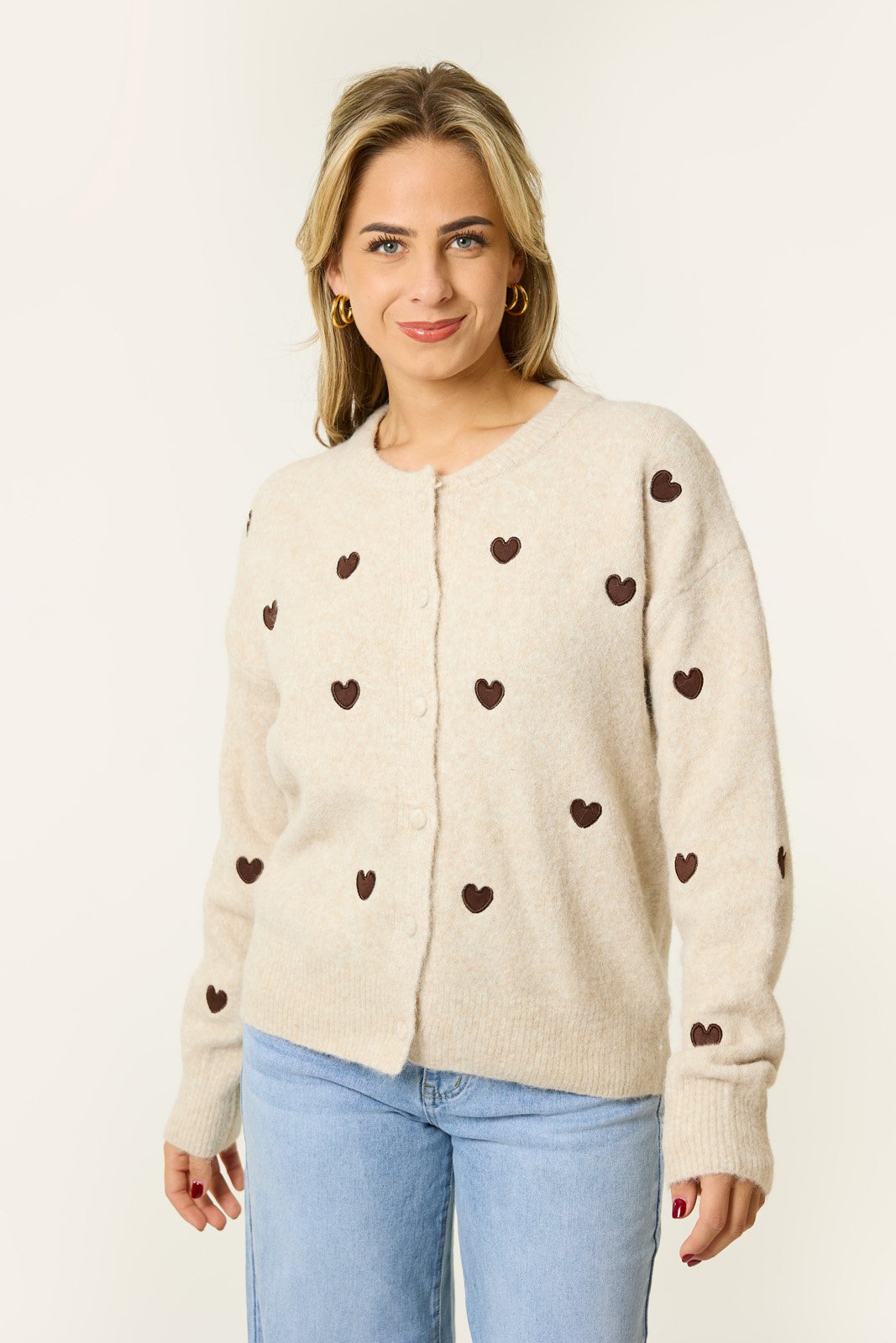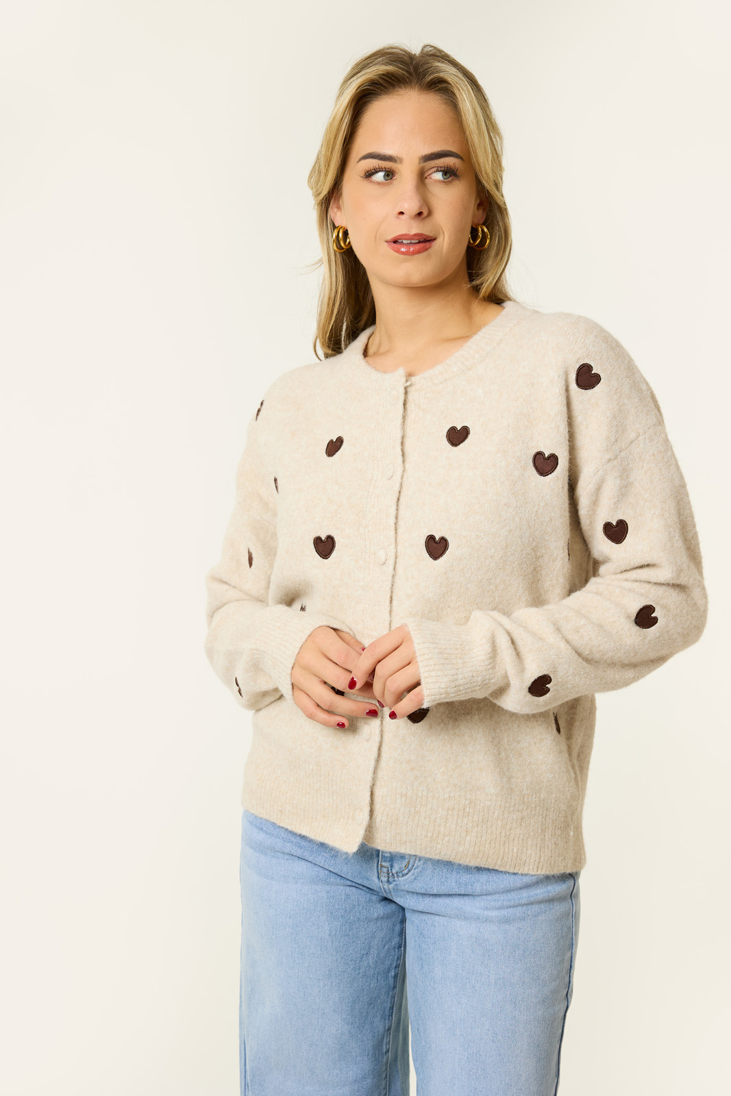 Dit beige vest met hartjes is een echte musthave voor je herfst- en wintergarderobe. De zachte stof voelt heerlijk warm aan en de all-over hartdetails geven het vest een leuke, feminine touch. Dankzij de knoopsluiting draag je het vest makkelijk open over een top of dicht als trui. Perfect om casual te combineren met een jeans of om je outfit net dat beetje extra te geven.