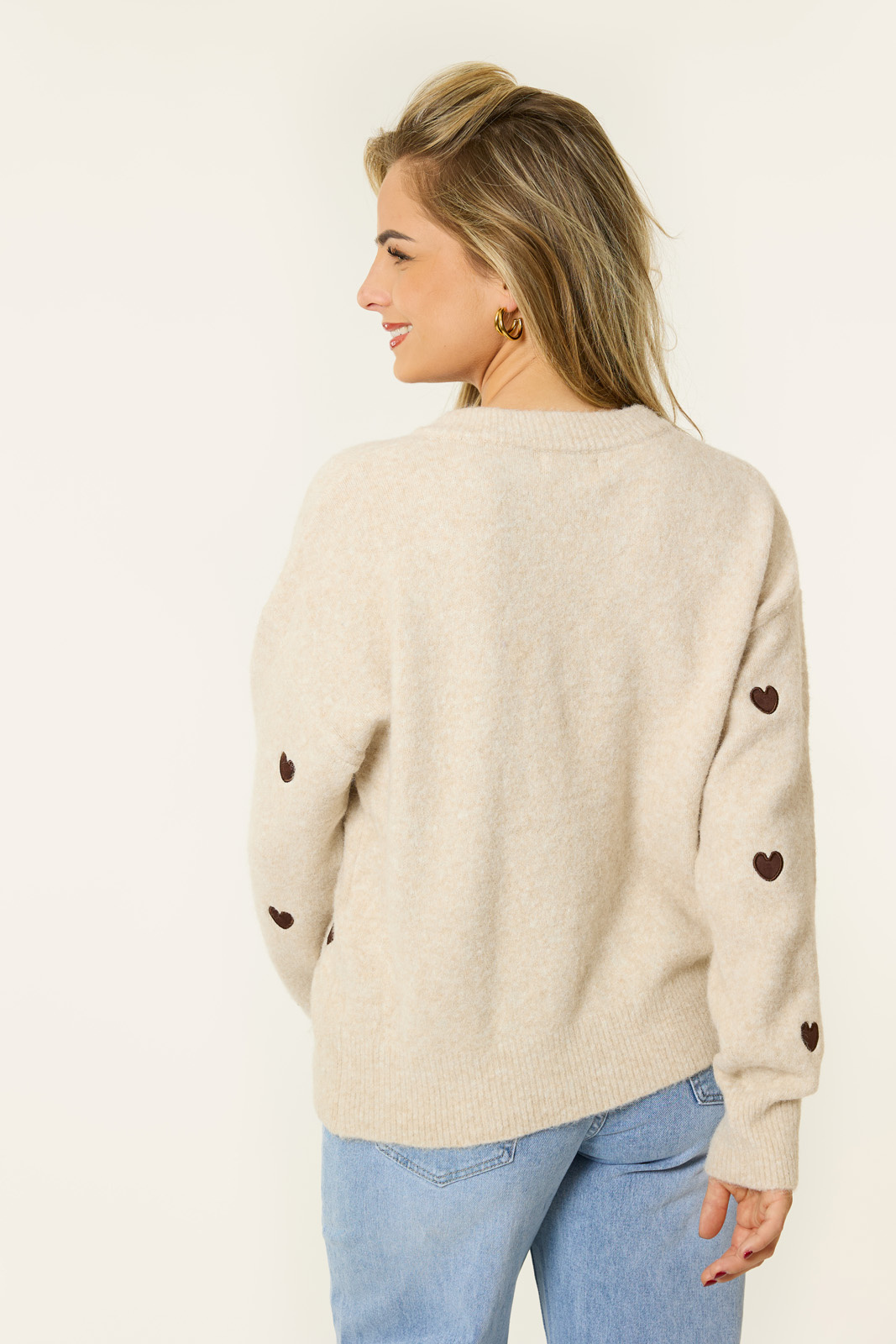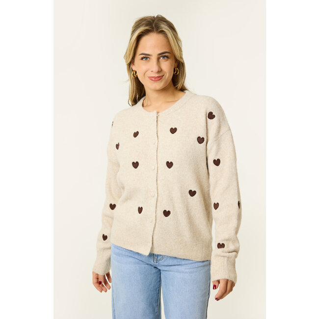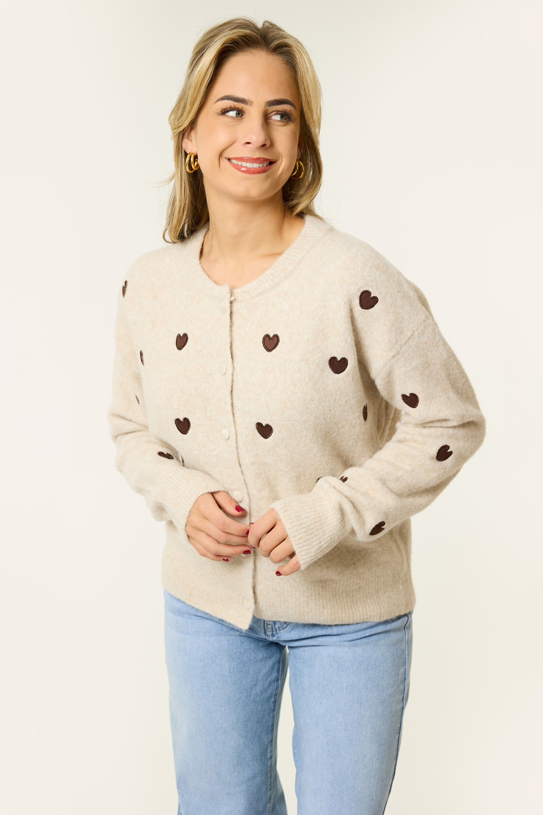 Dit beige vest met hartjes is een echte musthave voor je herfst- en wintergarderobe. De zachte stof voelt heerlijk warm aan en de all-over hartdetails geven het vest een leuke, feminine touch. Dankzij de knoopsluiting draag je het vest makkelijk open over een top of dicht als trui. Perfect om casual te combineren met een jeans of om je outfit net dat beetje extra te geven.