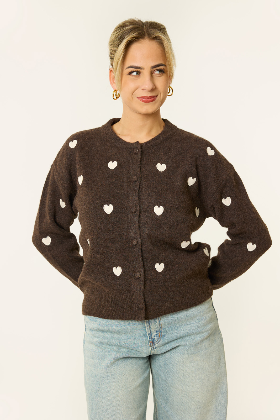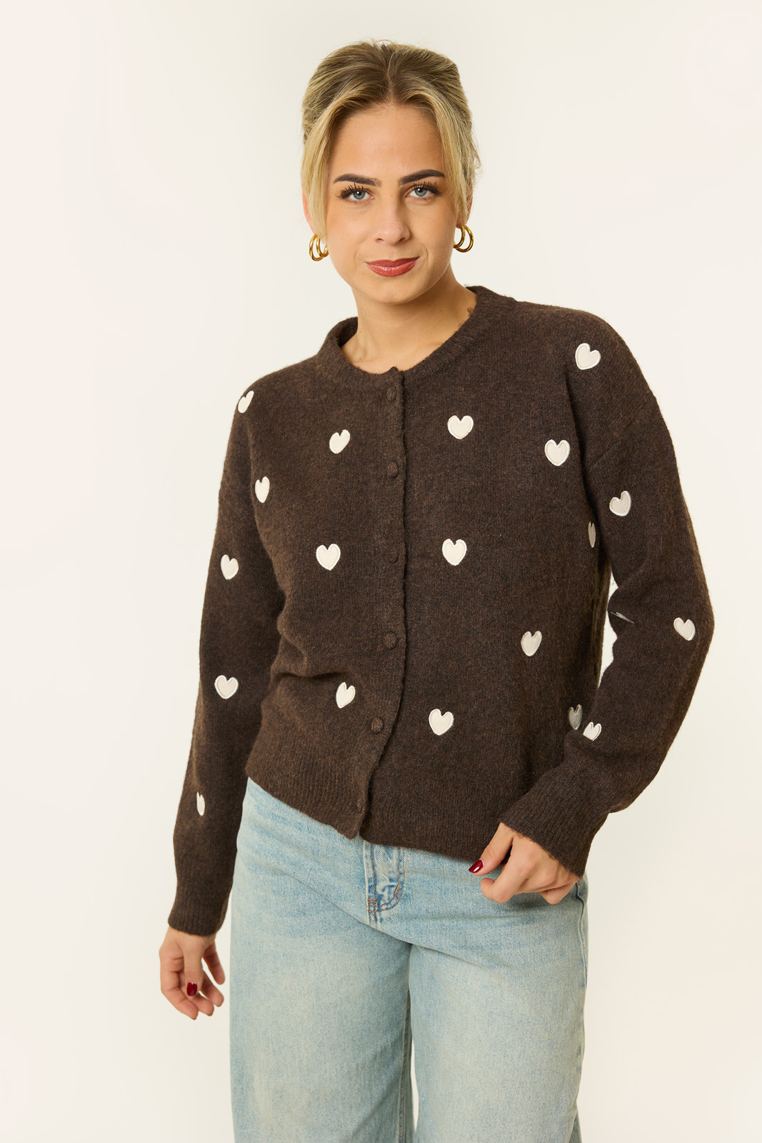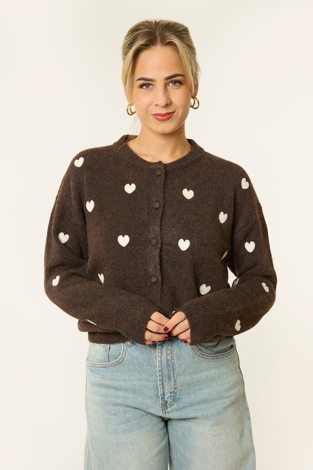Deze bruine cardigan met hartjes is jouw nieuwe musthave voor het najaar. Het zachte en warme vest maakt het ideaal voor frisse herfstdagen, terwijl de geborduurde strikjes een vrouwelijke touch geven. De relaxte pasvorm zorgt ervoor dat je deze cardigan makkelijk kunt combineren: draag hem dichtgeknoopt als trui of open over een basic top. Perfect te stylen met jeans of pantalon voor een herfst look. Een bruine cardigan dames die je gegarandeerd vaak uit de kast pakt dit seizoen!