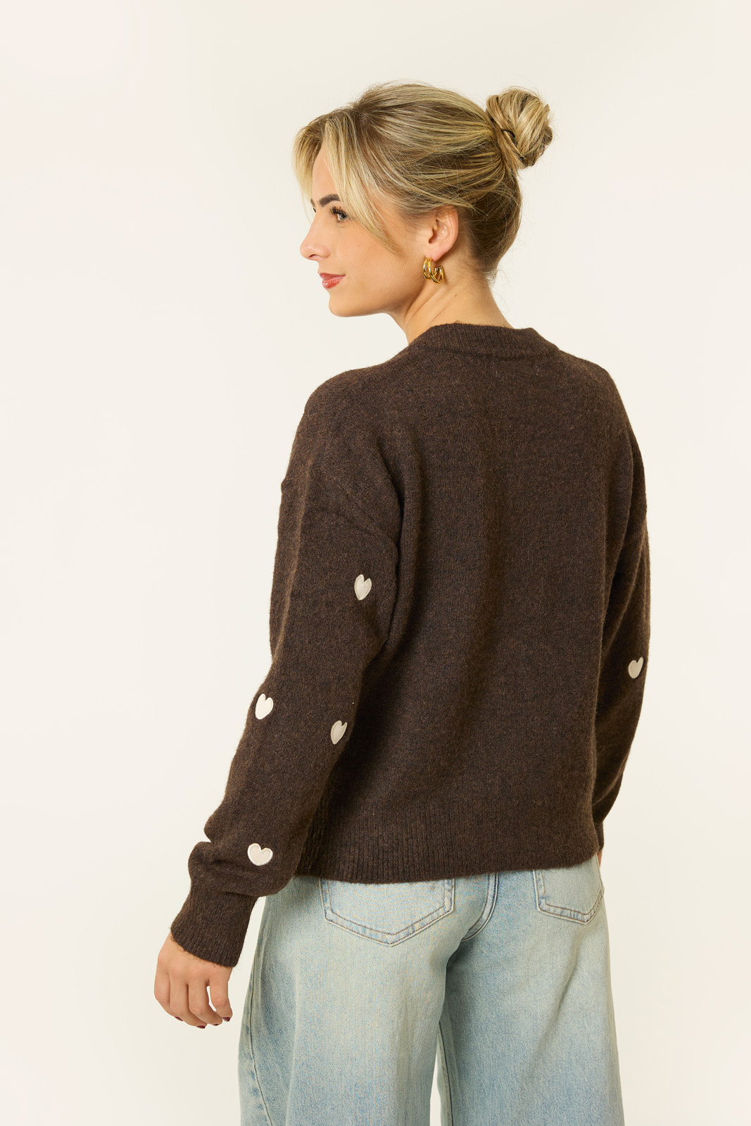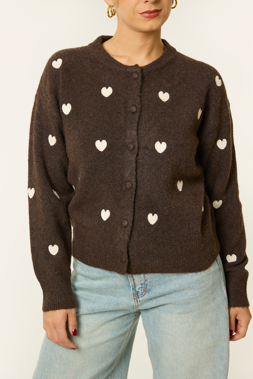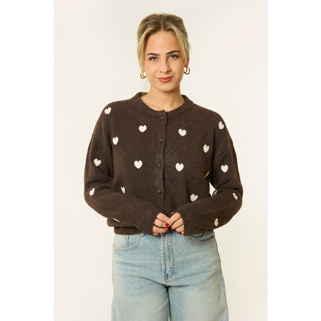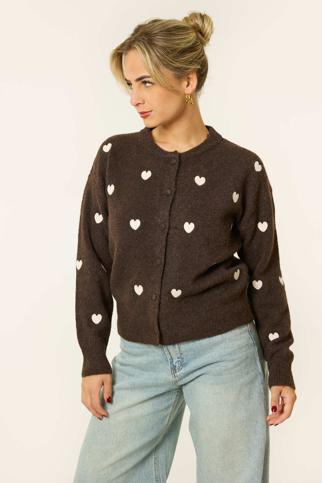 Deze bruine cardigan met hartjes is jouw nieuwe musthave voor het najaar. Het zachte en warme vest maakt het ideaal voor frisse herfstdagen, terwijl de geborduurde strikjes een vrouwelijke touch geven. De relaxte pasvorm zorgt ervoor dat je deze cardigan makkelijk kunt combineren: draag hem dichtgeknoopt als trui of open over een basic top. Perfect te stylen met jeans of pantalon voor een herfst look. Een bruine cardigan dames die je gegarandeerd vaak uit de kast pakt dit seizoen!