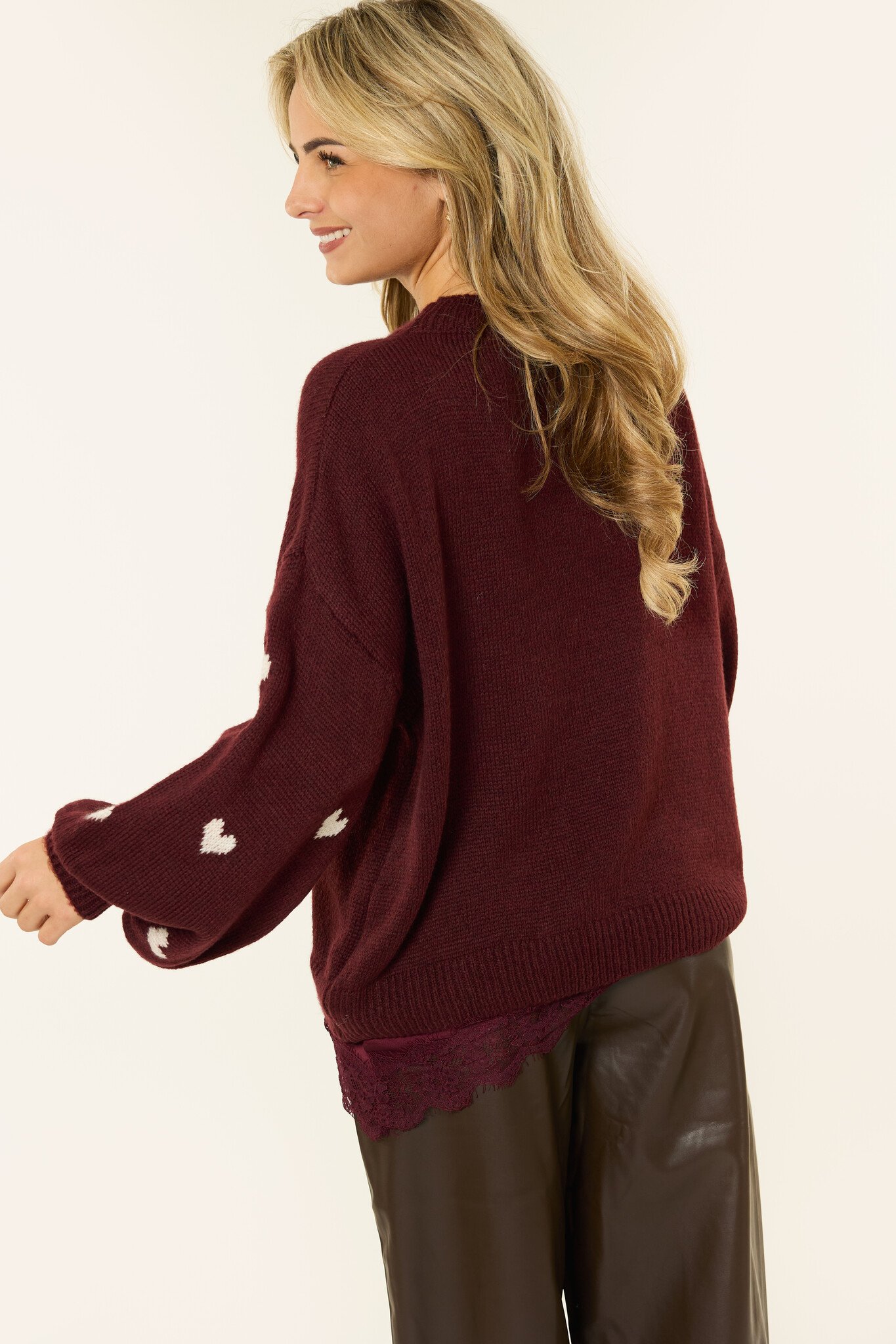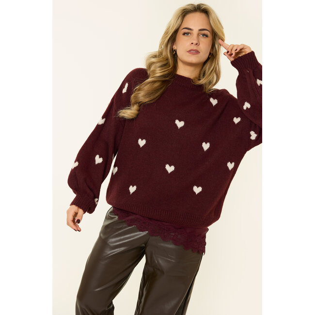 Deze burgundy trui met hartjes is een echte musthave voor je herfst- en wintergarderobe. De zachte stof voelt heerlijk warm aan en de all-over hart details geven de trui een leuke, feminine touch. Perfect om casual te combineren met een jeans of om je outfit net dat beetje extra te geven.