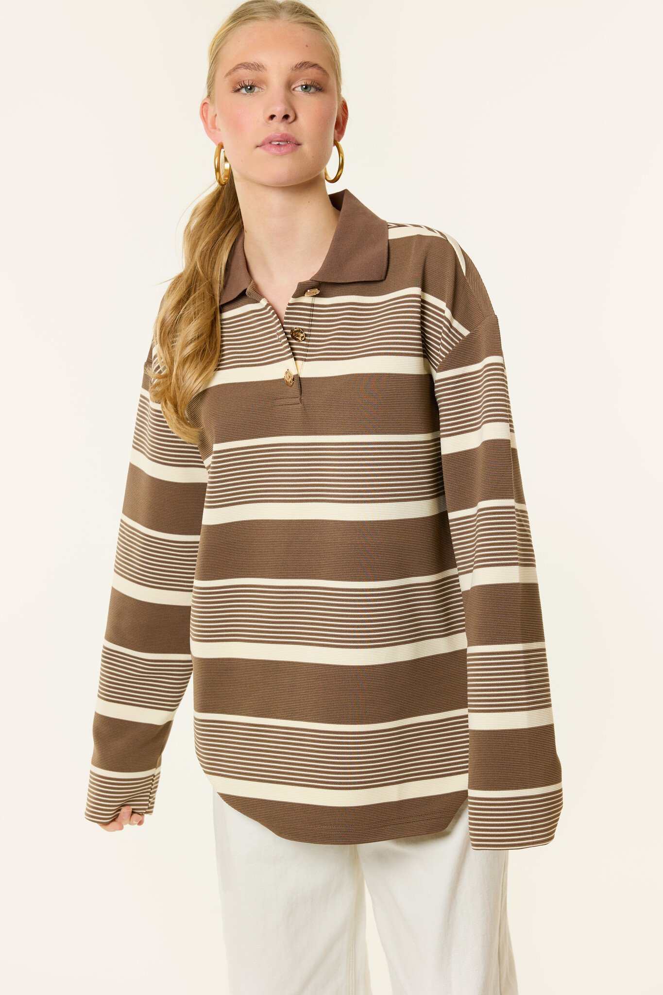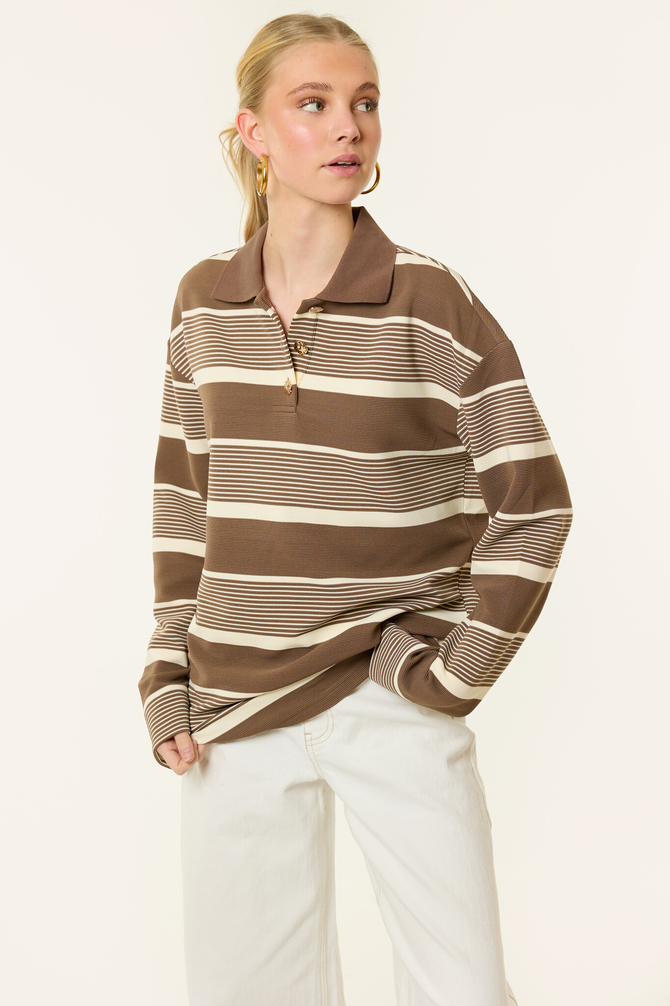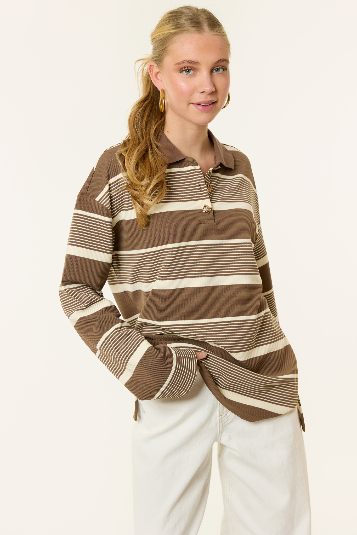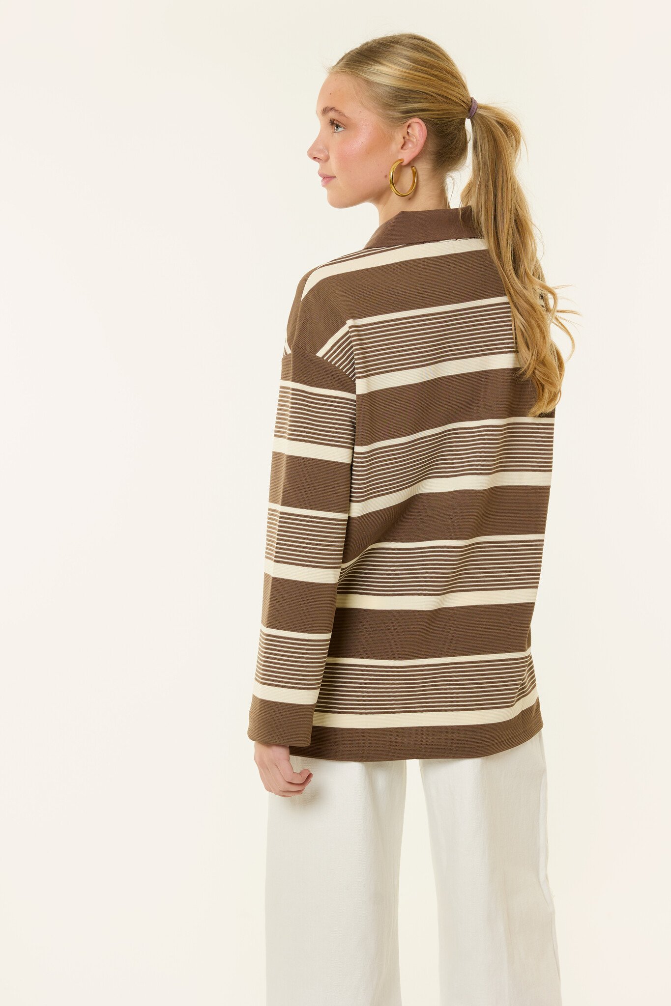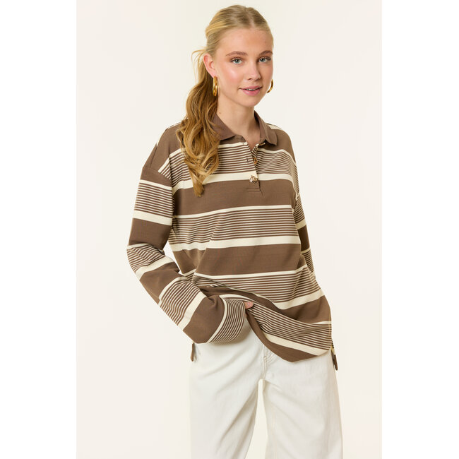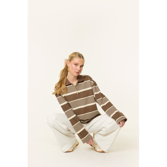 Deze Merlin gestreepte longsleeve in bruin/beige is zo’n item dat je elke week opnieuw aantrekt. Het trendy streeppatroon en de warme tinten maken deze dames longsleeve perfect voor een moderne, effortless look. De stof voelt zacht aan en zit heerlijk comfortabel.