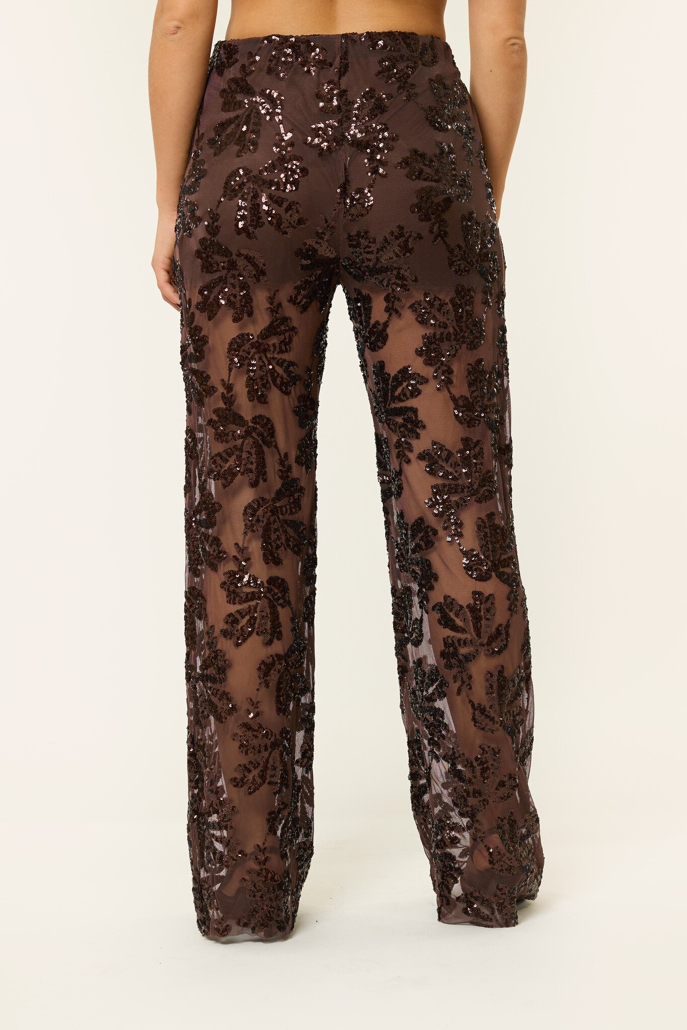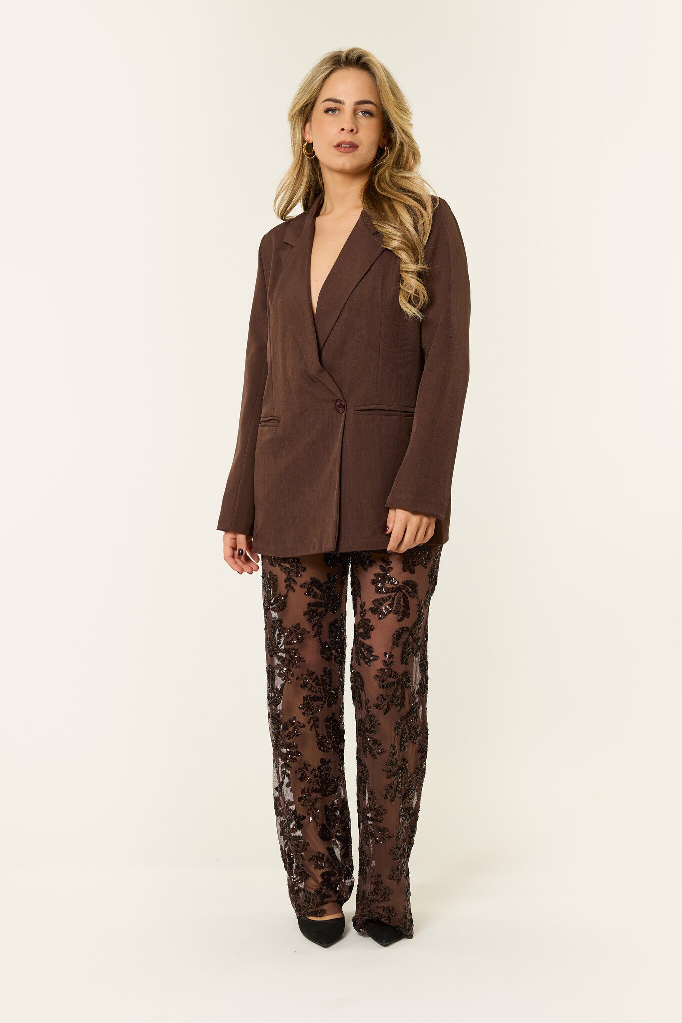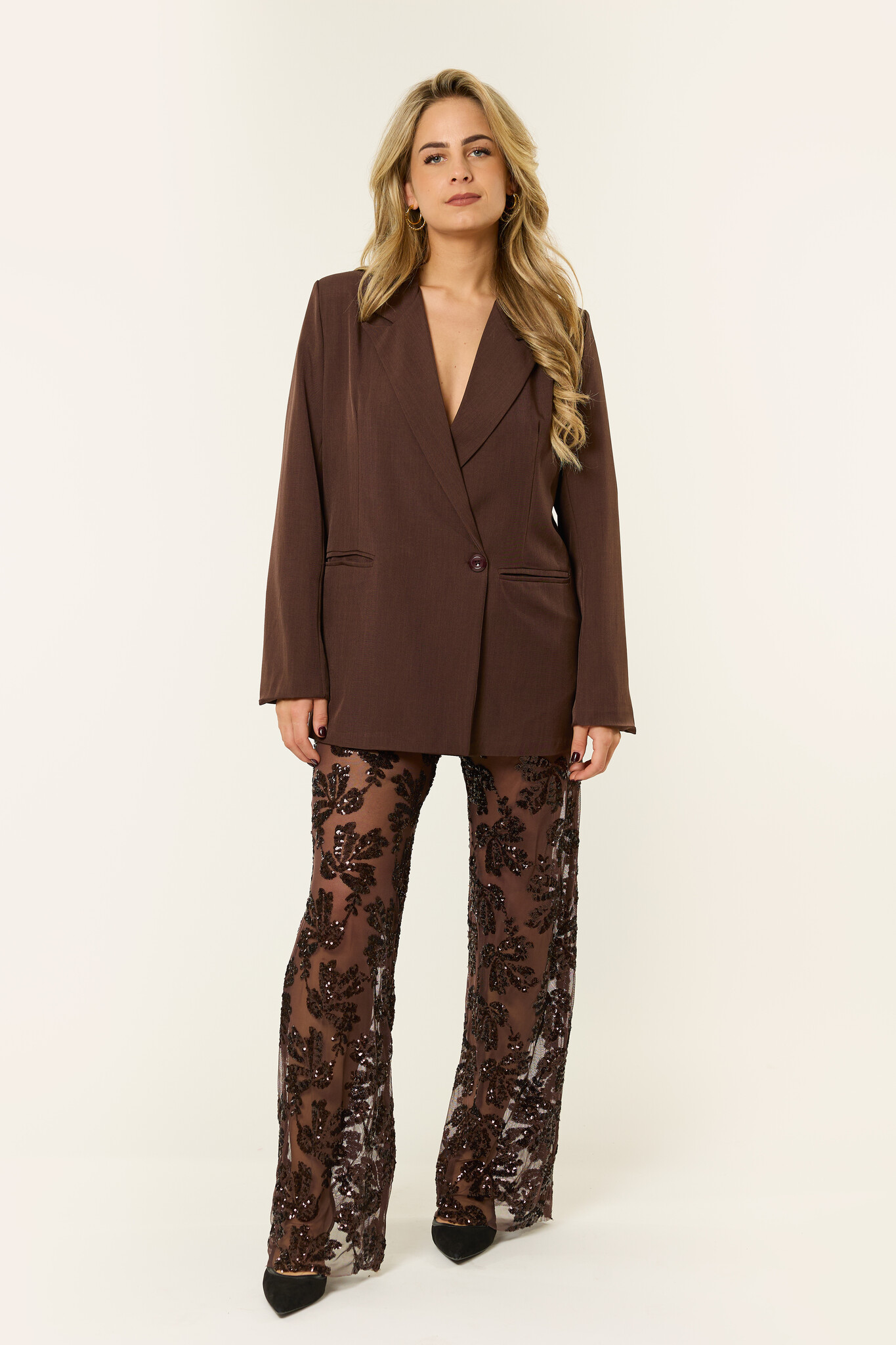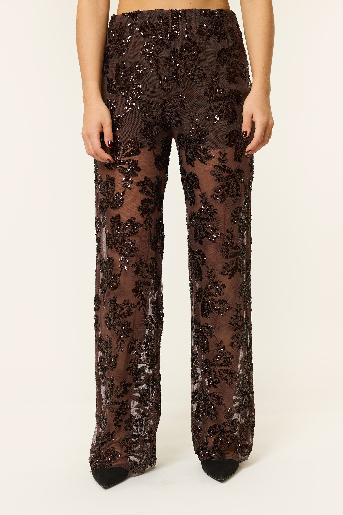 Deze bruine mesh sequin pantalon is zo’n item dat meteen sfeer geeft aan je outfit. De broek is gemaakt van transparante mesh en volledig versierd met donkere pailletten in een mooie bloemvorm, waardoor hij luxe én speels oogt. Dankzij de elastieke tailleband zit de broek super comfortabel en vallen de rechte pijpen mooi langs je benen. Perfect voor een feest, diner of avondje uit, combineer de wide leg simpel met een top of satijnen blouse en je look is meteen helemaal party-proof.