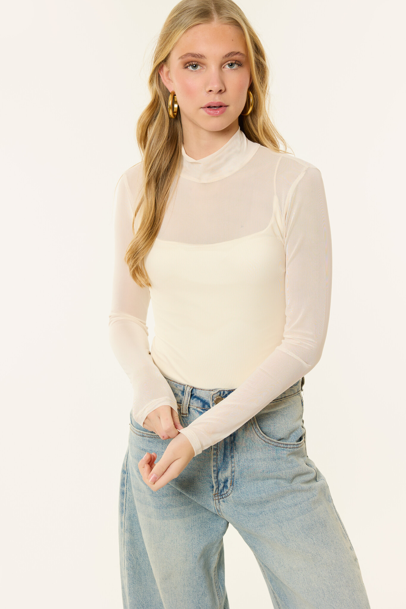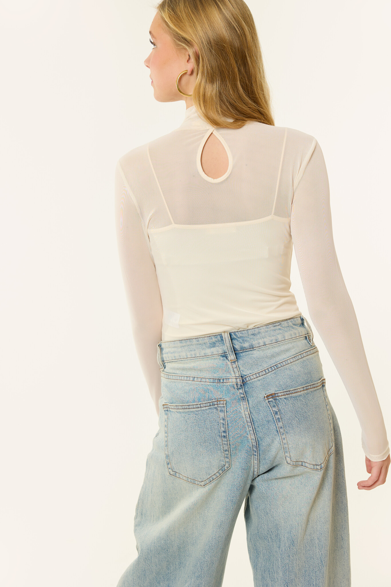 Deze beige mesh body is een item dat je eindeloos kunt combineren. De fijne mesh stof geeft de body een subtiele, vrouwelijke uitstraling, terwijl de dubbele voering ervoor zorgt dat hij comfortabel draagt en niet doorschijnt. De colhals en lange mouwen geven de body een stijlvolle look, en dankzij de aansluitende pasvorm zit de body mooi om het lichaam.
