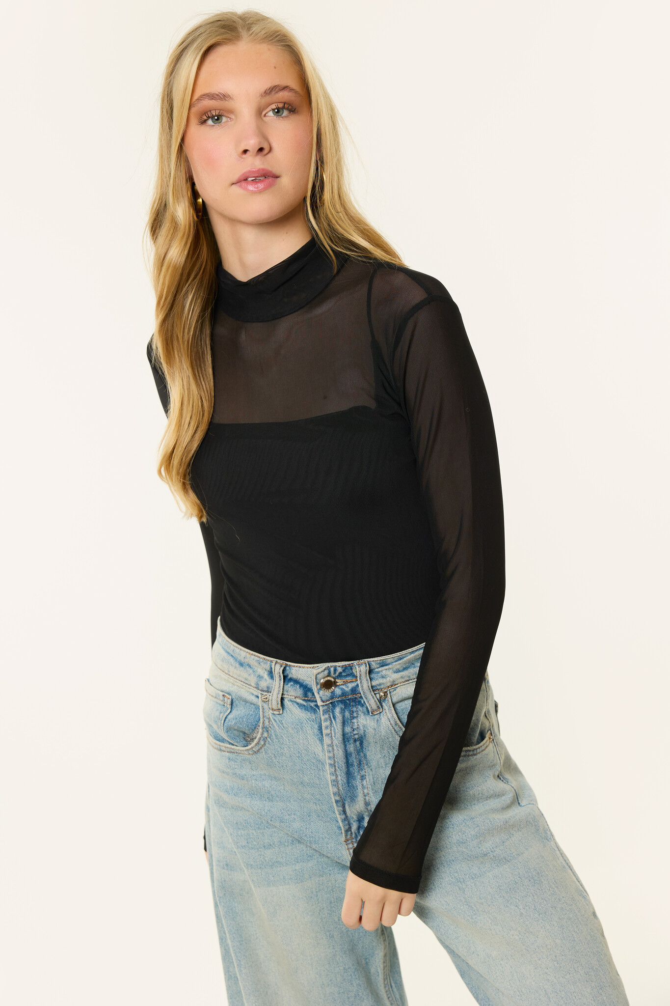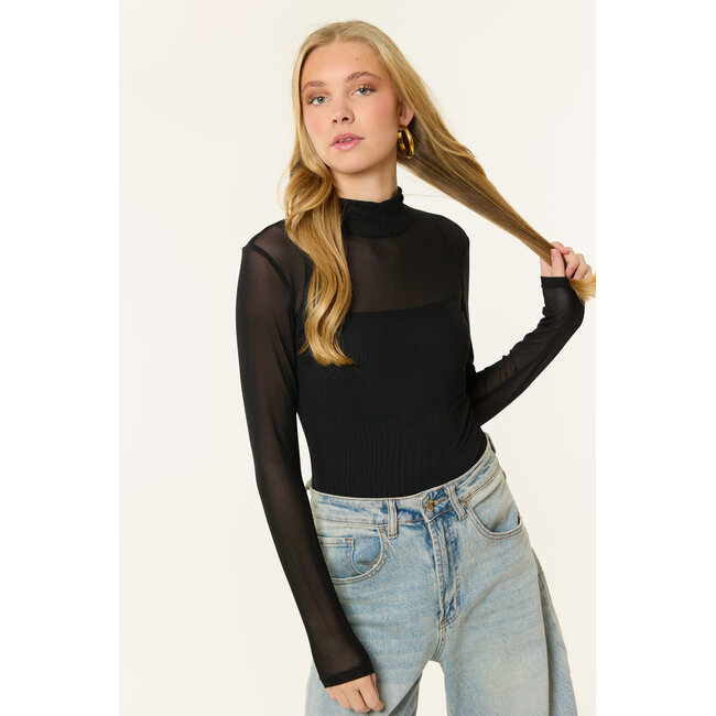 Deze zwarte mesh body is zo’n item dat je eindeloos kunt combineren. De fijne mesh stof geeft de body een subtiele, vrouwelijke uitstraling, terwijl de dubbele voering ervoor zorgt dat hij super comfy zit. De colhals en lange mouwen geven de body een stijlvolle look, en dankzij de aansluitende pasvorm zit hij mooi om het lichaam.