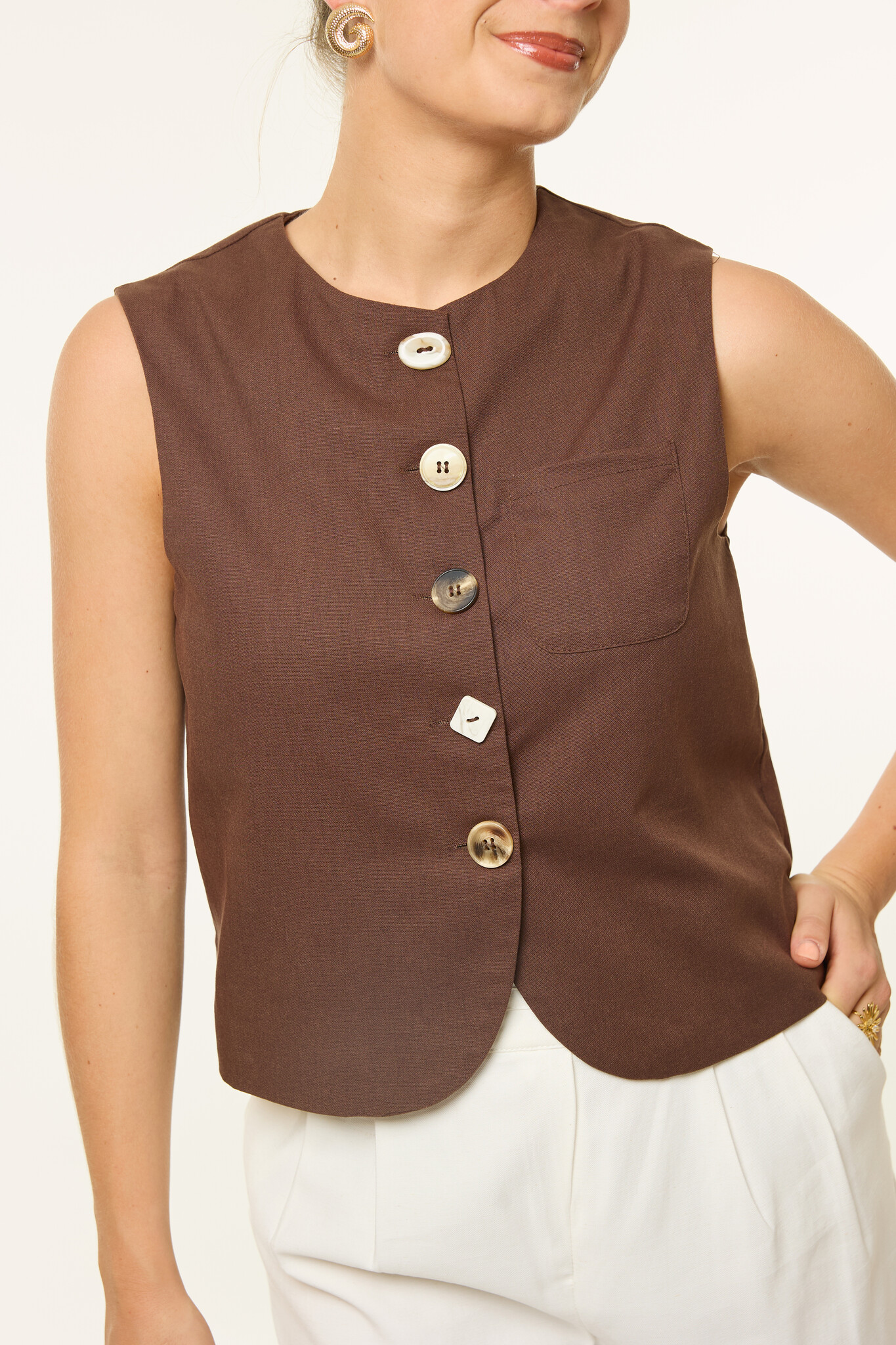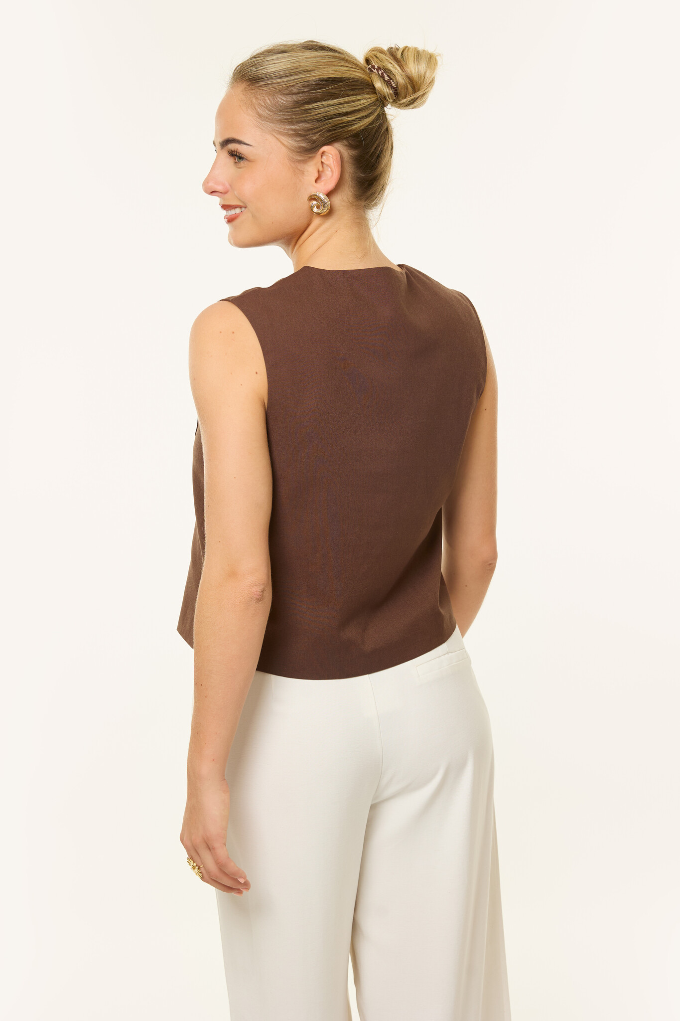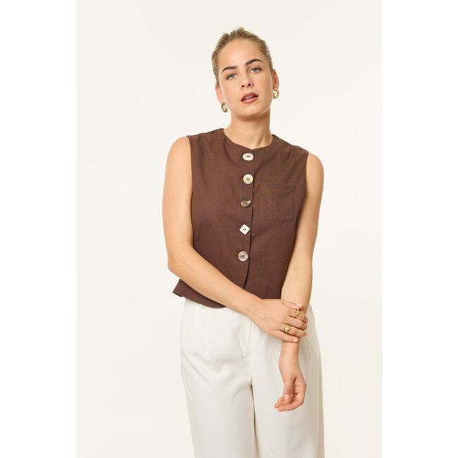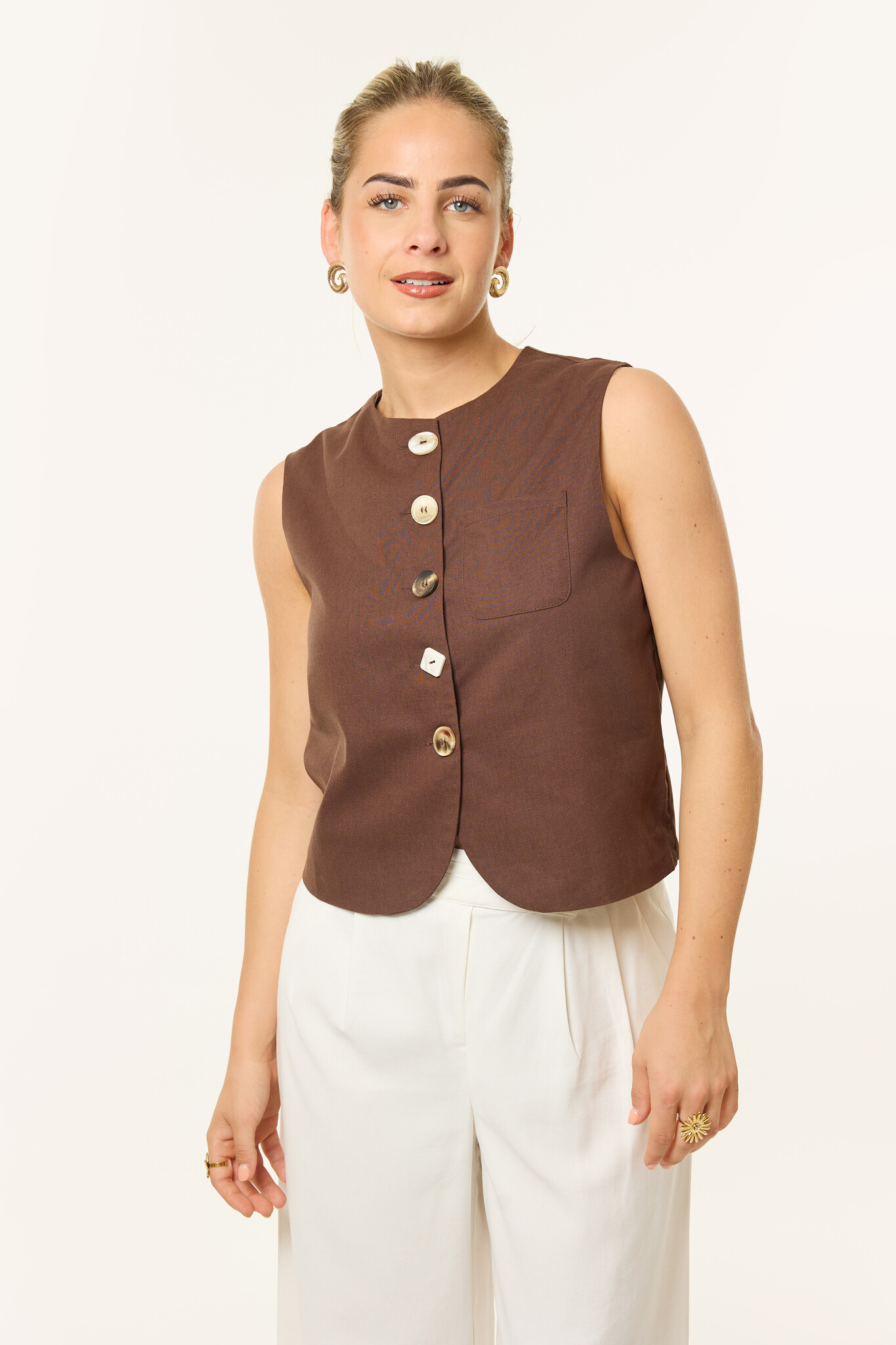 Deze bruine linnen top is dé summer essential die je niet wilt missen! De mouwloze fit en speelse knoopjes geven de top een luchtige, effortless look, perfect voor zonnige dagen. Combineer het gilet met een high-waisted broek en je bent helemaal ready to go!