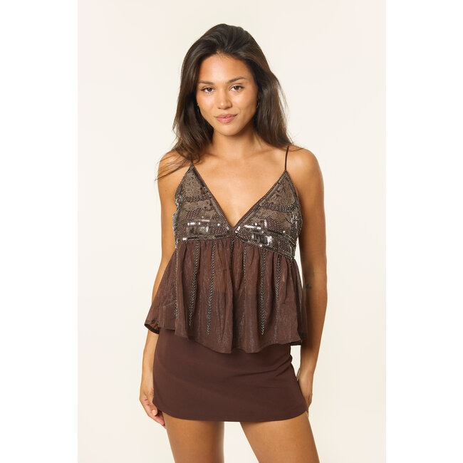 Deze bruine cami top met pailletten is alles behalve basic. De top is ideaal voor een girls night out, festivals of elk moment waarop je outfit wat extra mag hebben. Combineer de top met een rokje of jeans en je bent party ready.