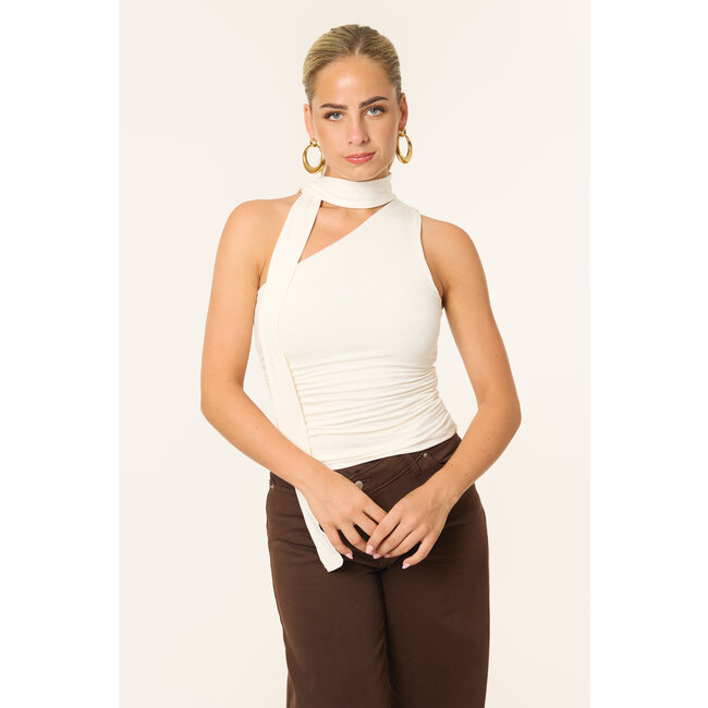 Deze witte one shoulder top is alles behalve basic. De top heeft een asymmetrische halslijn en een bijpassende sjaaltje wat de look helemaal afmaakt. Gemaakt van een soepele stof die aansluit, perfect voor een avondje uit of een diner. Combineer de top met een rok of pantalon en je hebt meteen een outfit die effortless chic oogt.